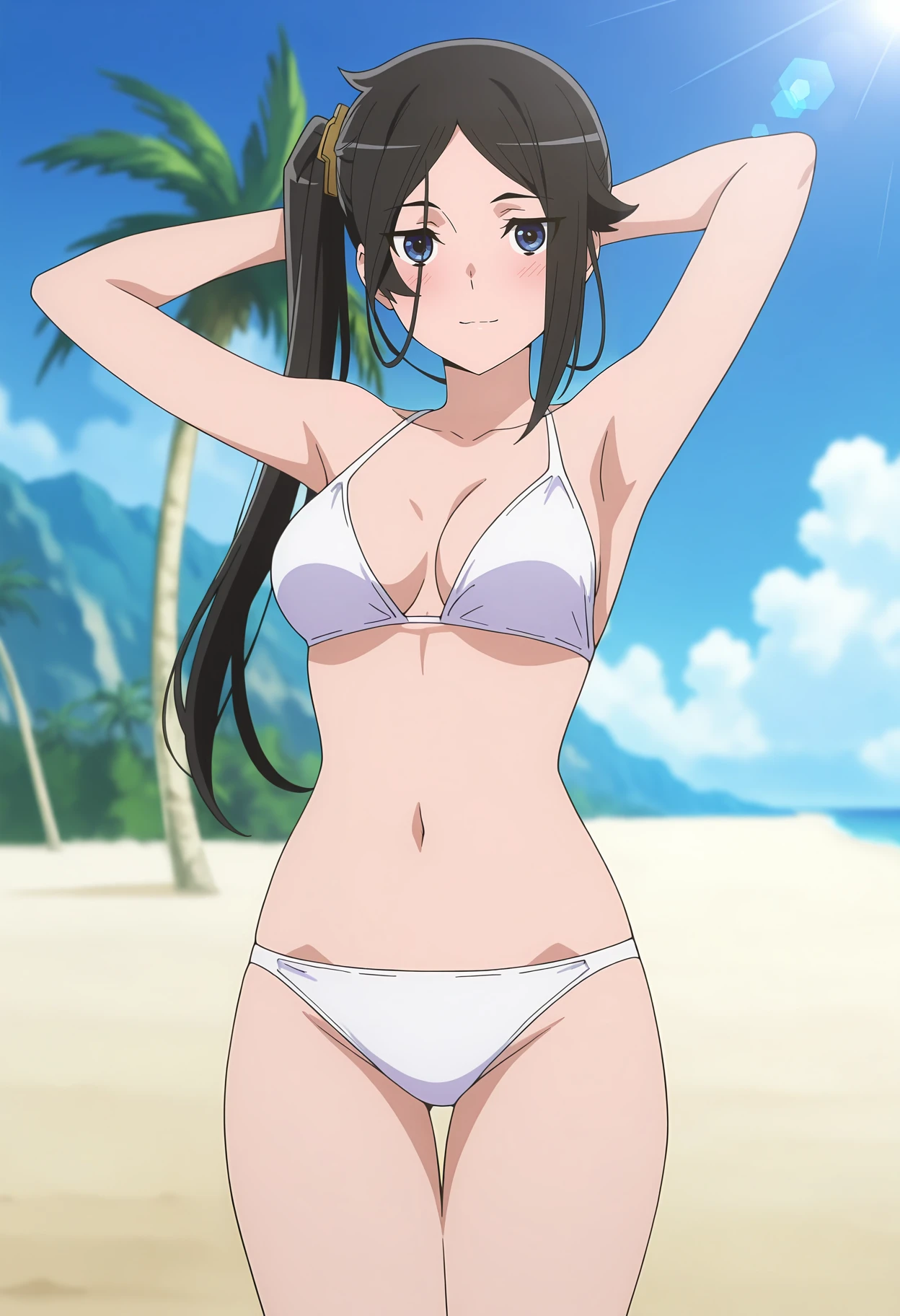 parted bangs, long hair, side ponytail, black hair, hair ornament, blue eyes