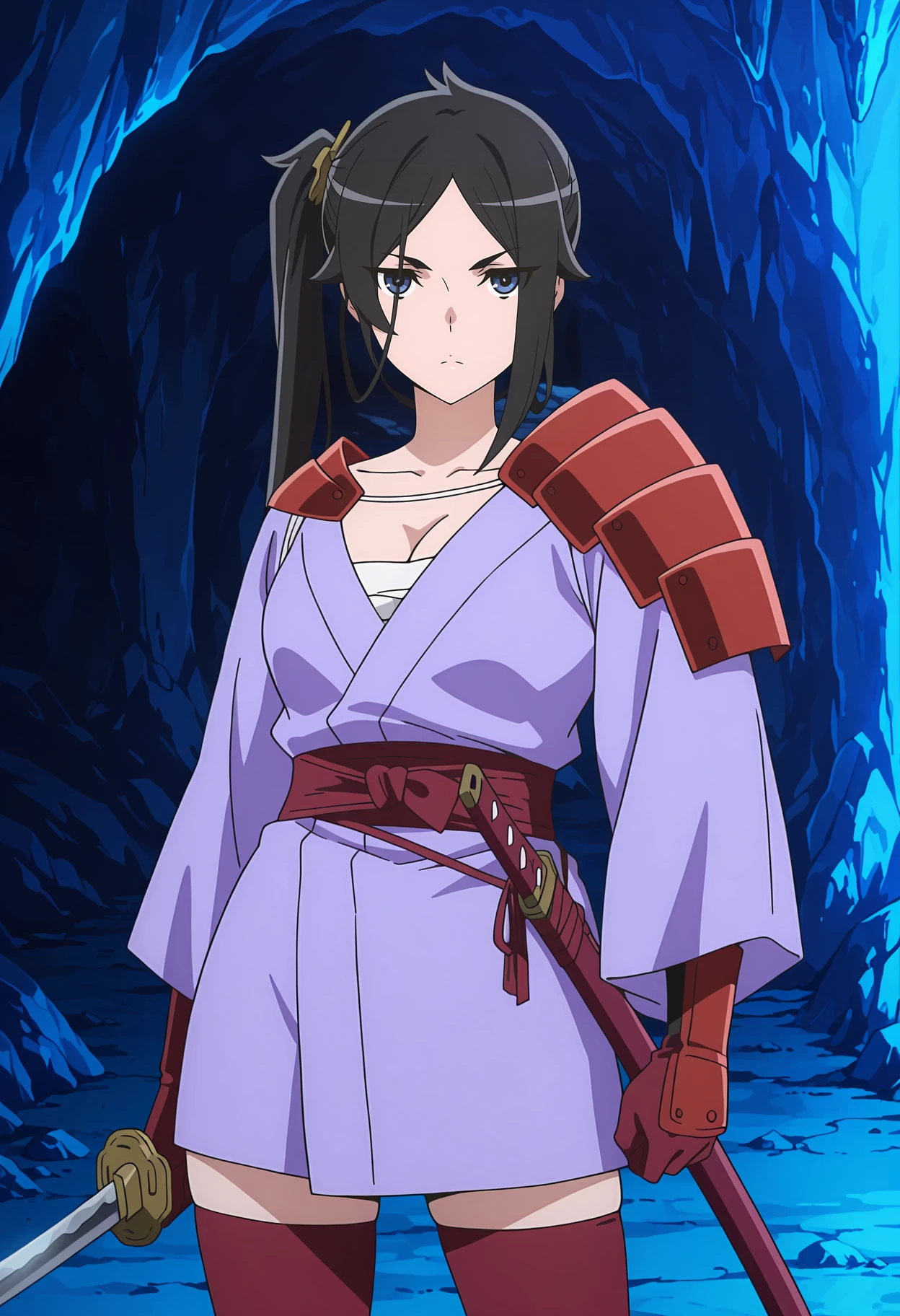 shoulder armor, purple kimono, chest sarashi, medium breasts, cleavage, long sleeves, red sash, red gloves, red thighhighs
