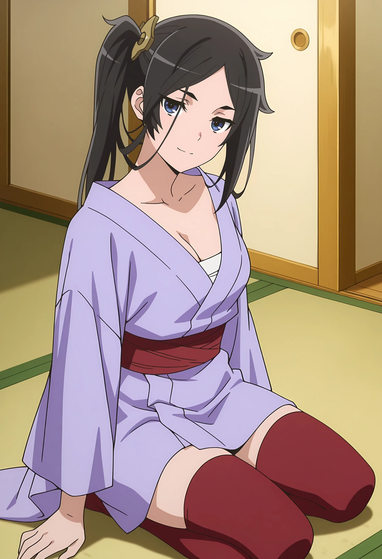 purple kimono, chest sarashi, medium breasts, cleavage, red sash, red thighhighs