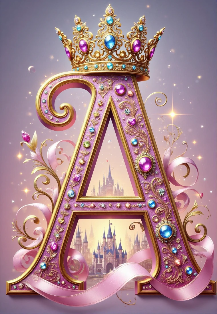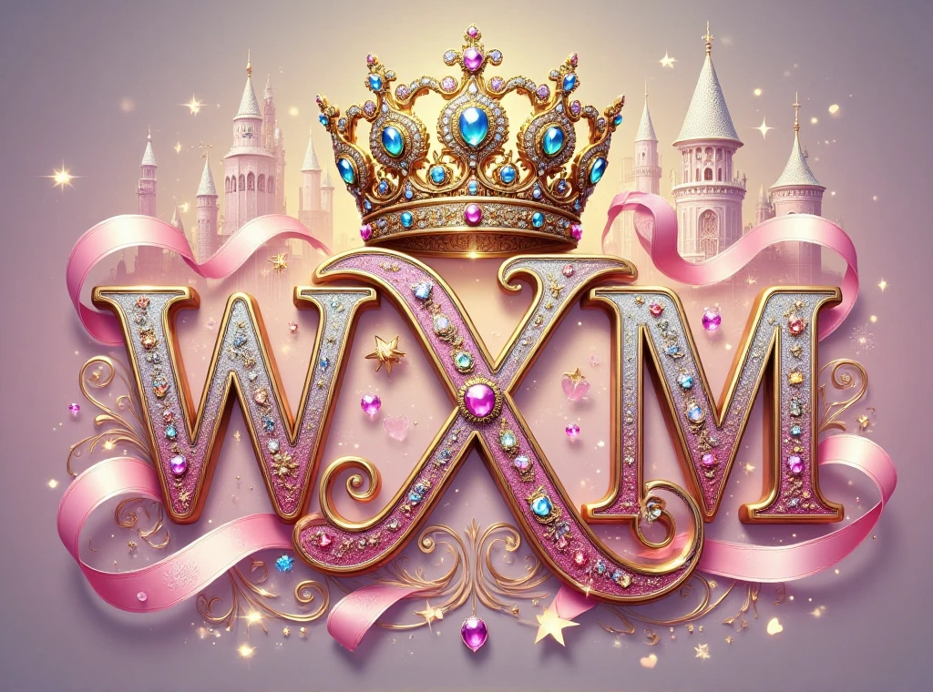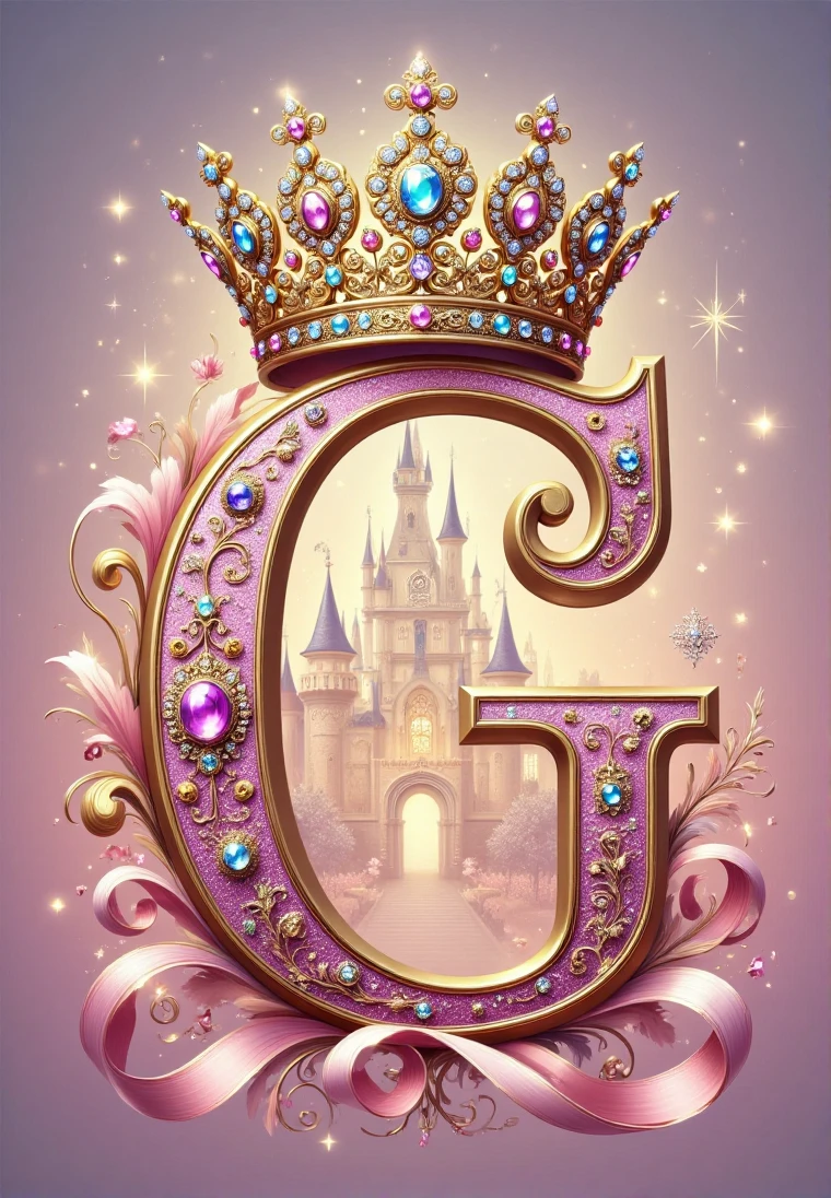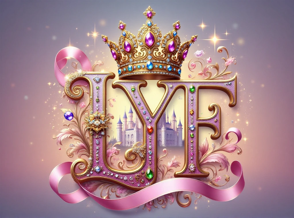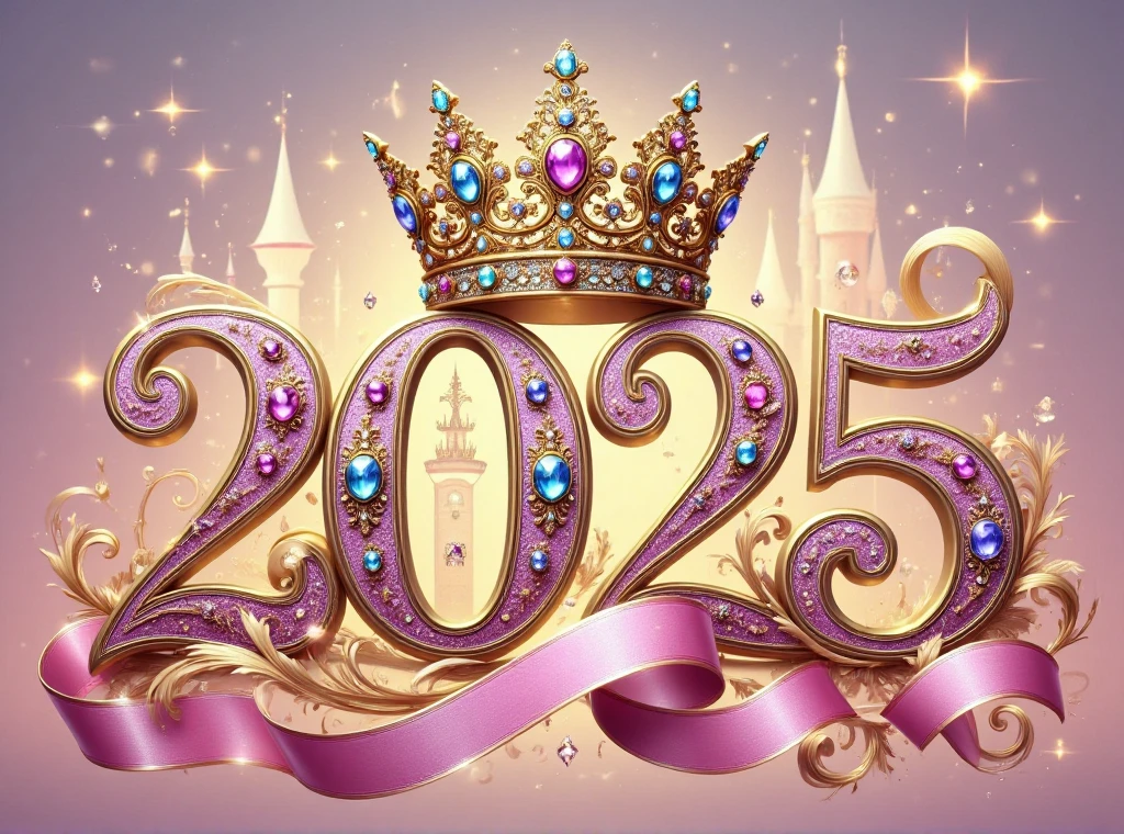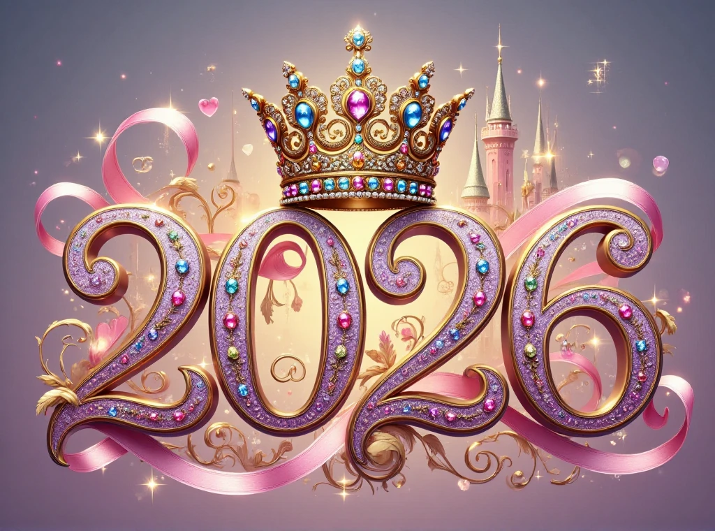 This typographic artwork is centered around the letter "2026",crowned with an elaborate crown,inlaid with colorful gemstones,paired with pink gold patterns,the background features a hazy castle intertwined with sparkling stars,creating a dreamy romantic,noble and elegant fairy-tale atmosphere,as if opening a magnificent princess adventure.,