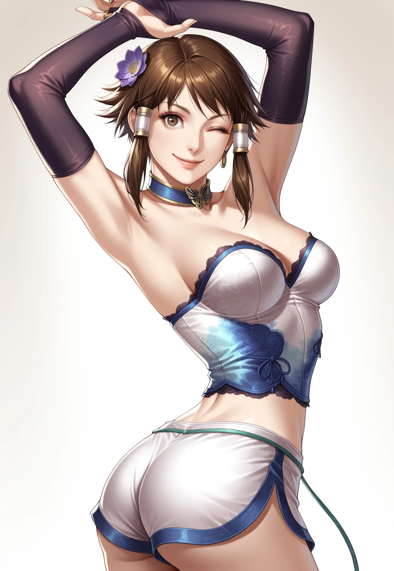 choker, pink Chinese top, detached sleeves, blue pants, anklet, shoes,