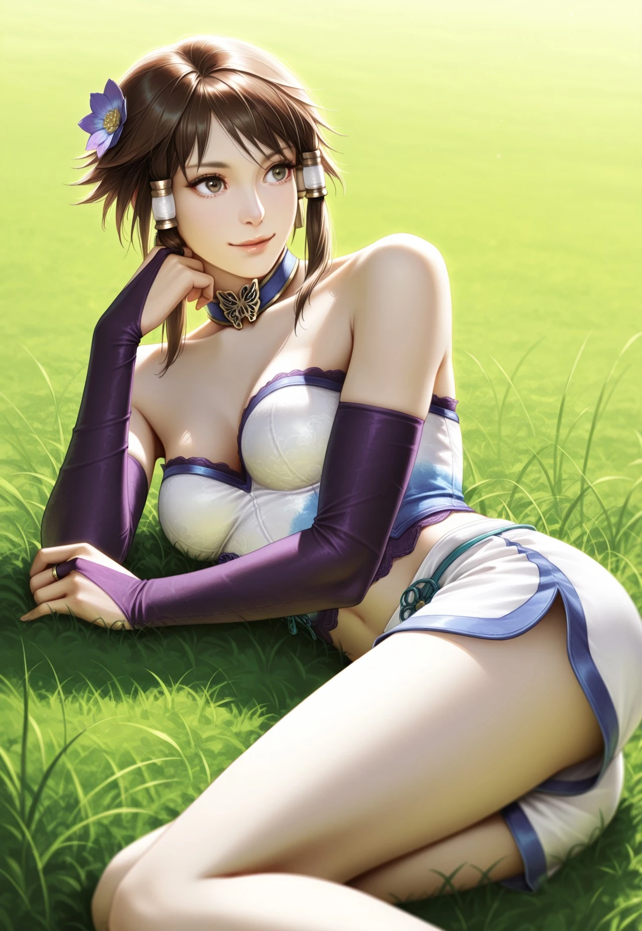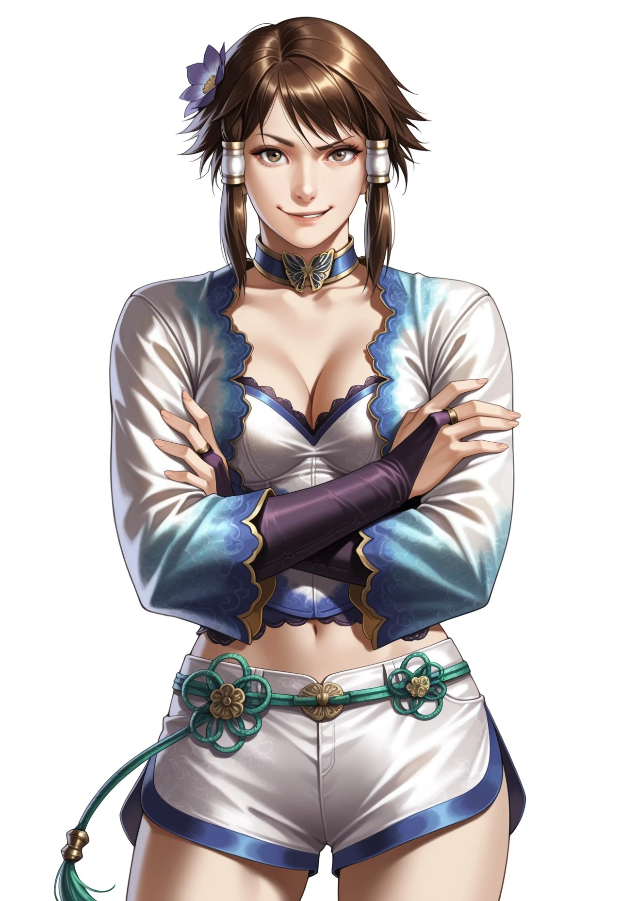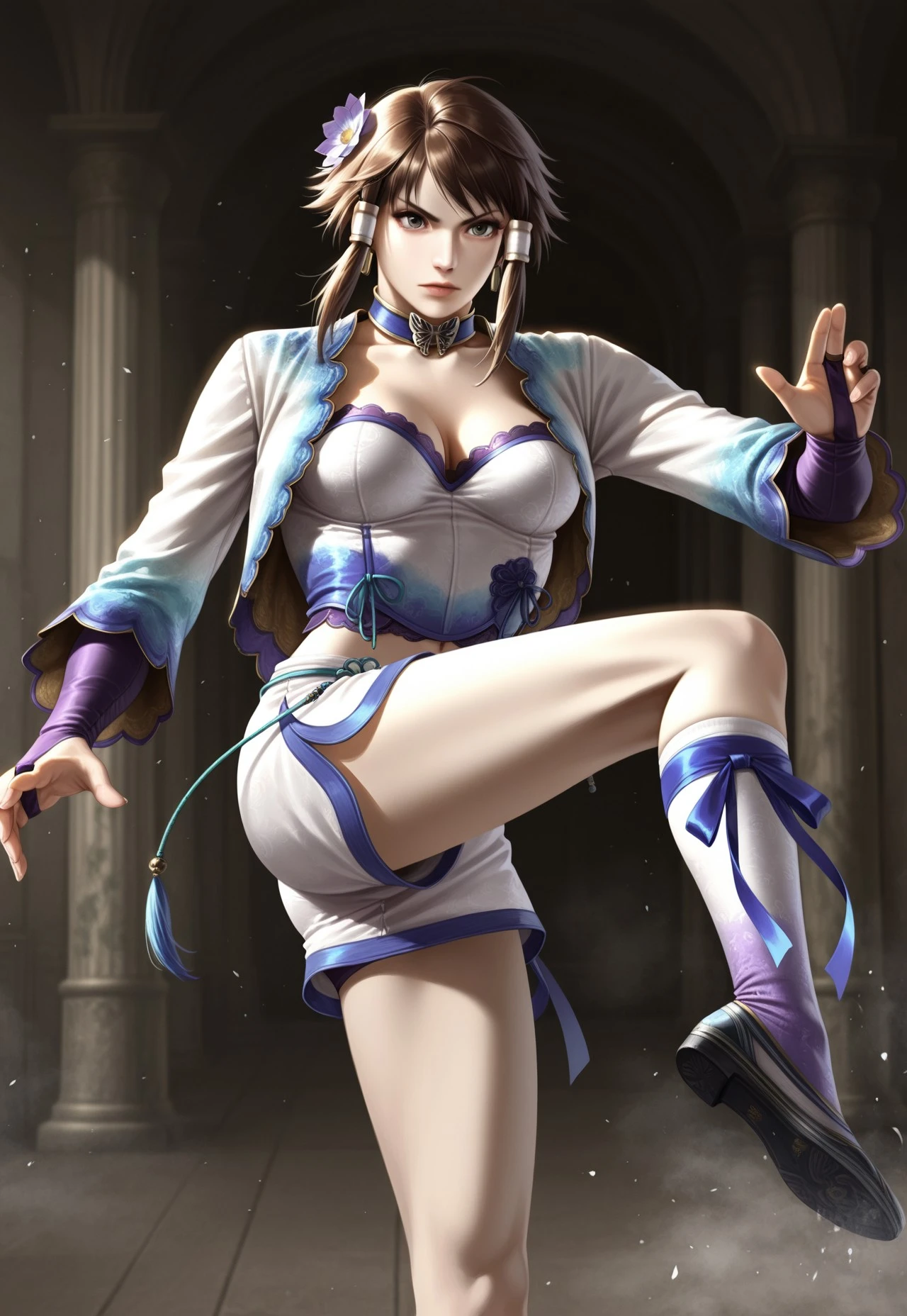 blue Chinese top, sash, ribbons, detached sleeves, tight purple pants, anklet, shoes,