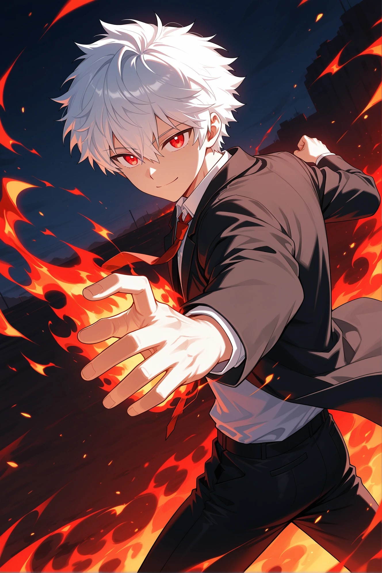 leo plov,white hair,shorts hair,bangs,hair between eyes,red eyes