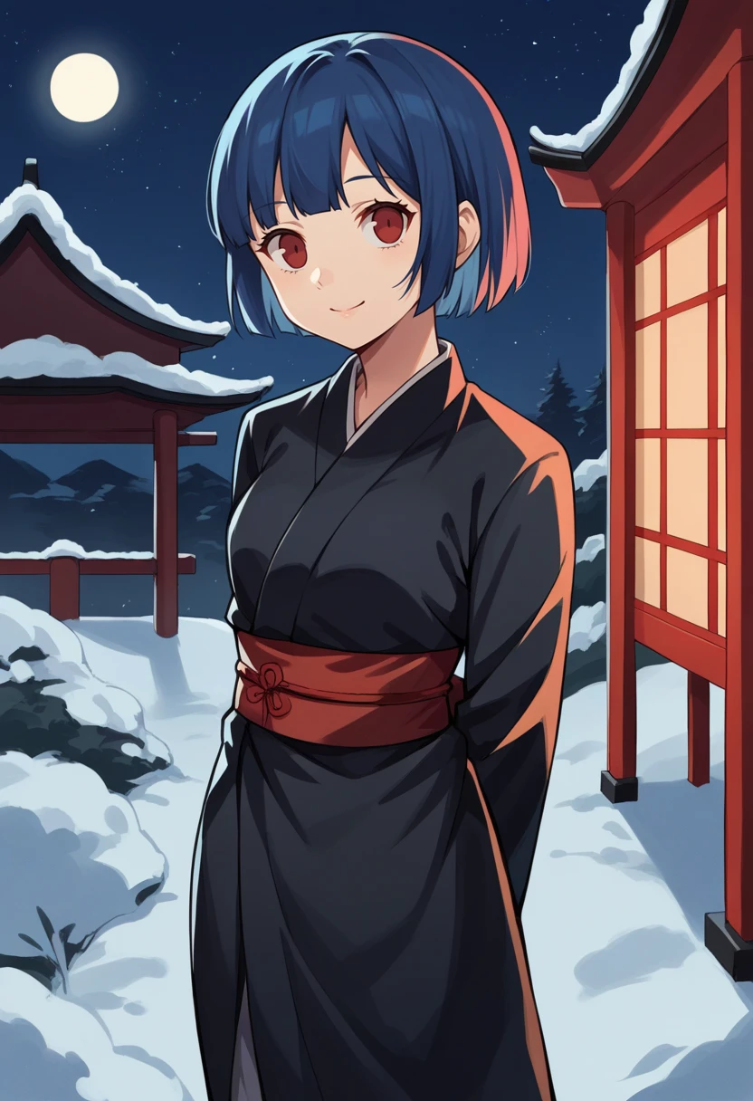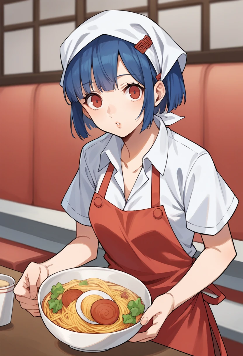 aikap4, short hair, blue hair, red eyes, head scarf, shirt, red apron