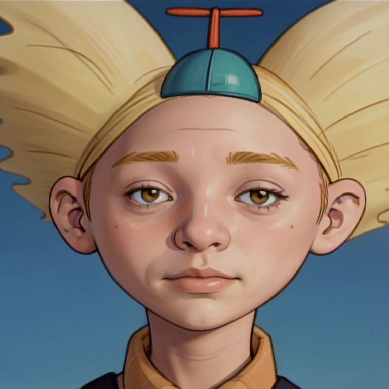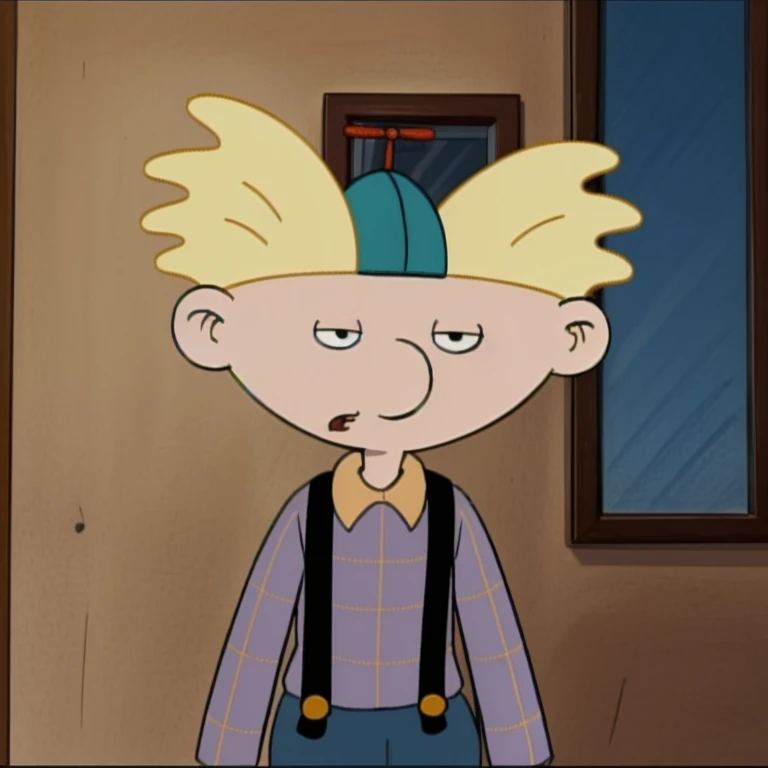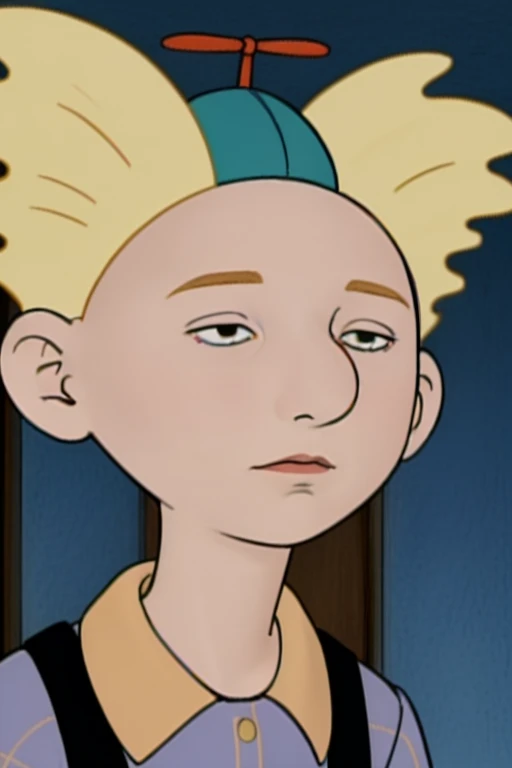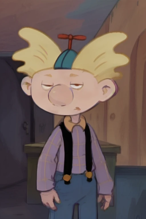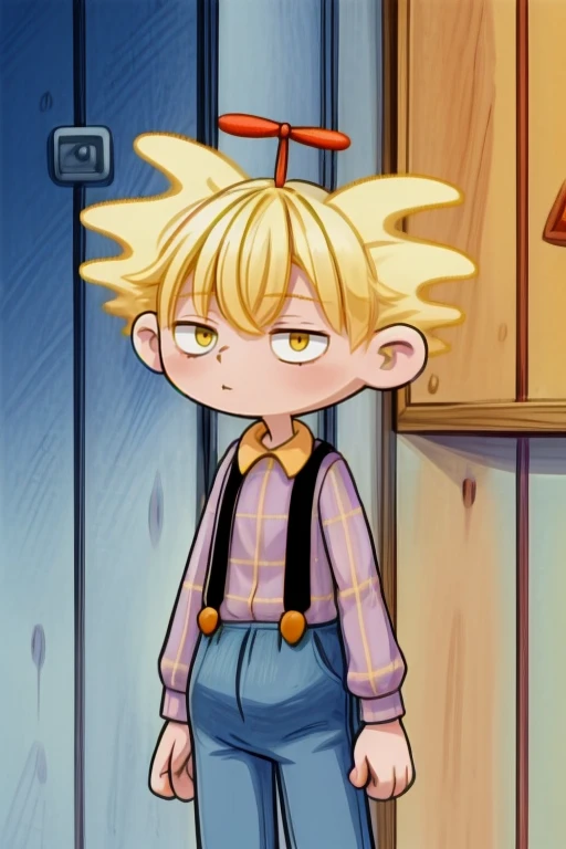 arnie_ha, yellow hair, propeller hat, pale blue shirt with yellow plaid, mouth, suspenders, dark blue slacks, socks, dark shoes,