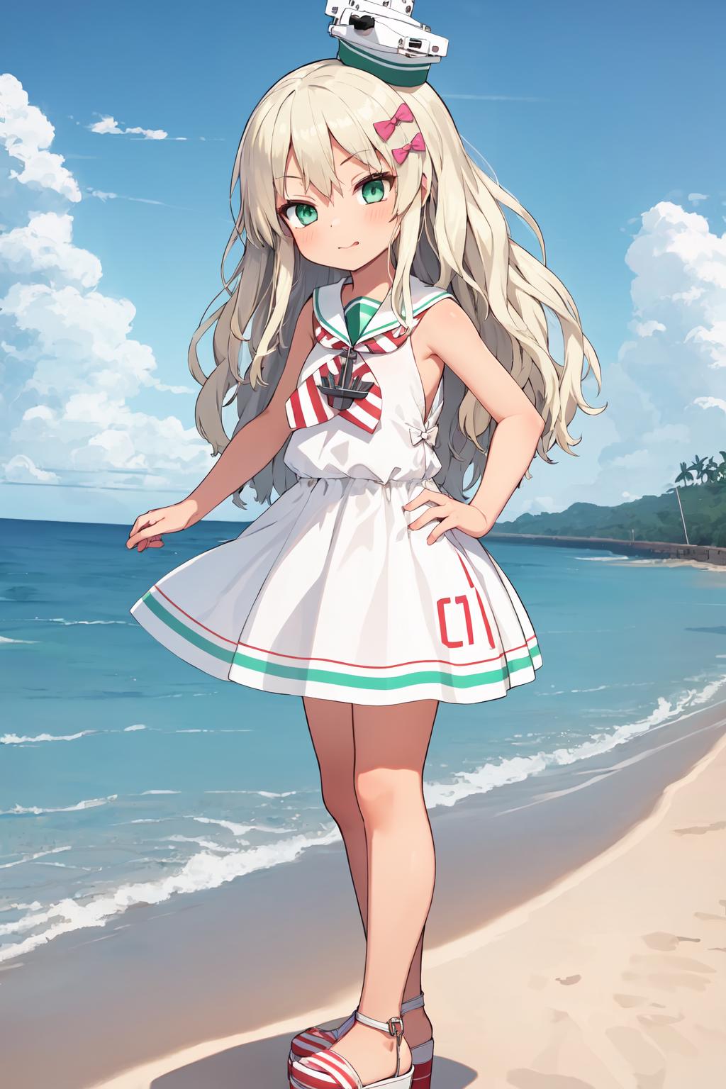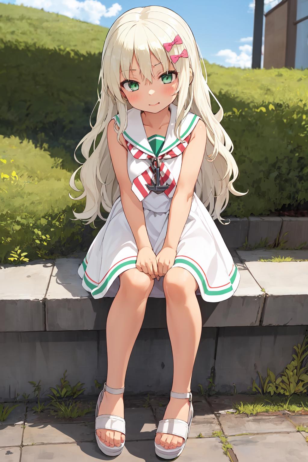 キャラクター:grecale \(kancolle\), blonde hair, wave hair, green eyes / blue eyes, long hair, hair bow, pink bow,