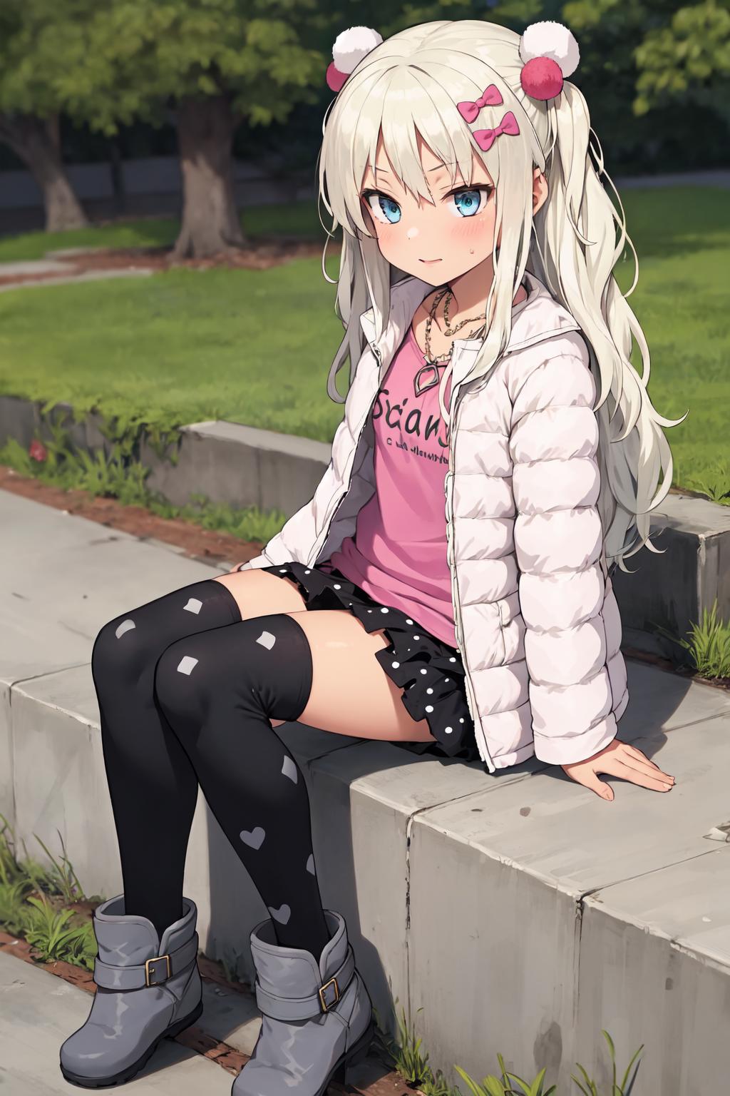 バレンタインmode:two side up, pom pom hair ornament, heart necklace, white jacket, open jacket, pink shirt, clothes writing, black skirt, polka dot skirt, pleated skirt, black thighhighs, grey footwear,
