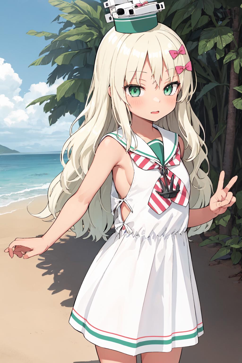 通常衣装:hat, striped neckerchief, anchor necklace, sailor dress, sleeveless dress, white dress, white footwear,