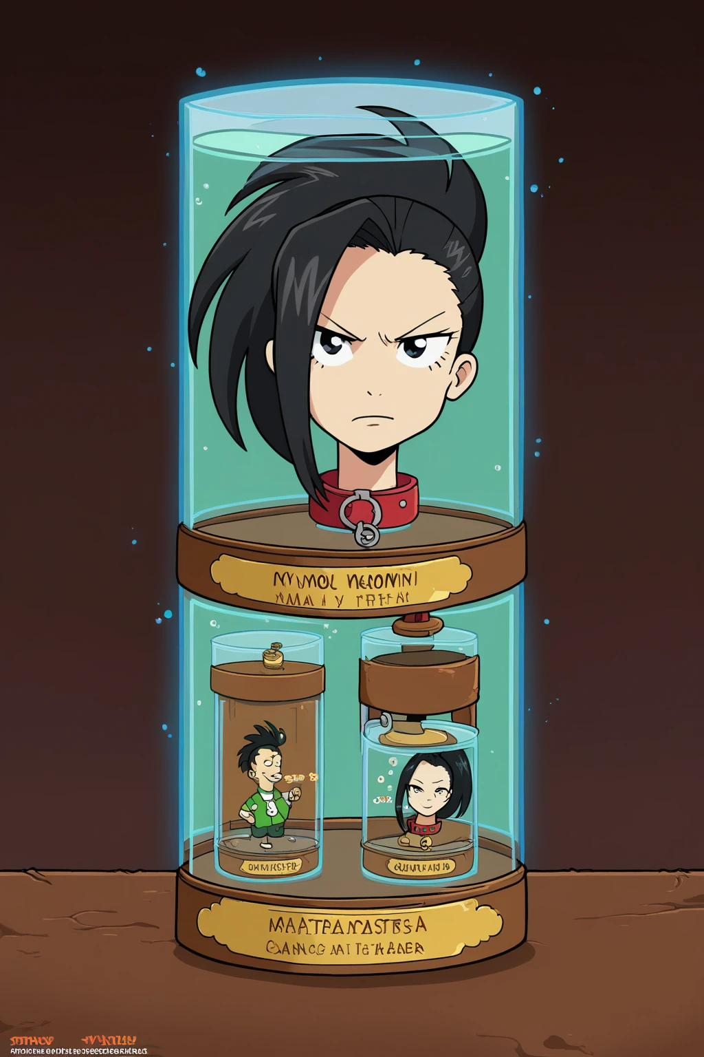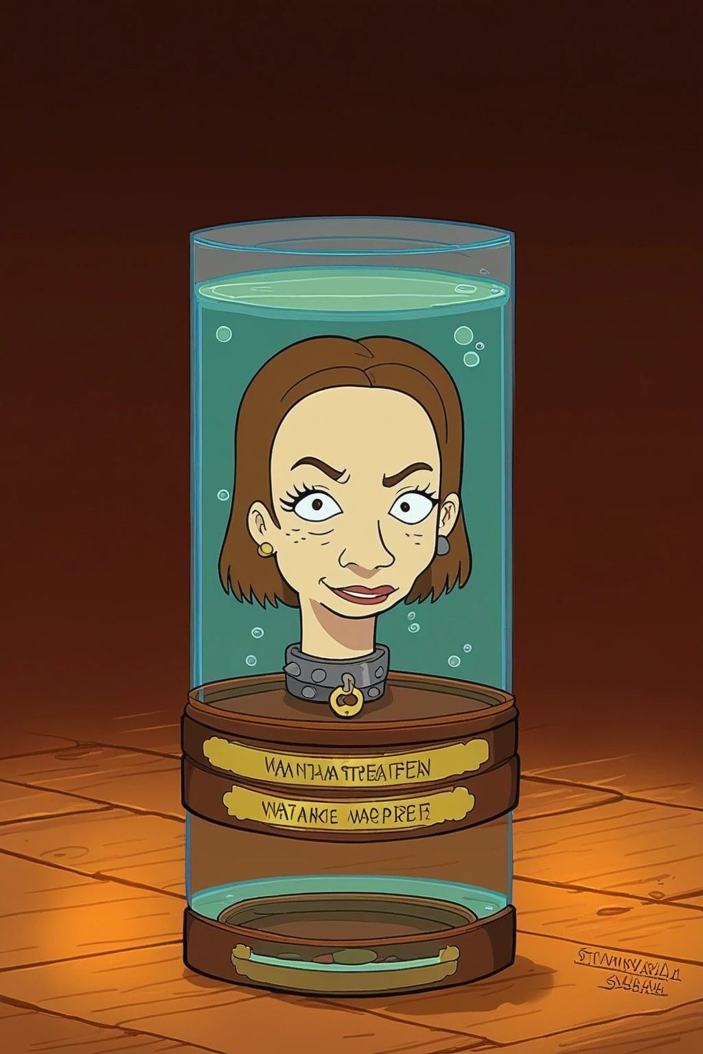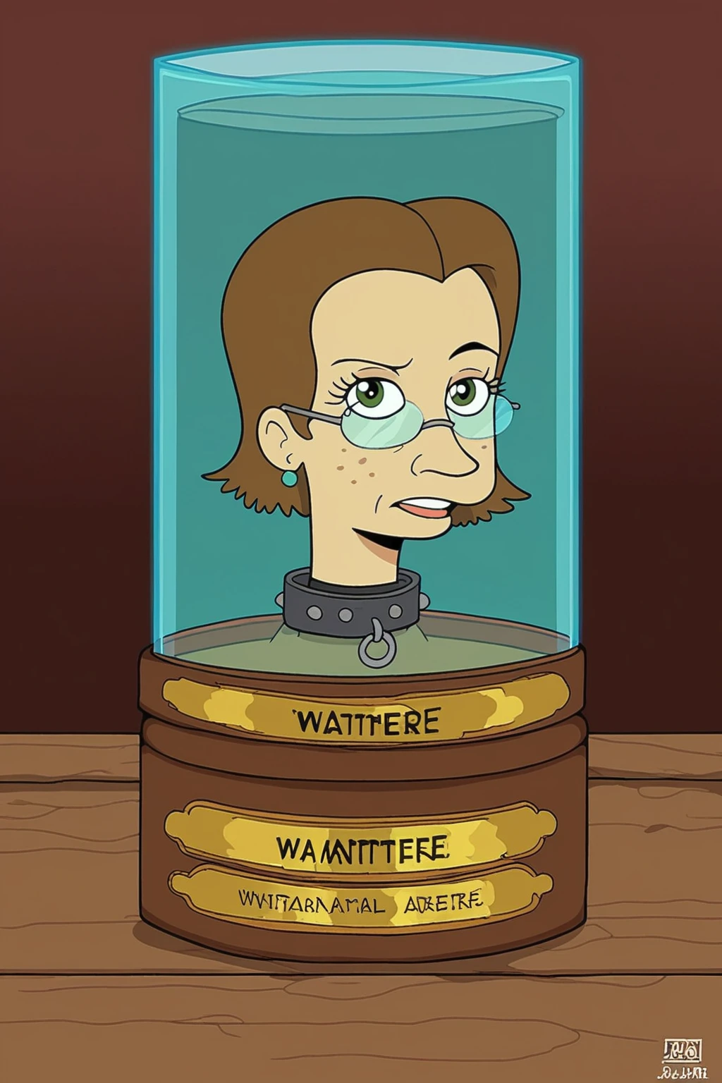 Prompts: Jar Head:0.9> jar head, brown hair, english text, collar, head in jar, decapitated head, head only,