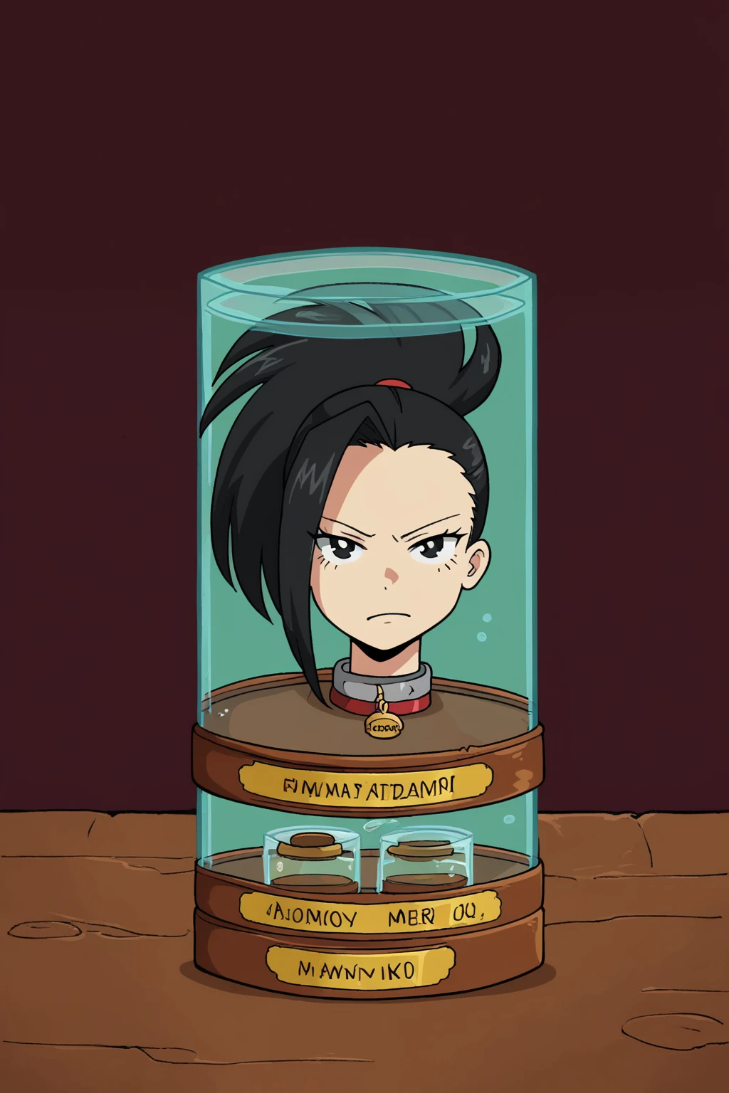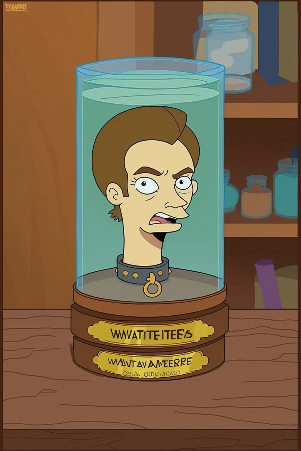 Jar Head:0.9> jar head, brown hair, english text, collar, head in jar, decapitated head, head only,