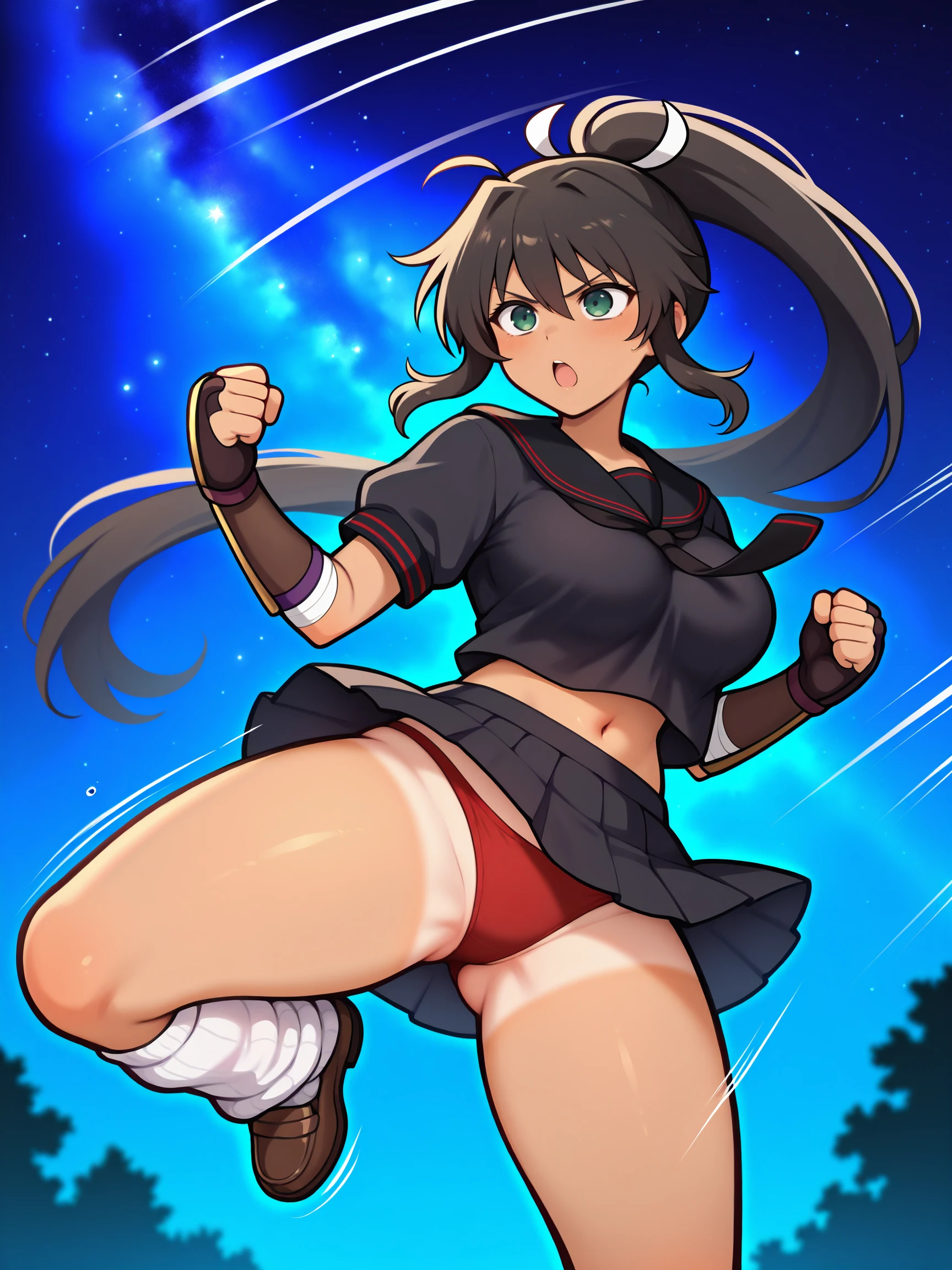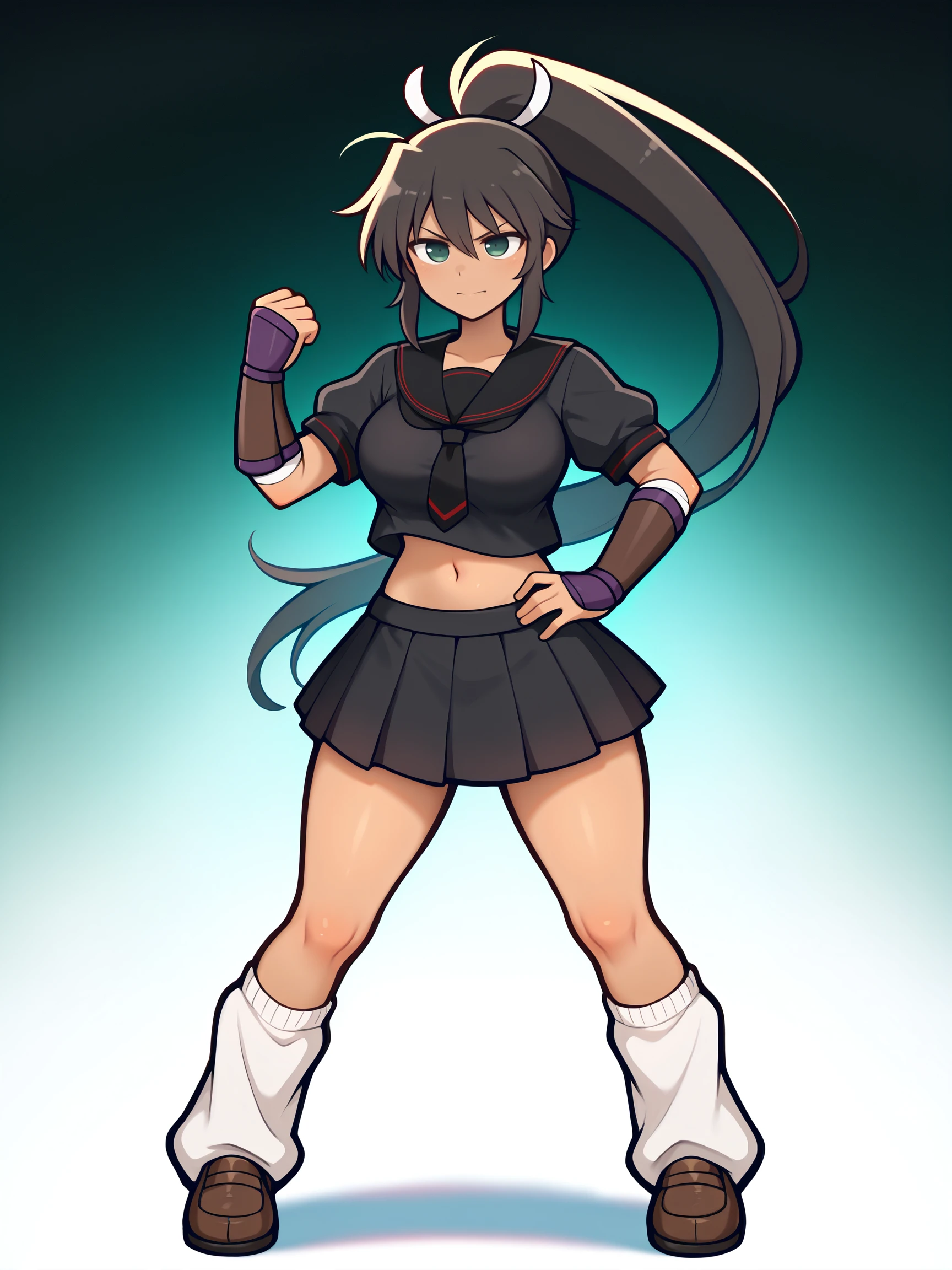 Trigger Words for shinobi outfit are "hebijo_outfit, black serafuku, arm guards, loafers, loose socks, black skirt, pleated skirt, short sleeves,".