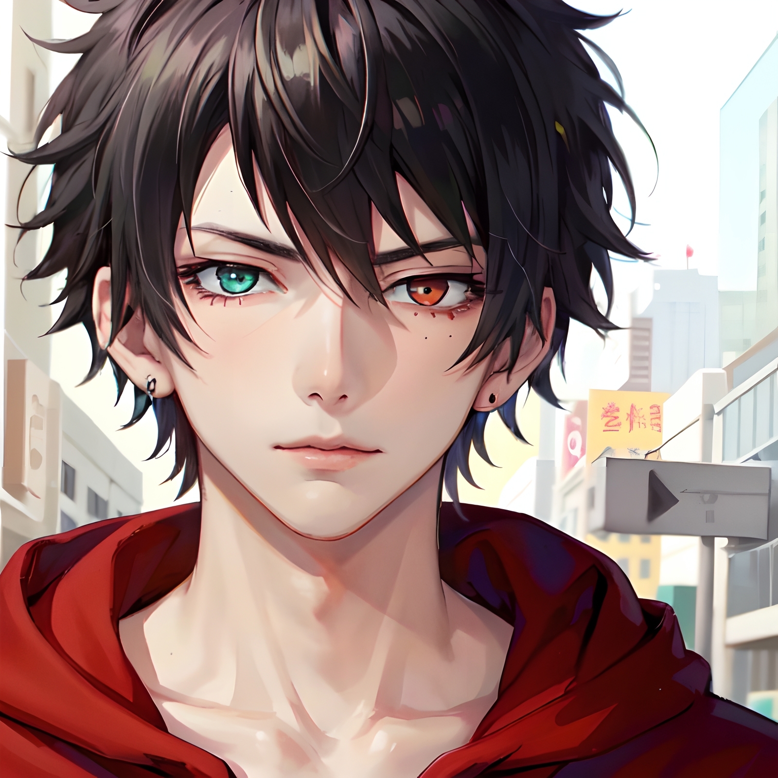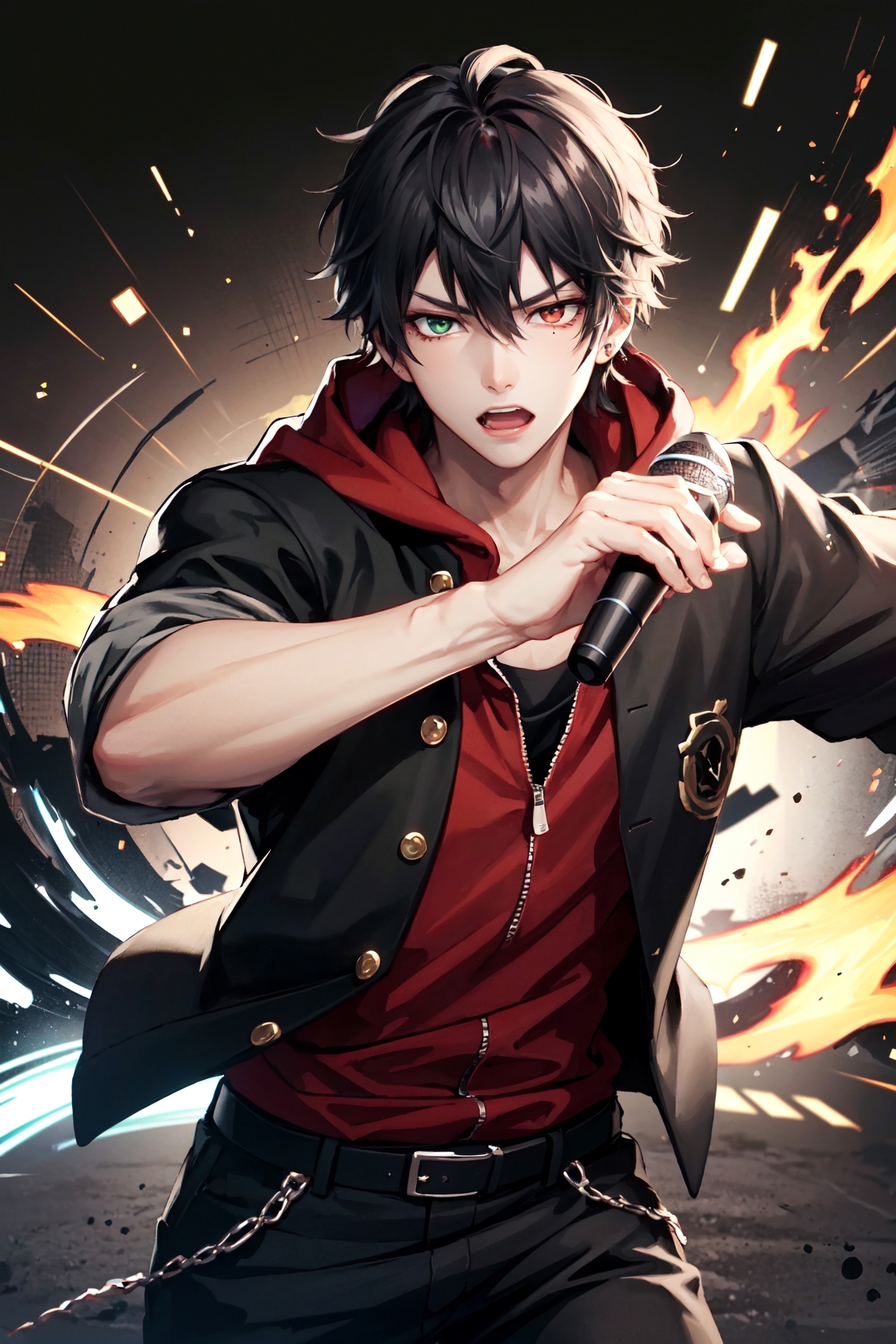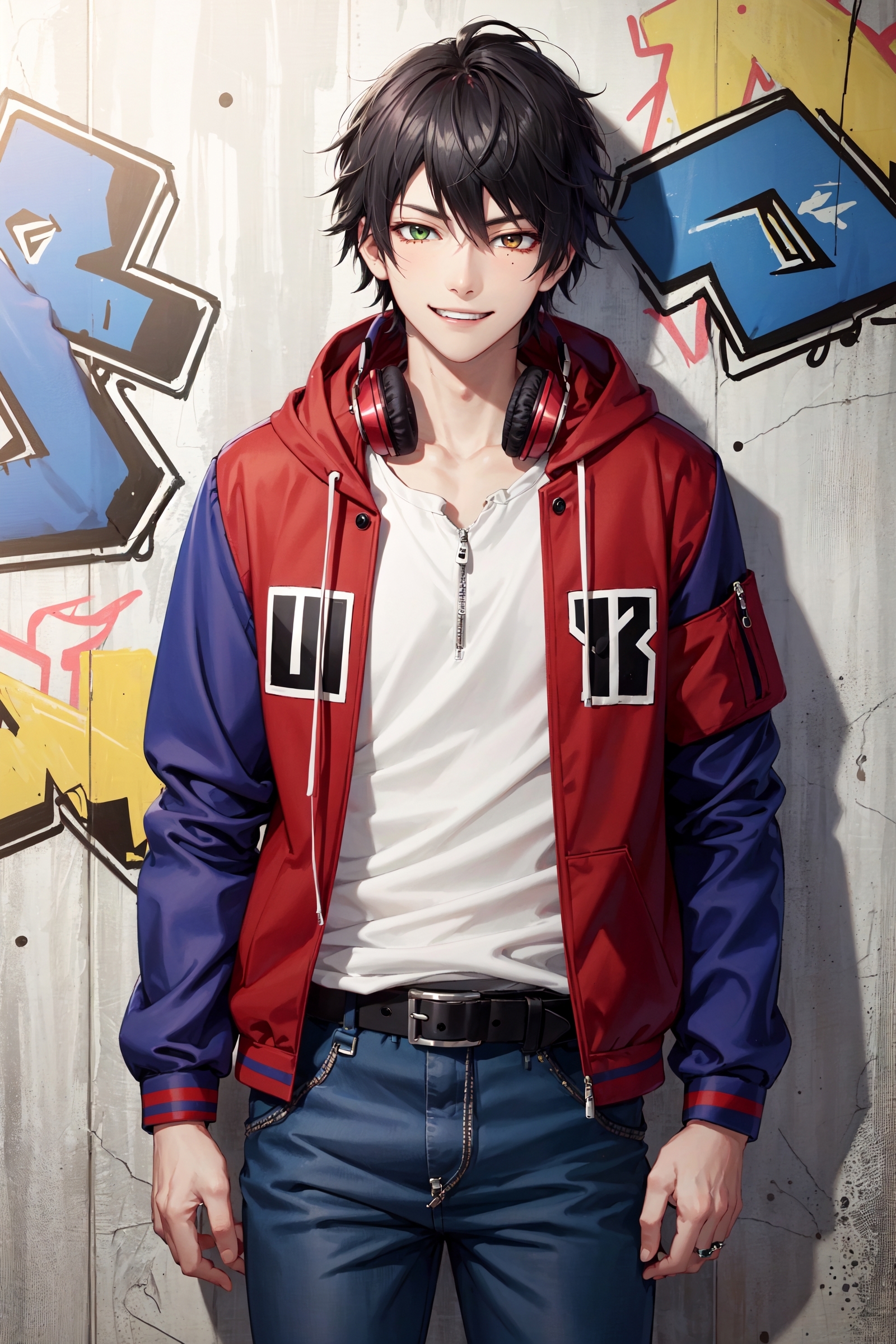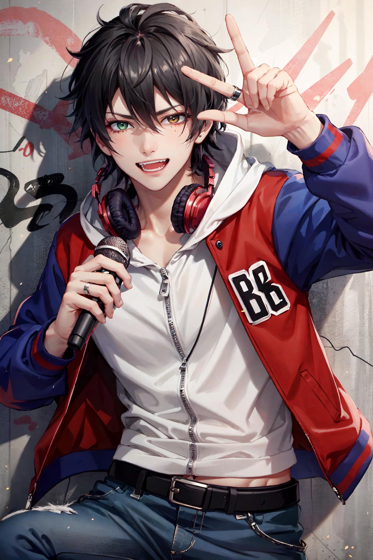 Common prompt:yamada ichiro\(hypnosis mic\), bangs, black hair, hair between eyes, heterochromia, red eyes, green eyes, mole under eye,