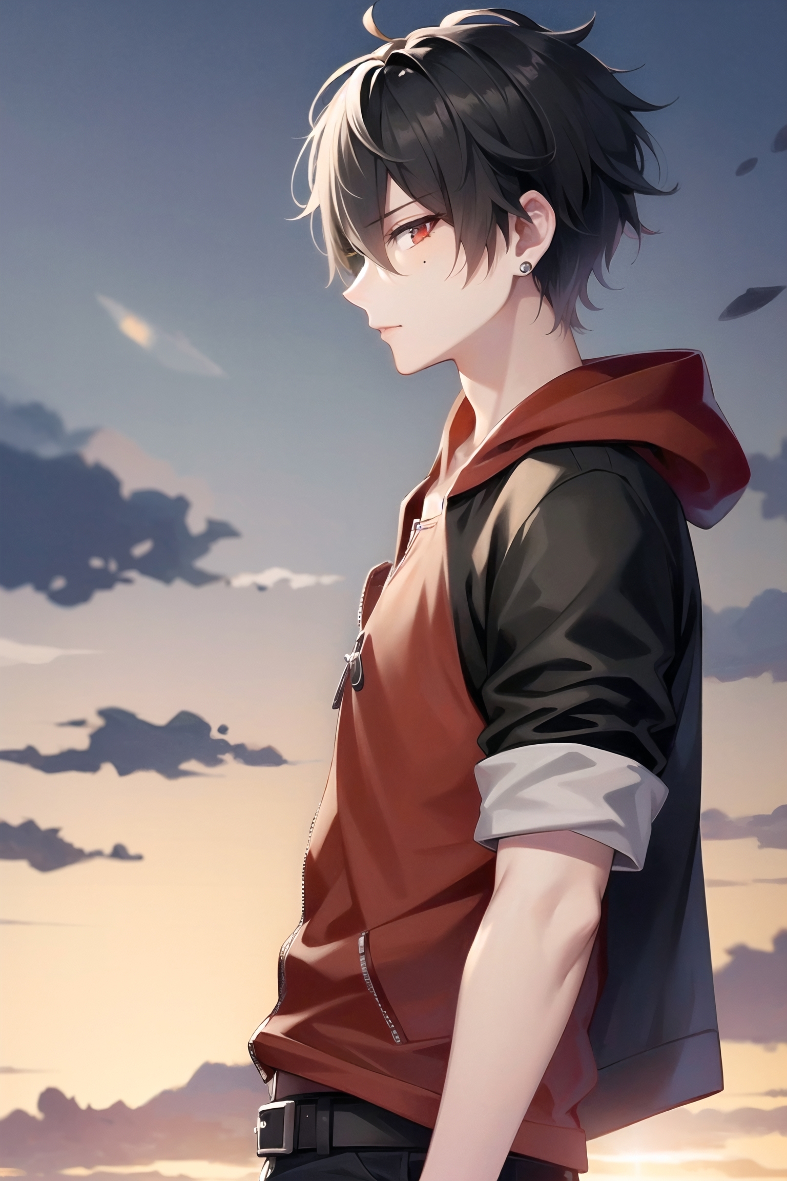 the dirty dawg, 17 years old, (short hair), (red shirt), loose pants, bontan, gakuran, open jacket, stud earrings, zipper, red hood, black belt, black pants, sleeves rolled up