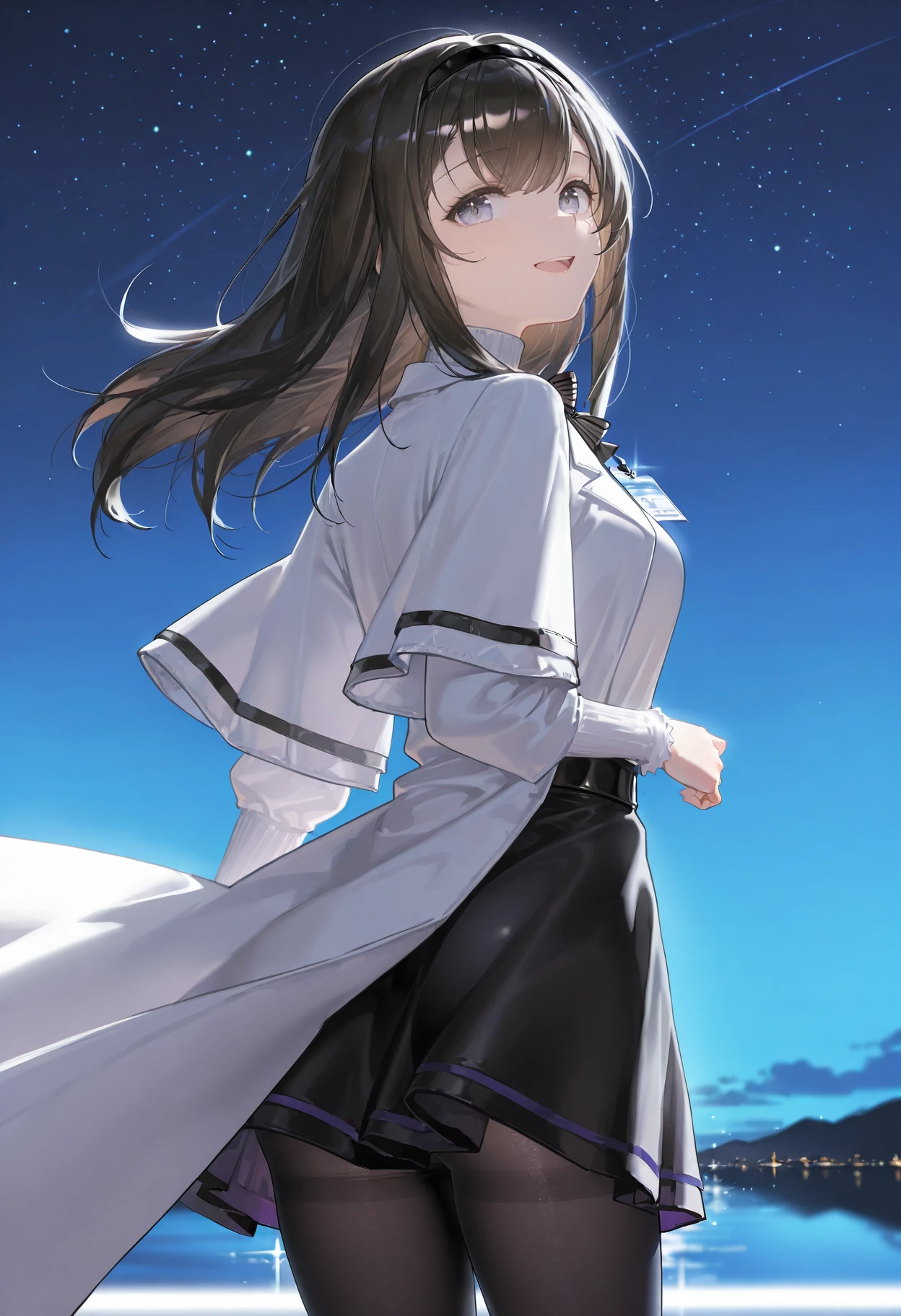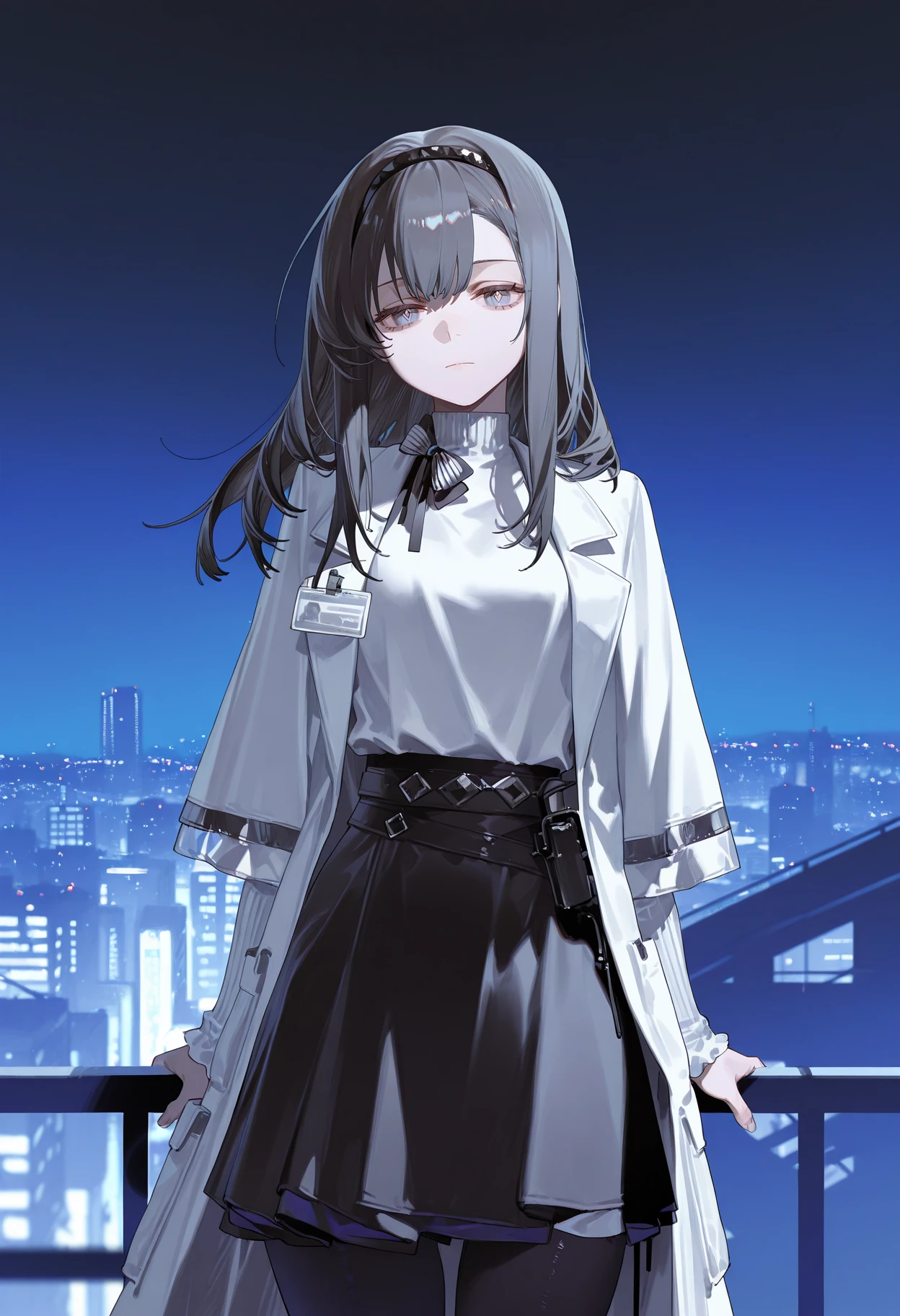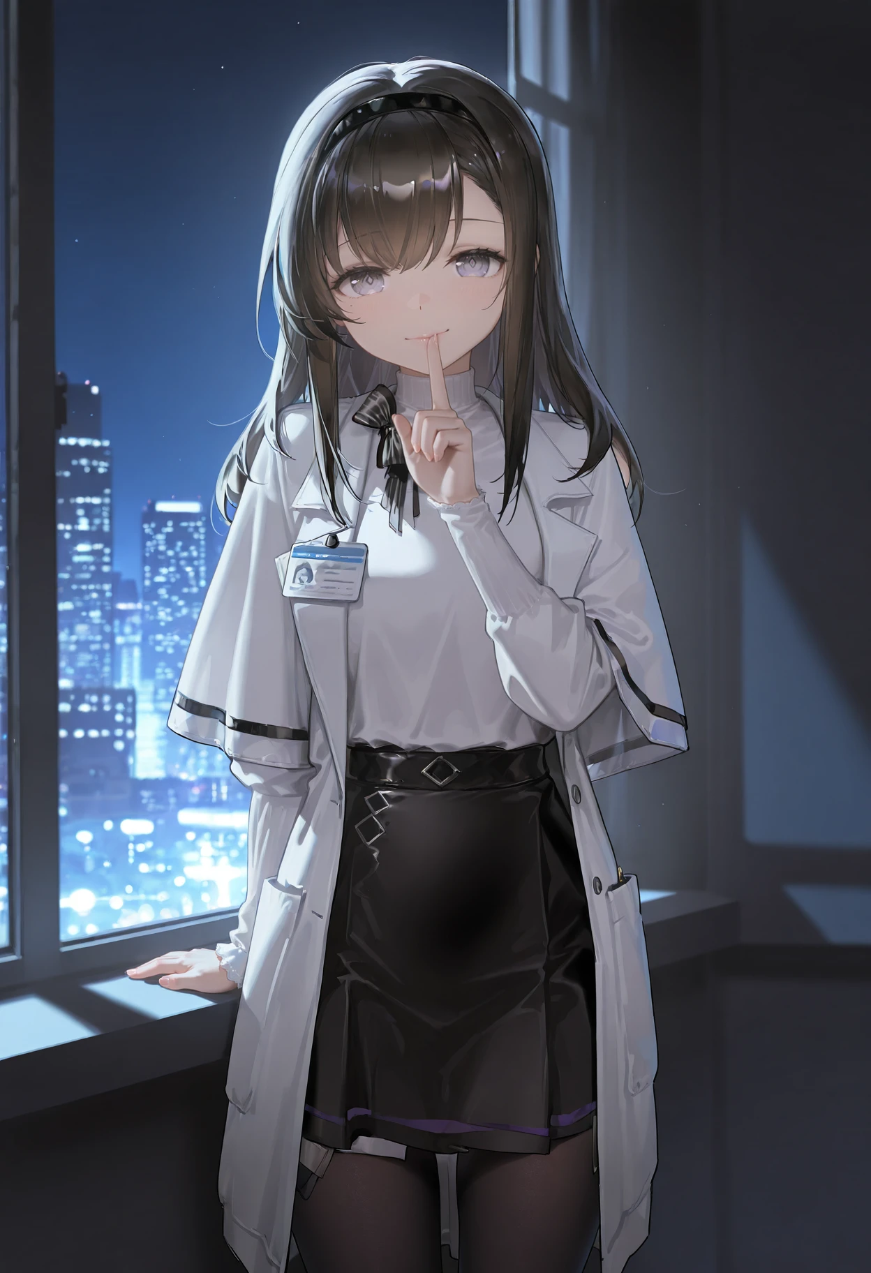 black hairband, white sweater, turtleneck sweater, bowtie, white coat, black skirt, black pantyhose, white high heels, Priestess: I'm not upset.