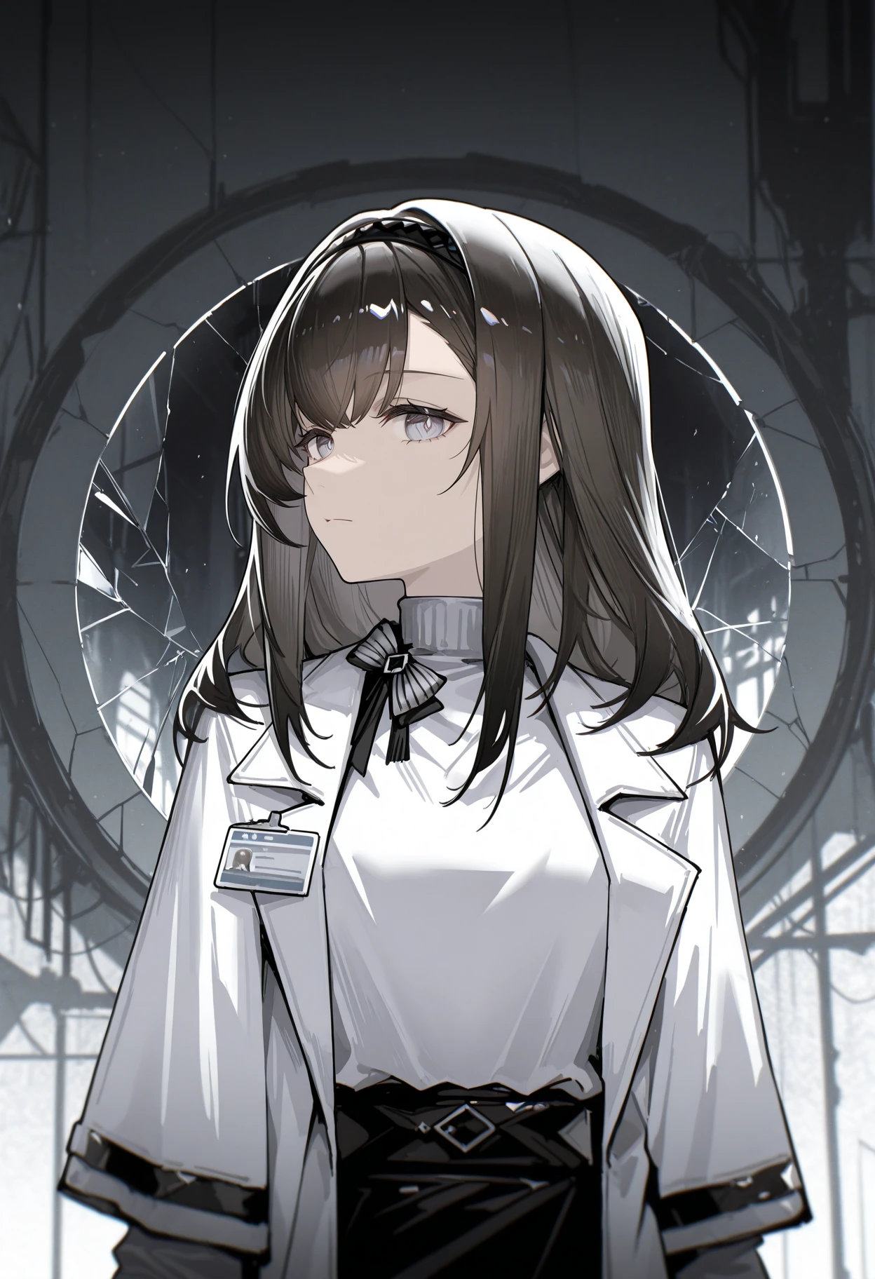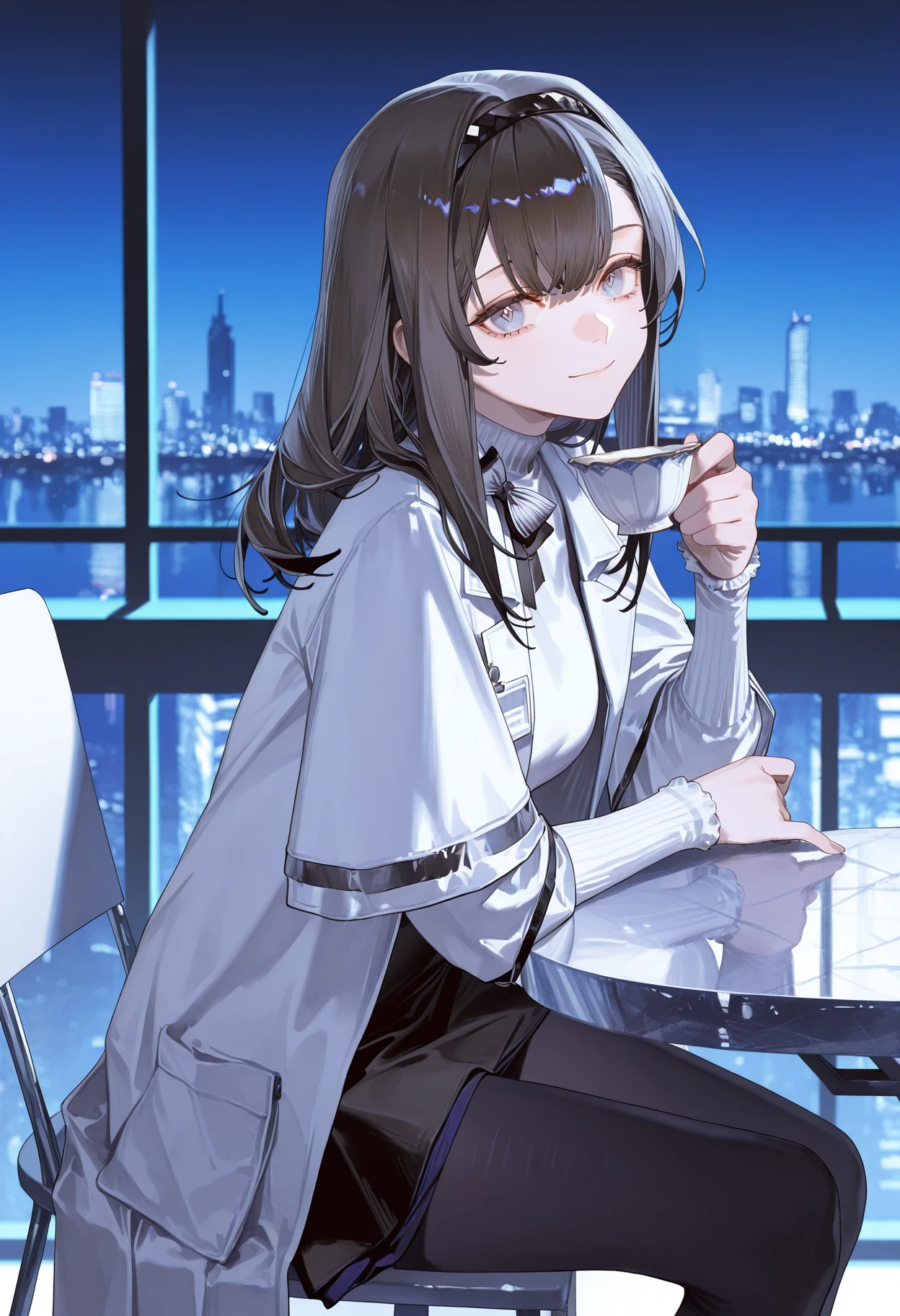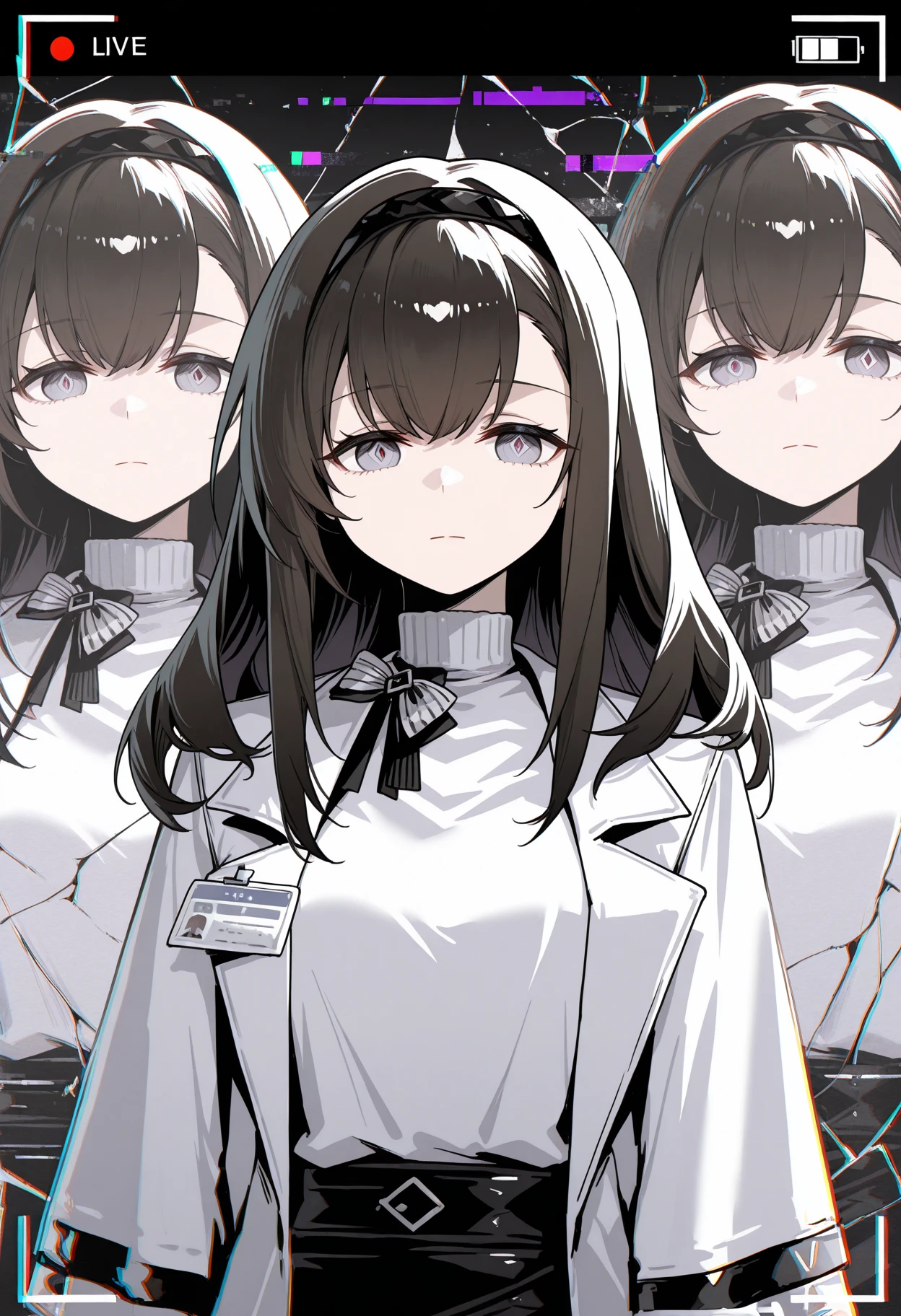 black hairband, white sweater, turtleneck sweater, bowtie, white coat, black skirt, black pantyhose, white high heels, Priestess: I'm not upset.
