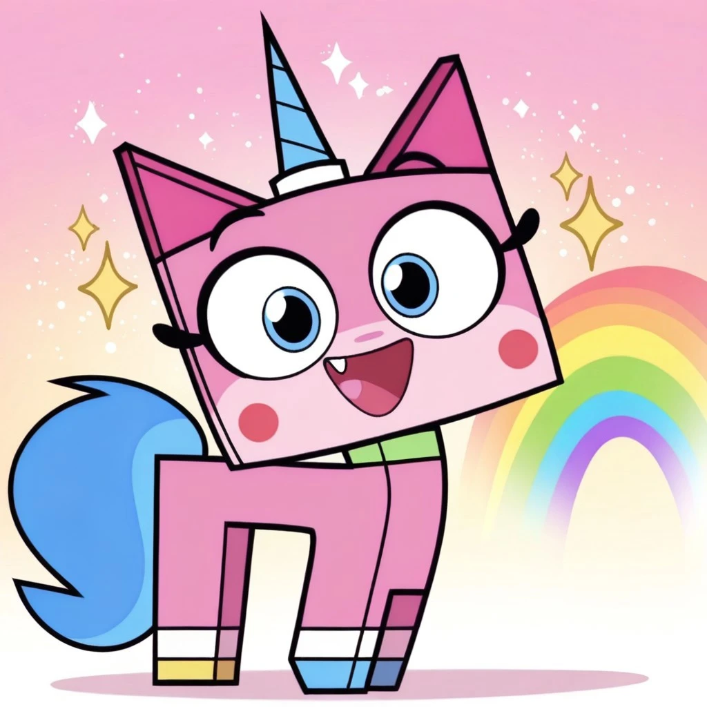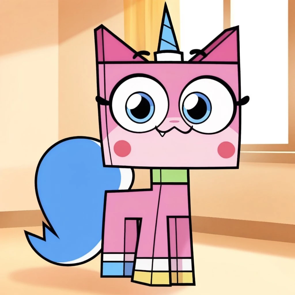 unikittyshow, cat, pink fur, green neck, blue front paws, yellow back paws, blue eyes, blue horn, blush stickers, fang, blue tail, white stripe