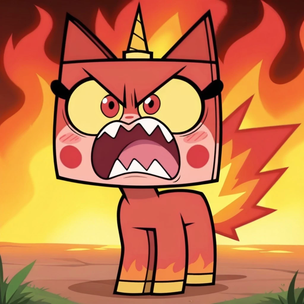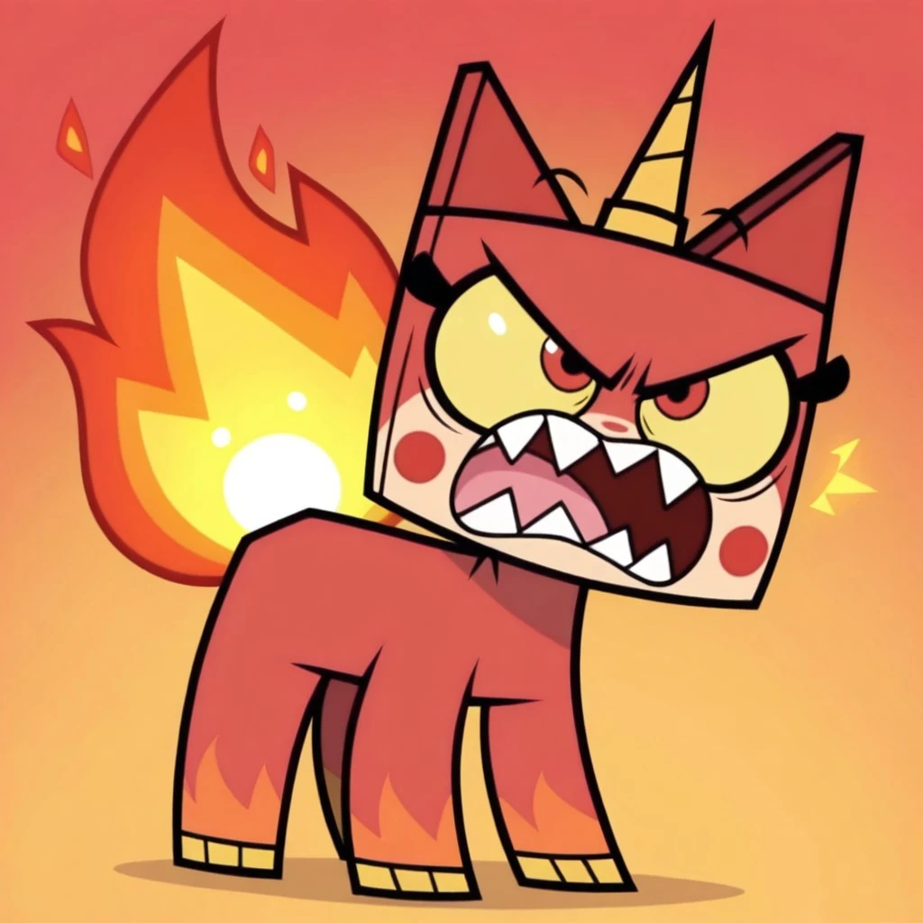 unikittyangry, cat, red fur, red eyes, yellow sclera, yellow horn, blush stickers, sharp teeth, fire