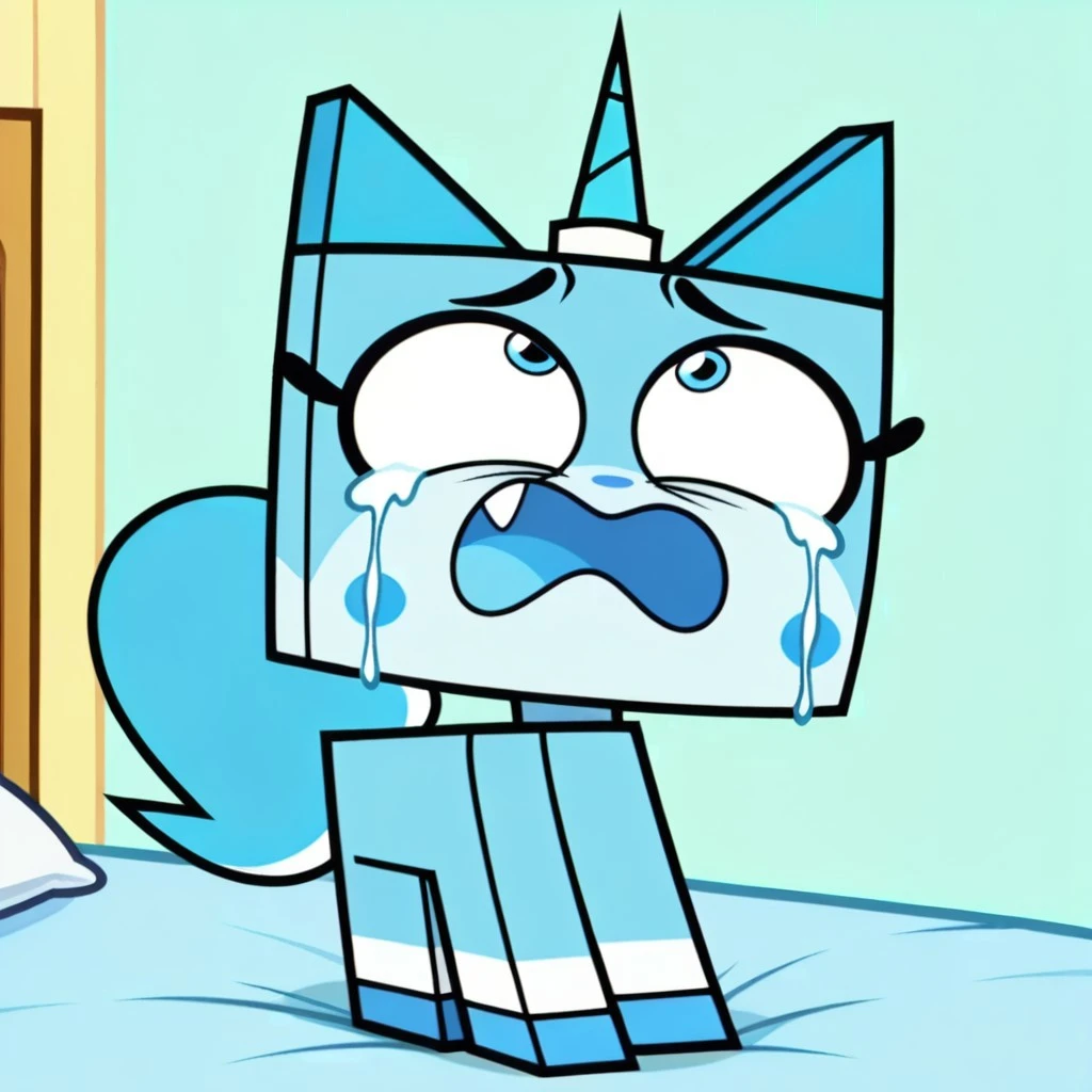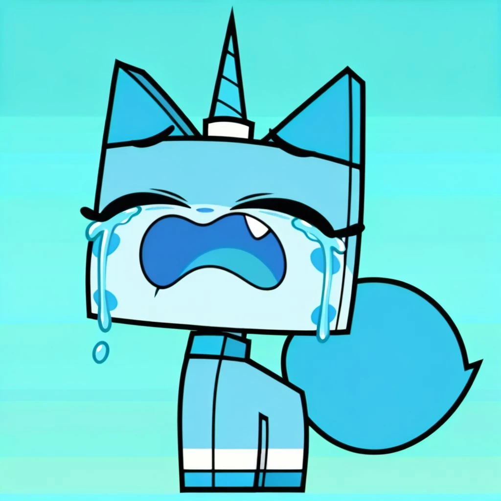 unikittysad, cat, blue fur, blue eyes, blue horn, blush stickers, fang, blue tail, white stripe, blue mouth