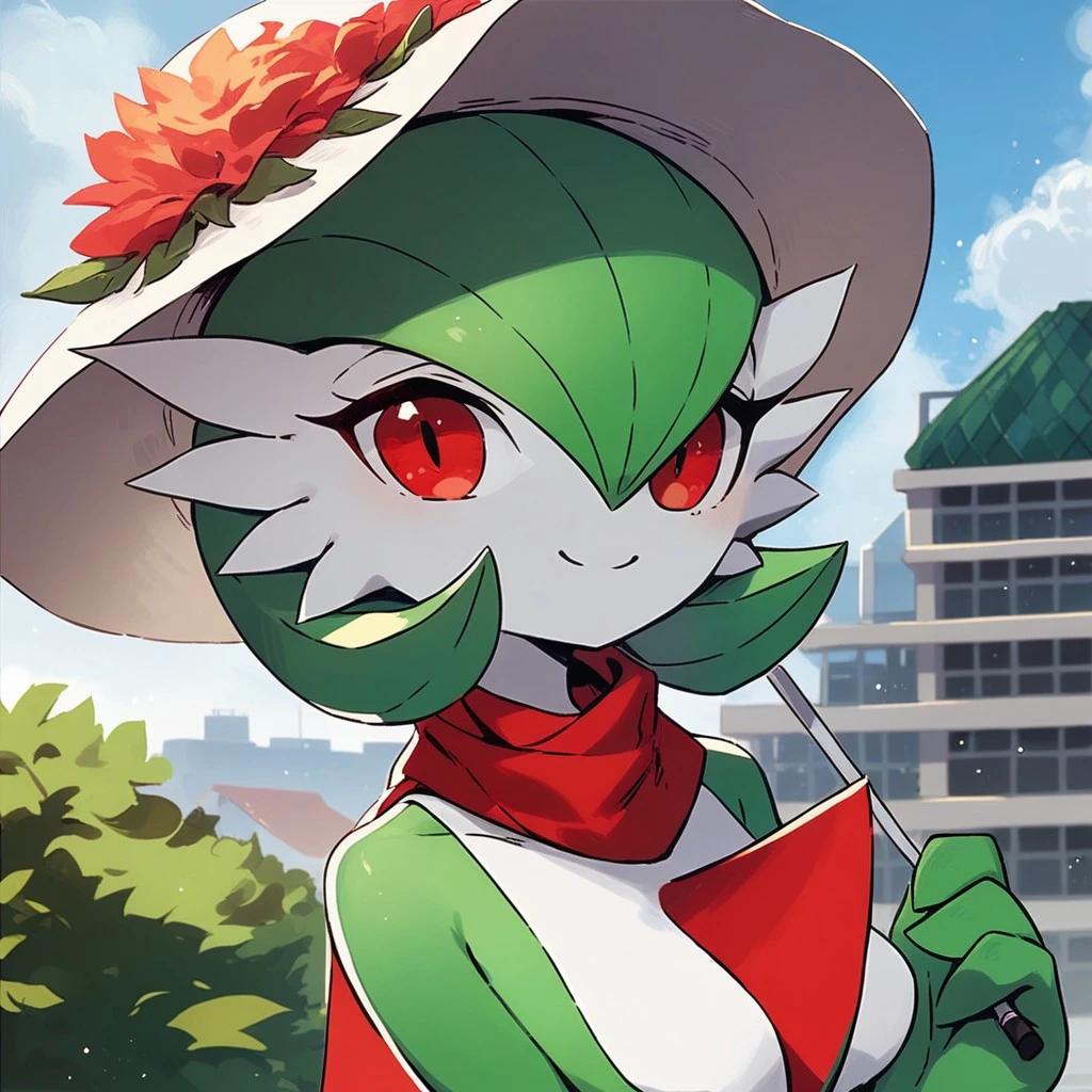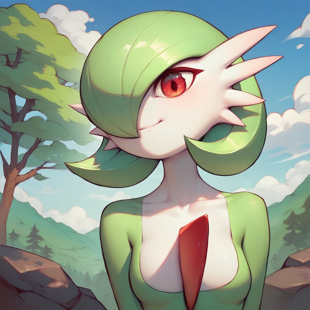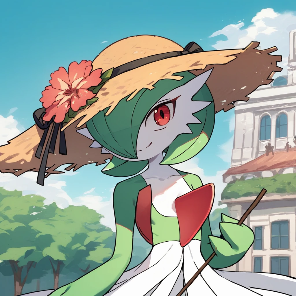 gardevoir, green hair, green skin, white skin, red eyes, white dress, two-tone skin,