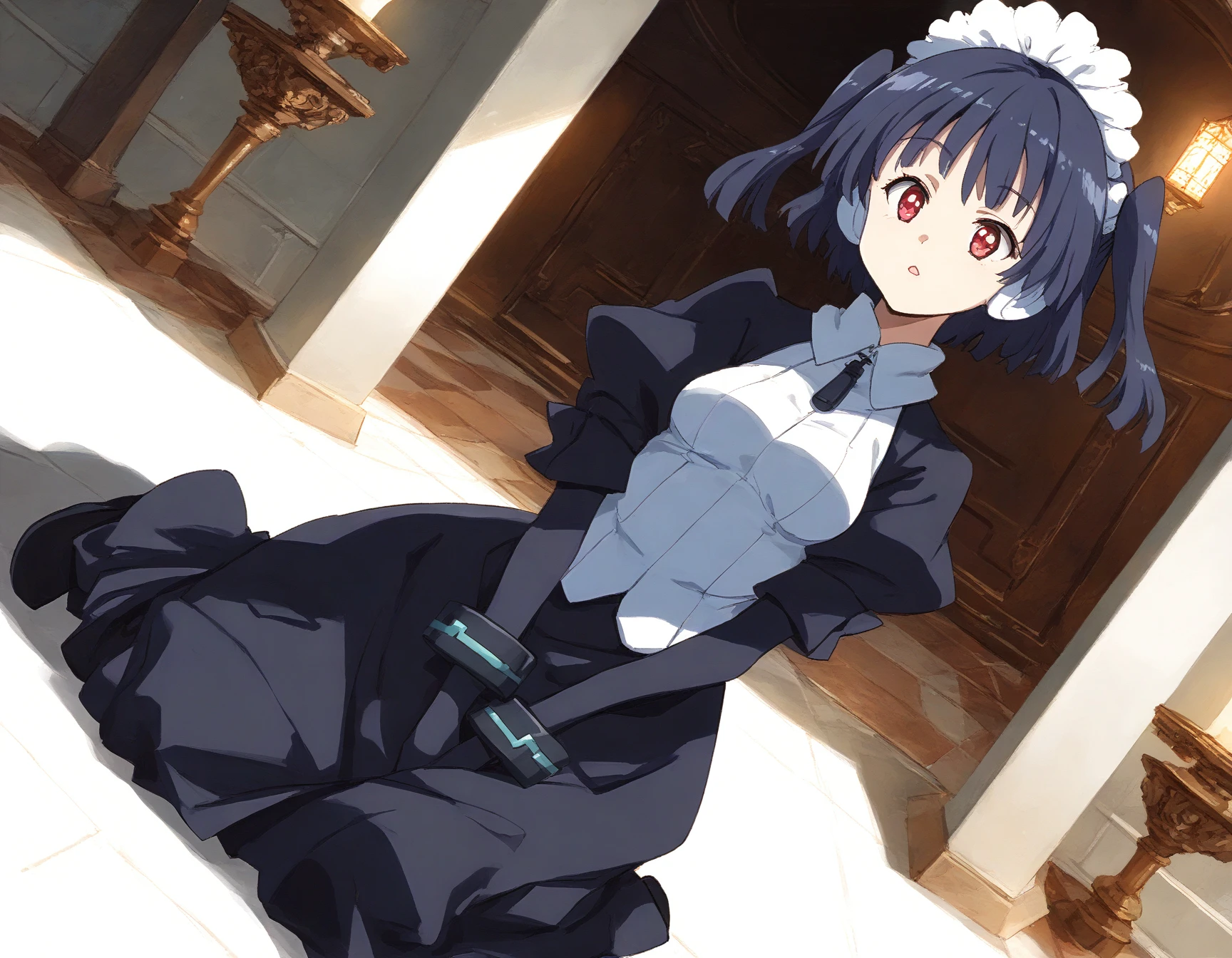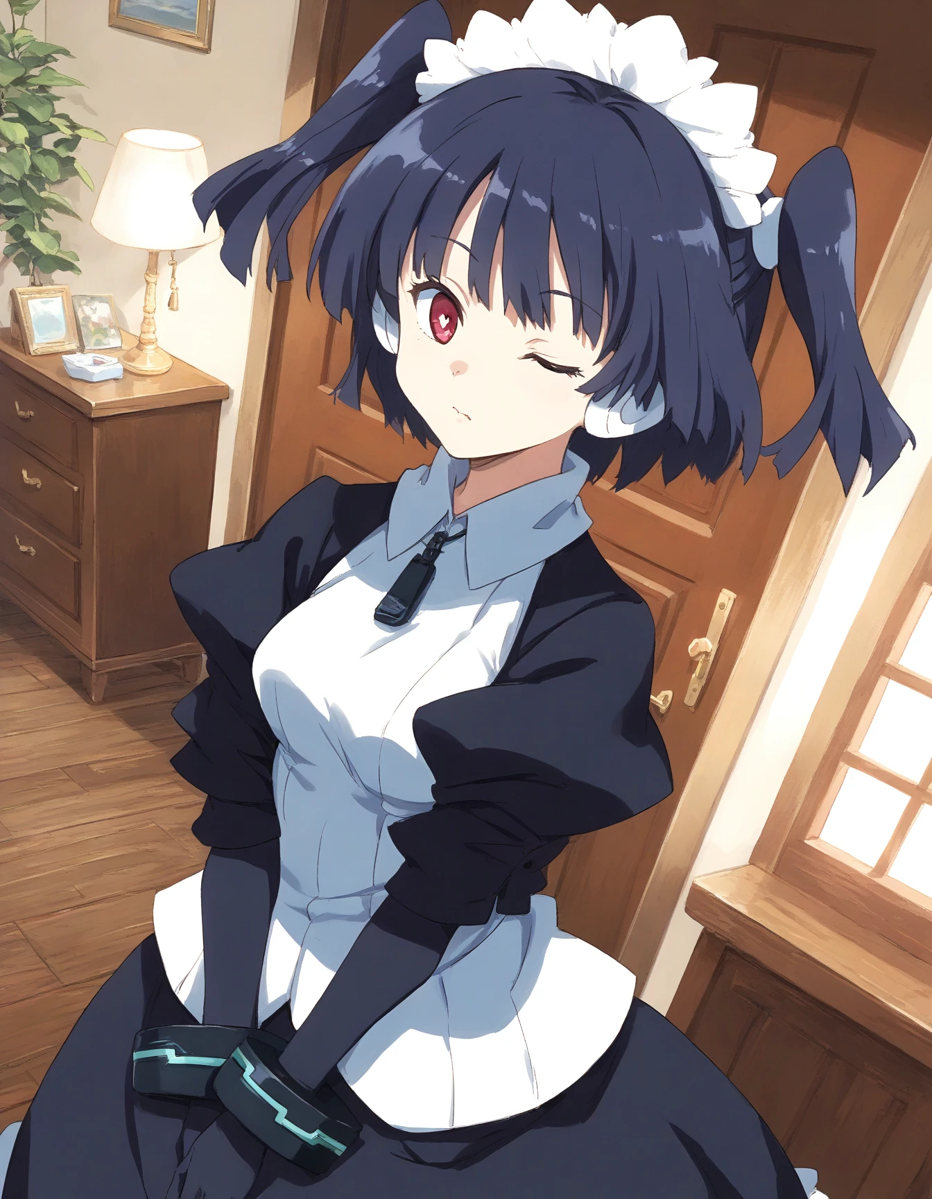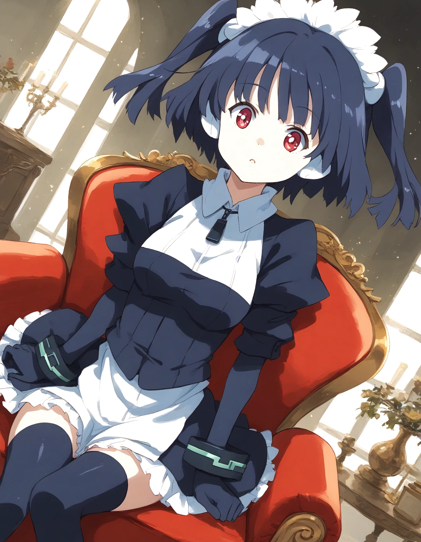 ce_glare, 1girl, red eyes, black hair, blue hair, short hair, twintails, bangs, shaggy bob, maid headdress, android, maid, colored skin, pale skin, blue skin, black dress, blue dress, long sleeves, juliet sleeves, puffy sleeves, elbow gloves, white vest, black thighhighs, blue thighhighs, cuffsDescription