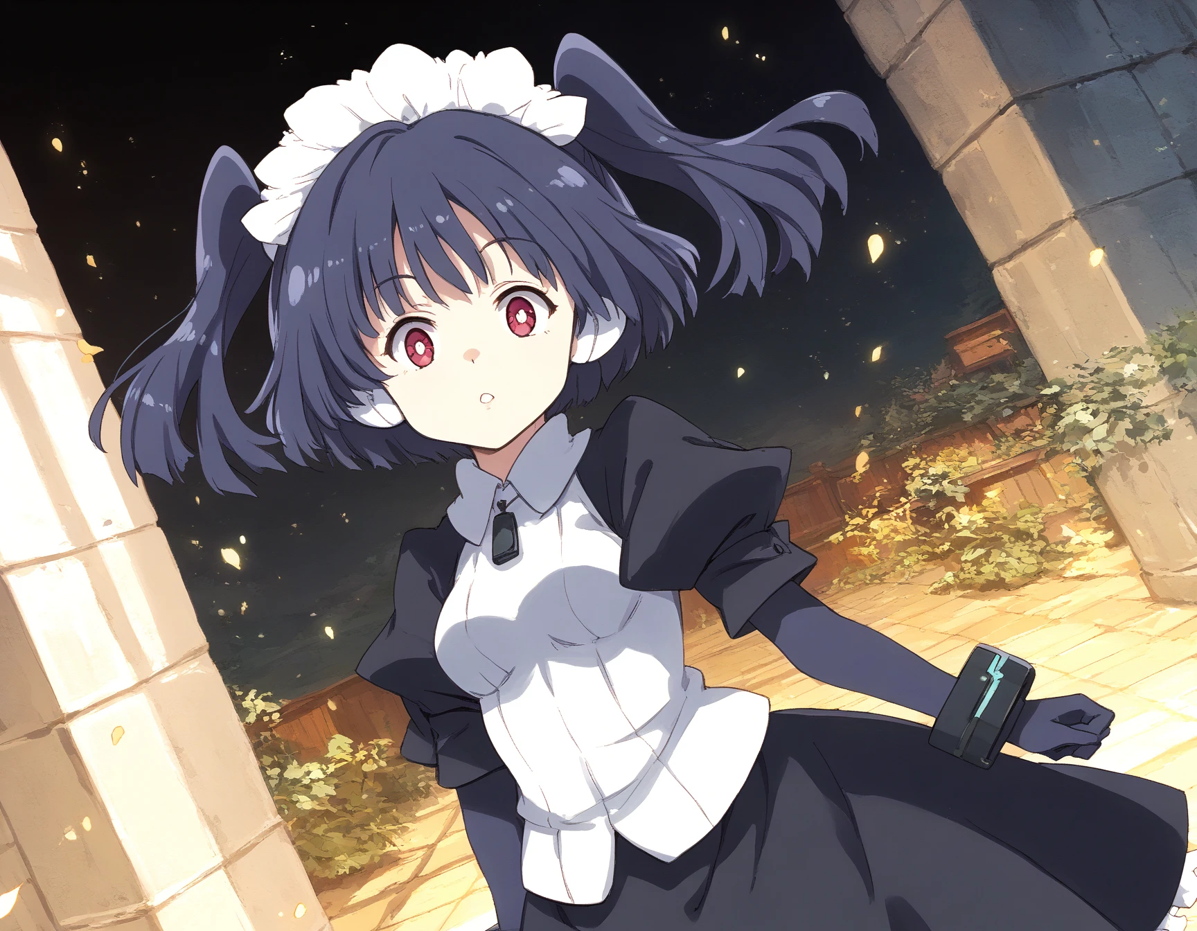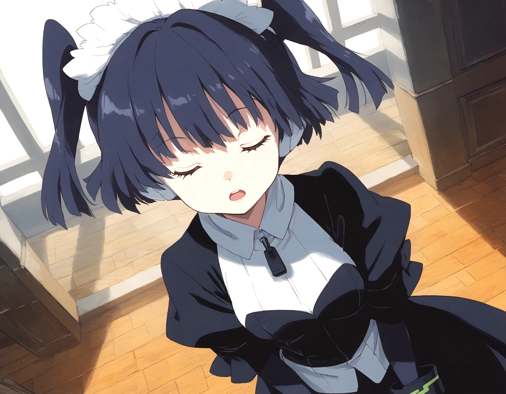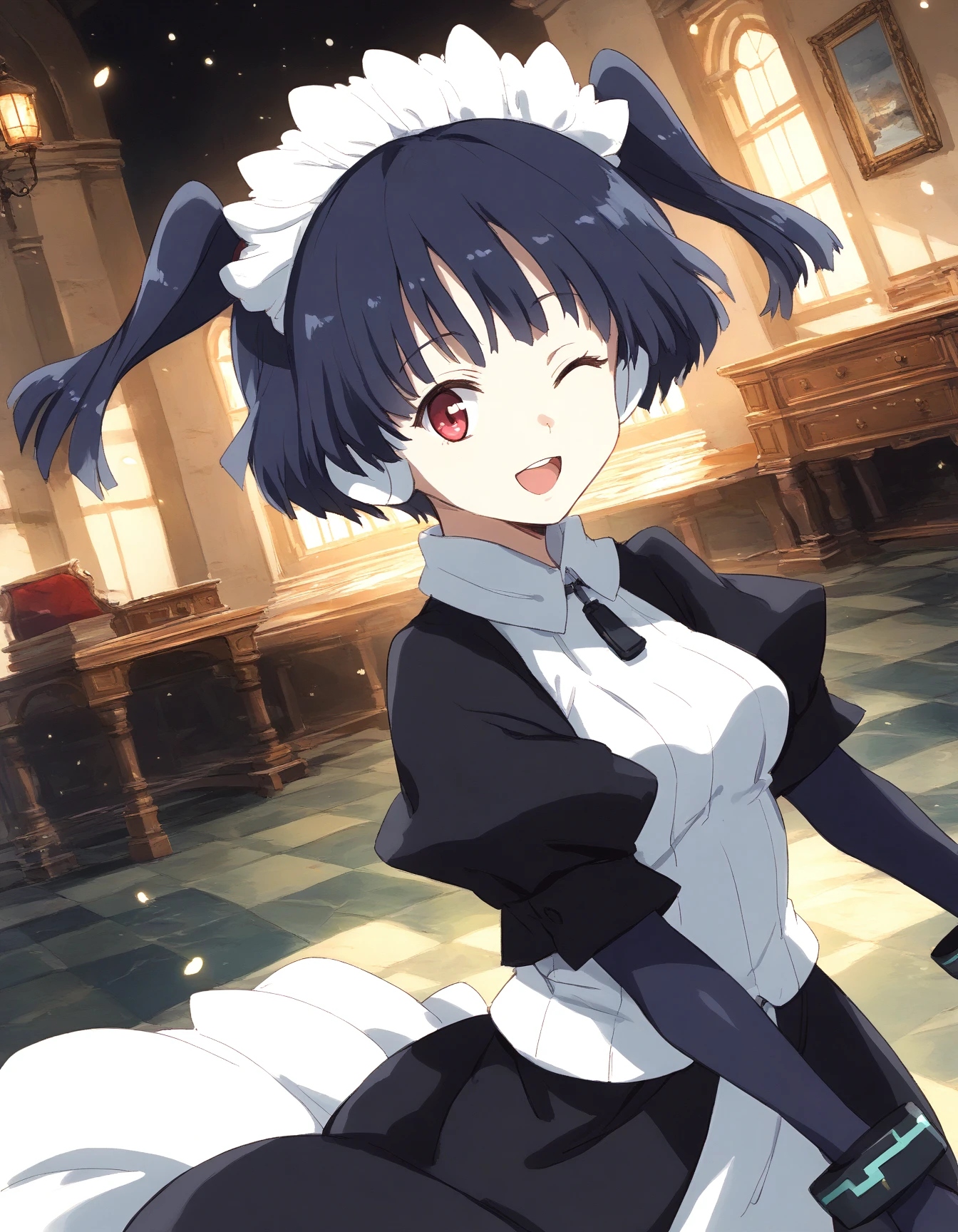 ce_glare, 1girl, red eyes, black hair, blue hair, short hair, twintails, bangs, shaggy bob, maid headdress, android, maid, colored skin, pale skin, blue skin, black dress, blue dress, long sleeves, juliet sleeves, puffy sleeves, elbow gloves, white vest, black thighhighs, blue thighhighs, cuffsDescription