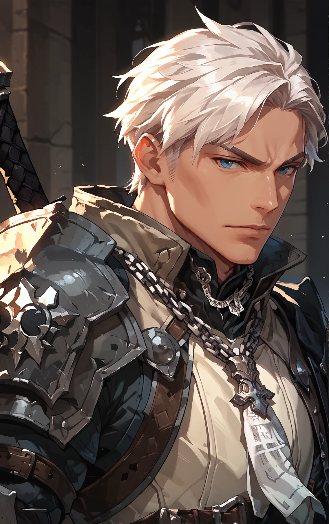 Trigger words (optional): white hair, short hair, side part, blue eyes, armor, steel pauldrons, white tunic, chain necklace with paper, light skin, steel gauntlets, brown belt, sword on back, high collar