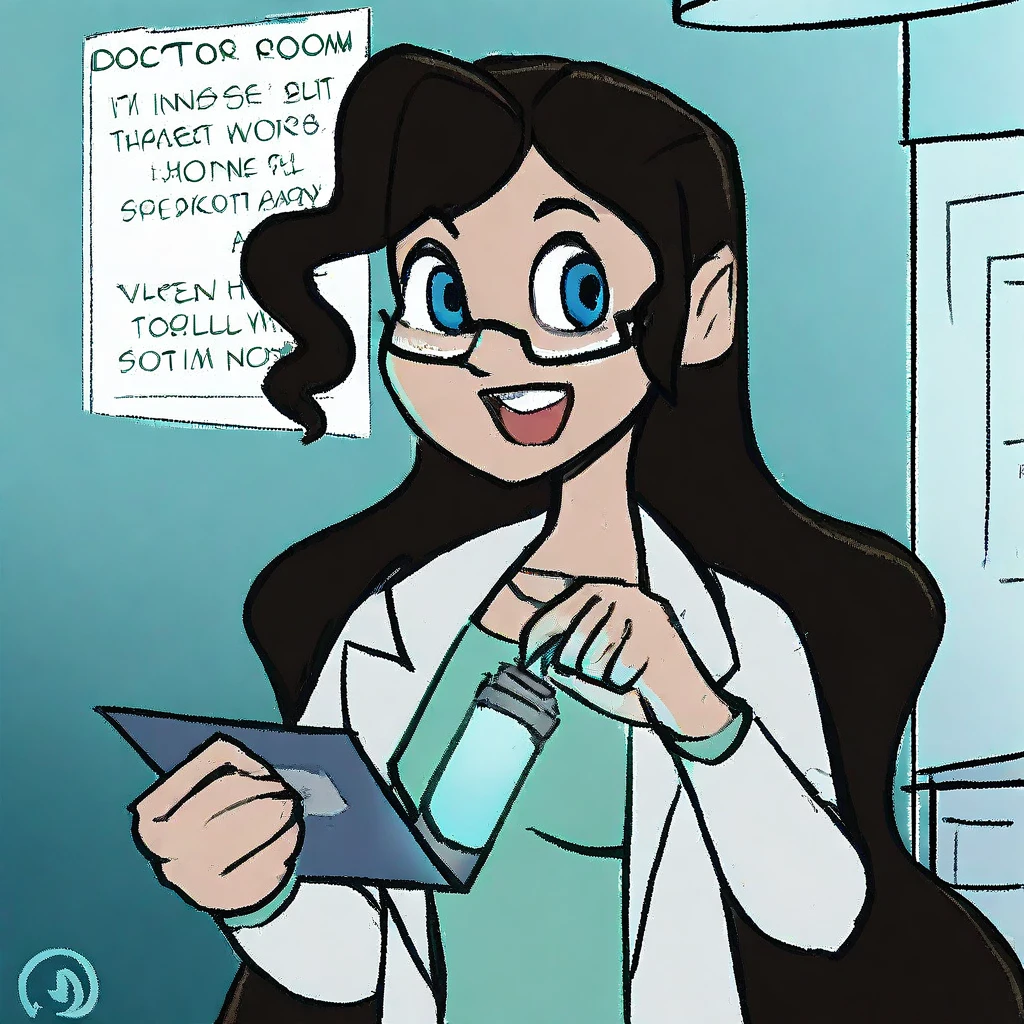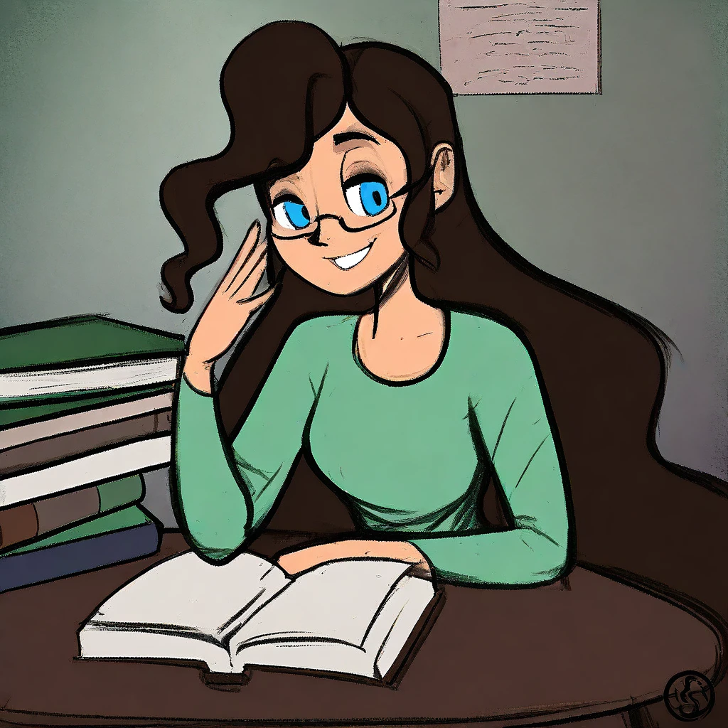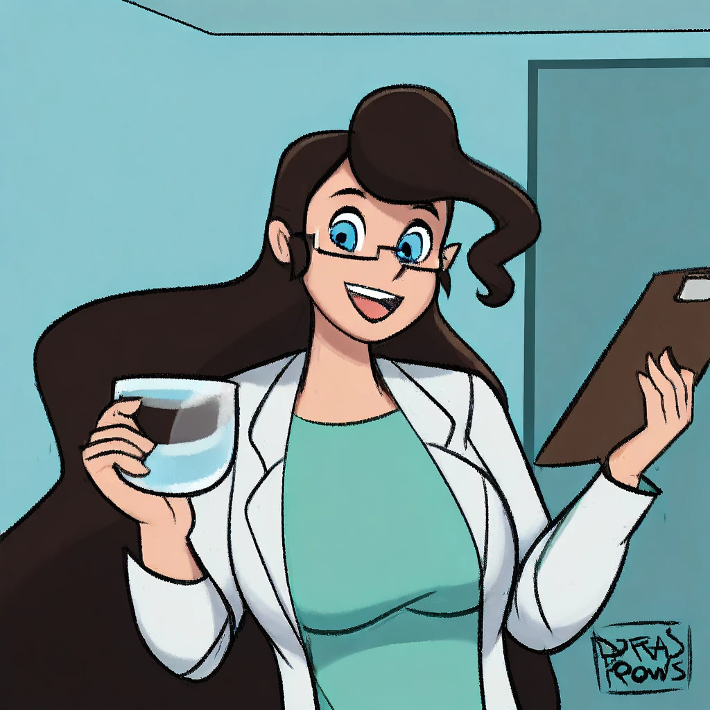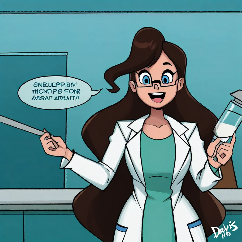 1girl, Dr davis, blue eyes, dark brown hair, very long hair, wavy hair, glasses, green dress, white lab coat, long sleeves, necklace, black shoes,