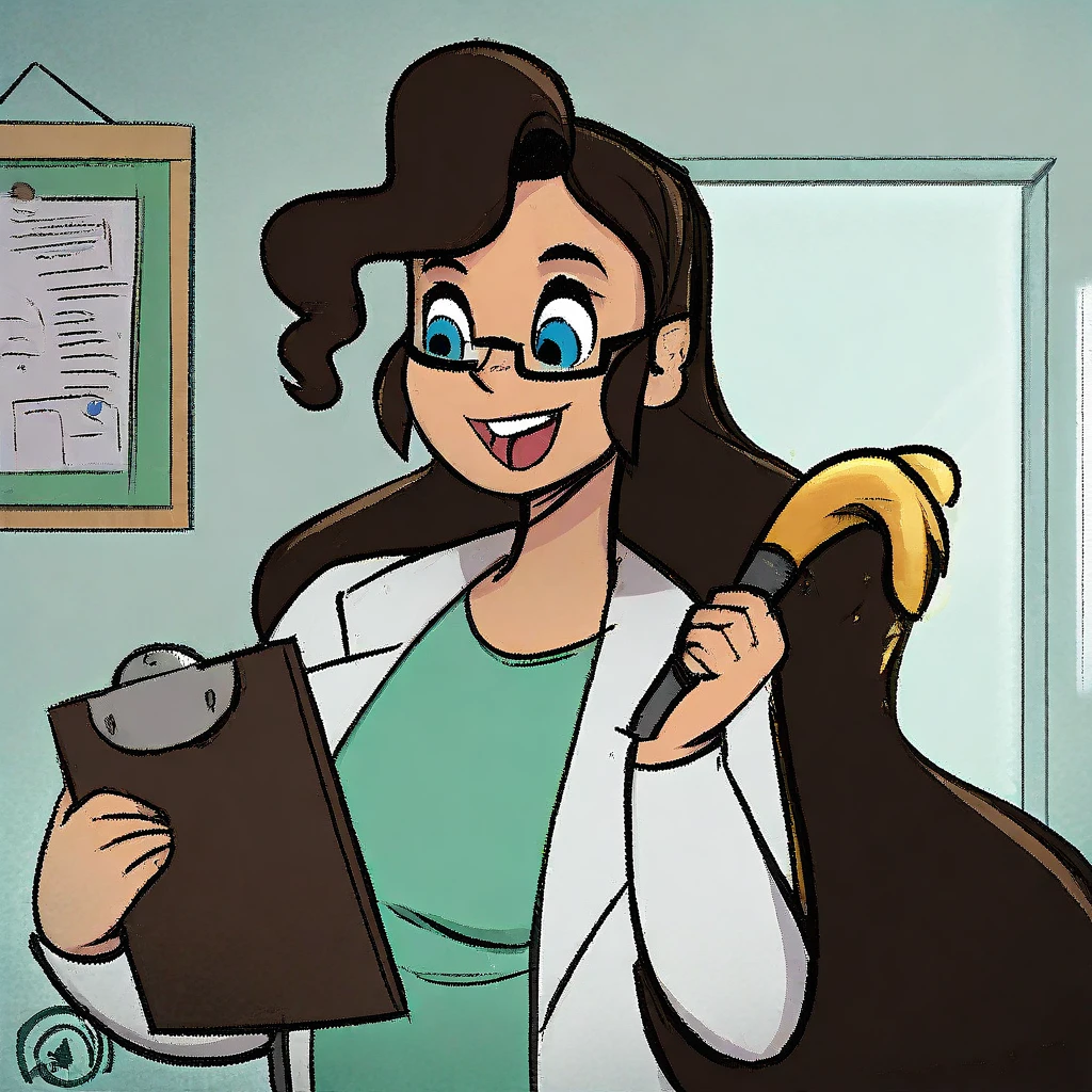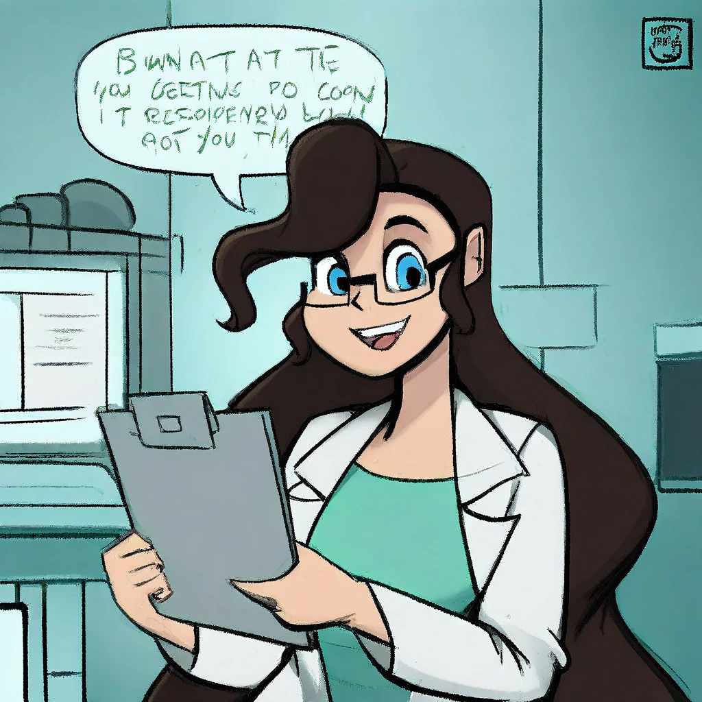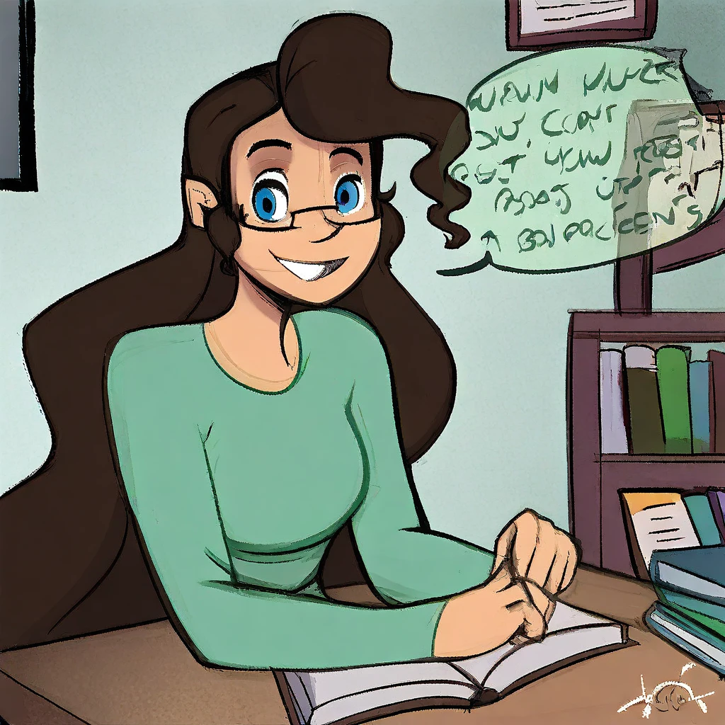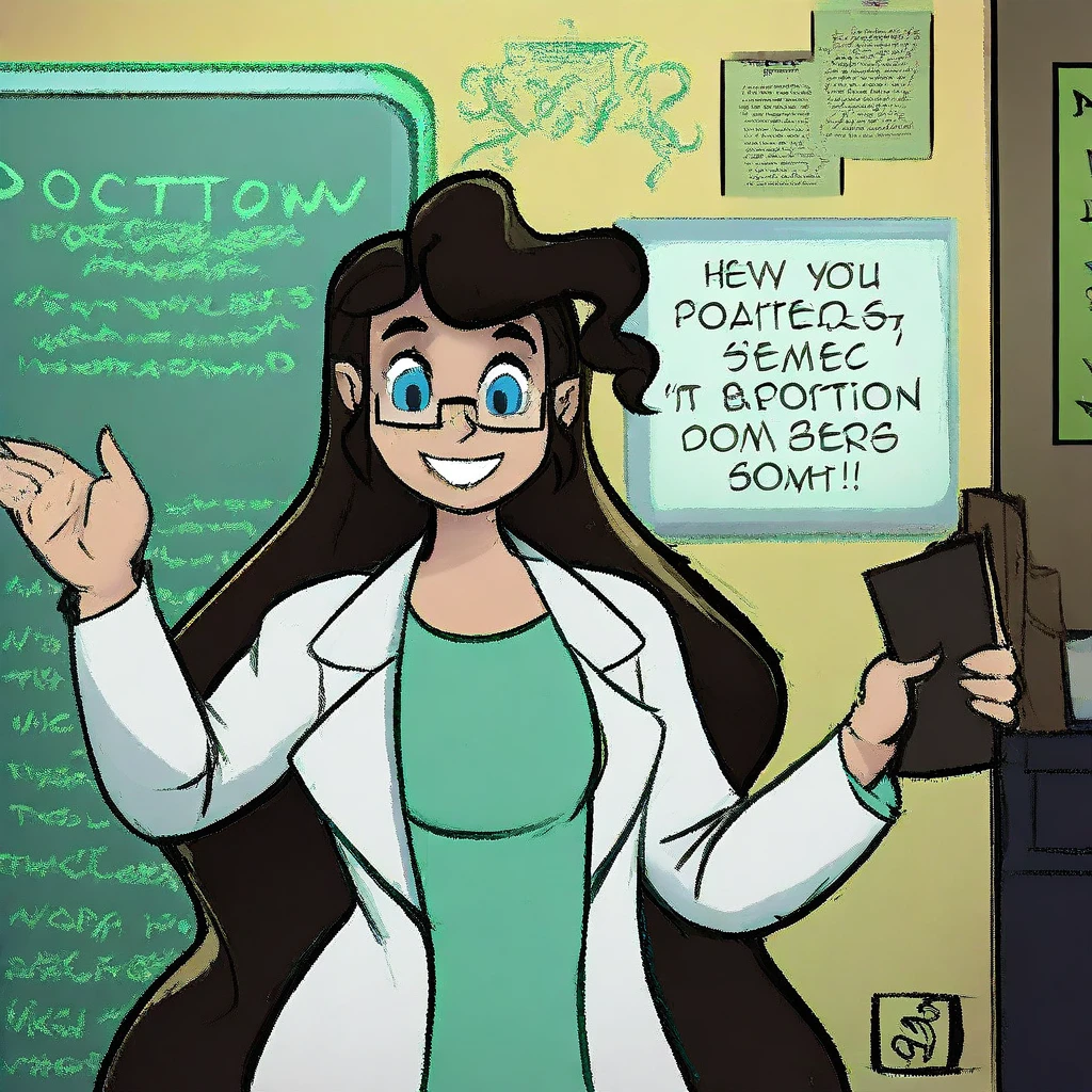 1girl, Dr davis, blue eyes, dark brown hair, very long hair, wavy hair, glasses, green dress, white lab coat, long sleeves, necklace, black shoes,