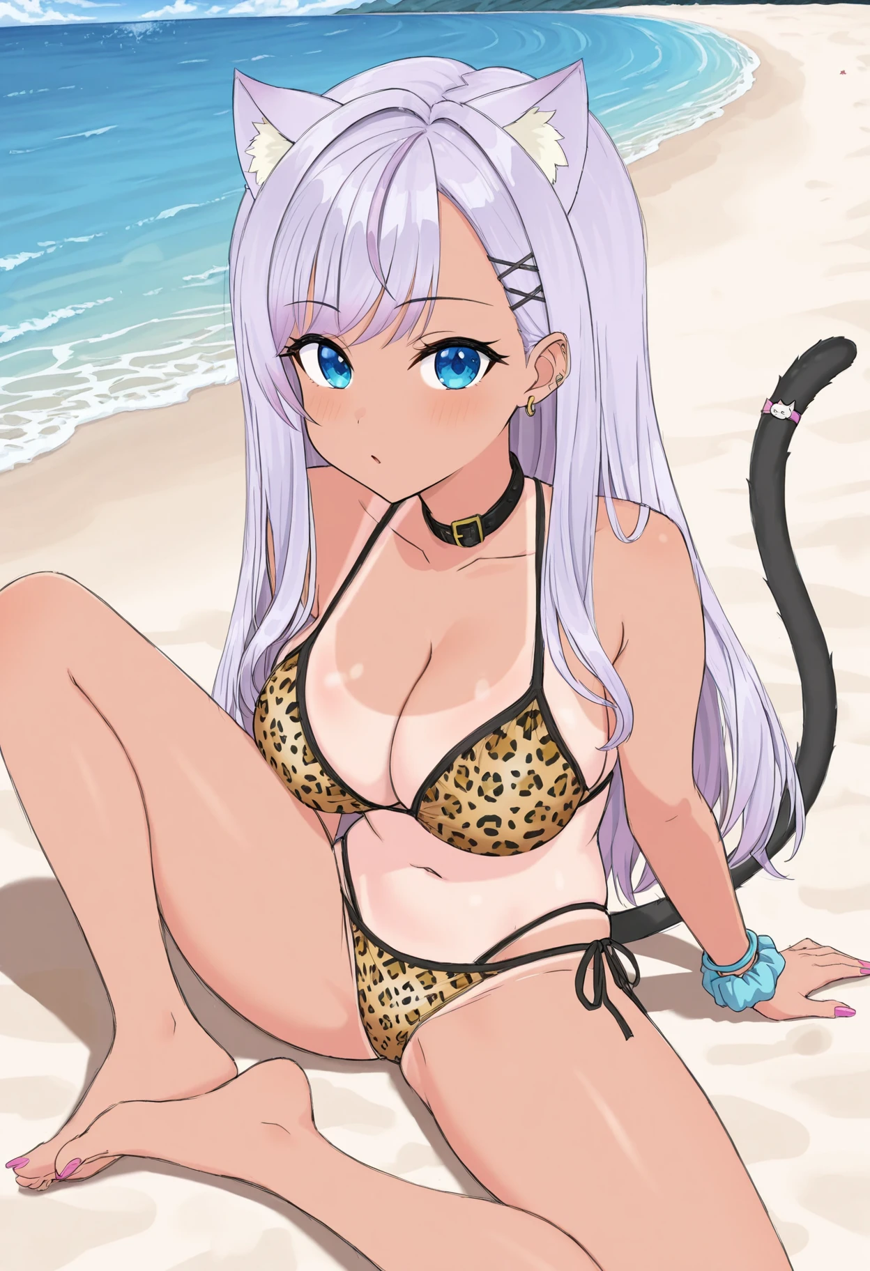 gyaru, light purple hair, cat ears, ear fluff, bangs, blue eyes, earrings, hair ornament, long hair, collar, cleavage, large breasts, dark skinned female, tan skin, tan line, leopard pattern swimsuit, bracelets, wrist scrunchie, black cat tail, cat tail ornament, thin bikini bottom, midriff, navel, bare legs, barefoot,