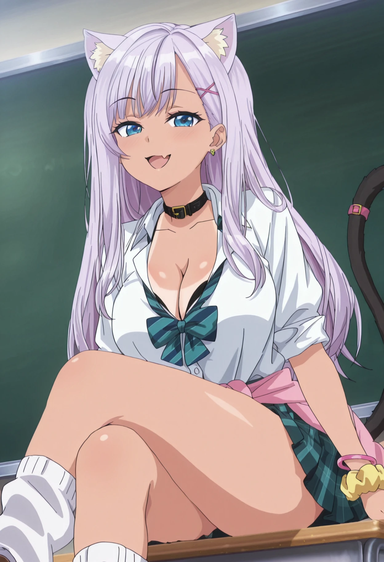 gyaru, light purple hair, cat ears, ear fluff, bangs, blue eyes, earrings, hair ornament, long hair, collar, school uniform, cleavage, large breasts, dark skinned female, tan skin, tan line, white shirt, blue bow, button up, short sleeves, sleeves rolled up, bracelets, wrist scrunchie, pink jacket tied around waist, pleated miniskirt, thighs, bare legs, baggy socks, brown shoes, black cat tail, tail ornament,