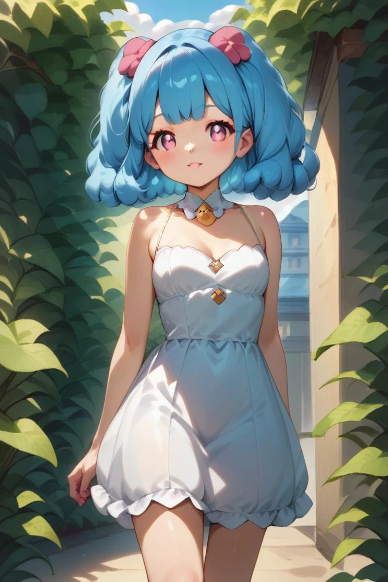 (score_9, score_8_up, score_7_up) (Cocotama Kanna:1.2) (1girl:1.1) (fluffy blue hair:1.3) (pink eyes:1.2) (human:1.1) (fluffy white dress:1.3) (gold accents:1.2) (city:1.4) (busy streets:1.4) (daytime:1.1) (cars:1.2) (street lights:1.2) (buildings:1.2) (sidewalks:1.1) (people in background:0.8)