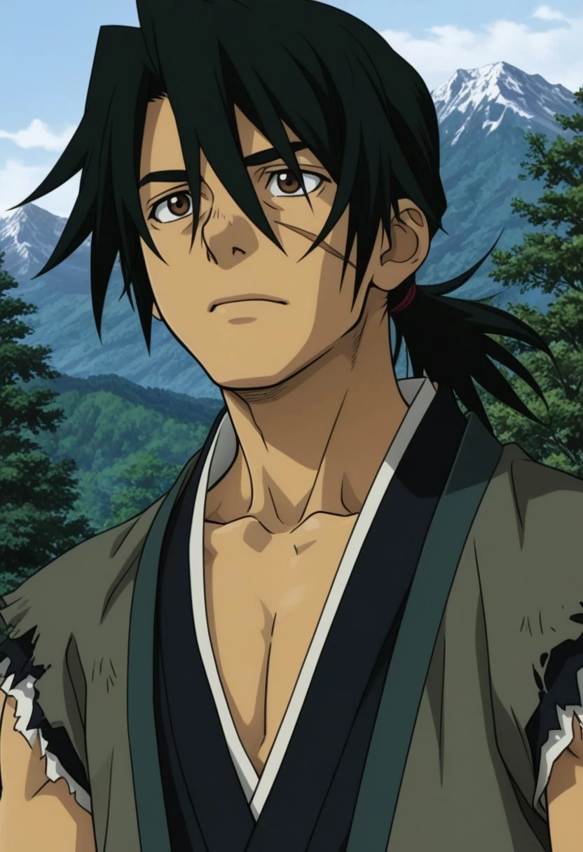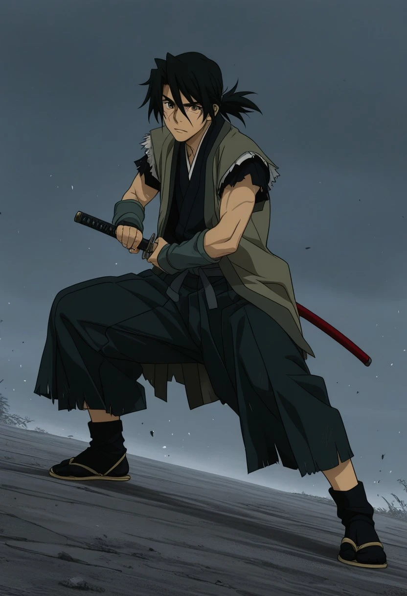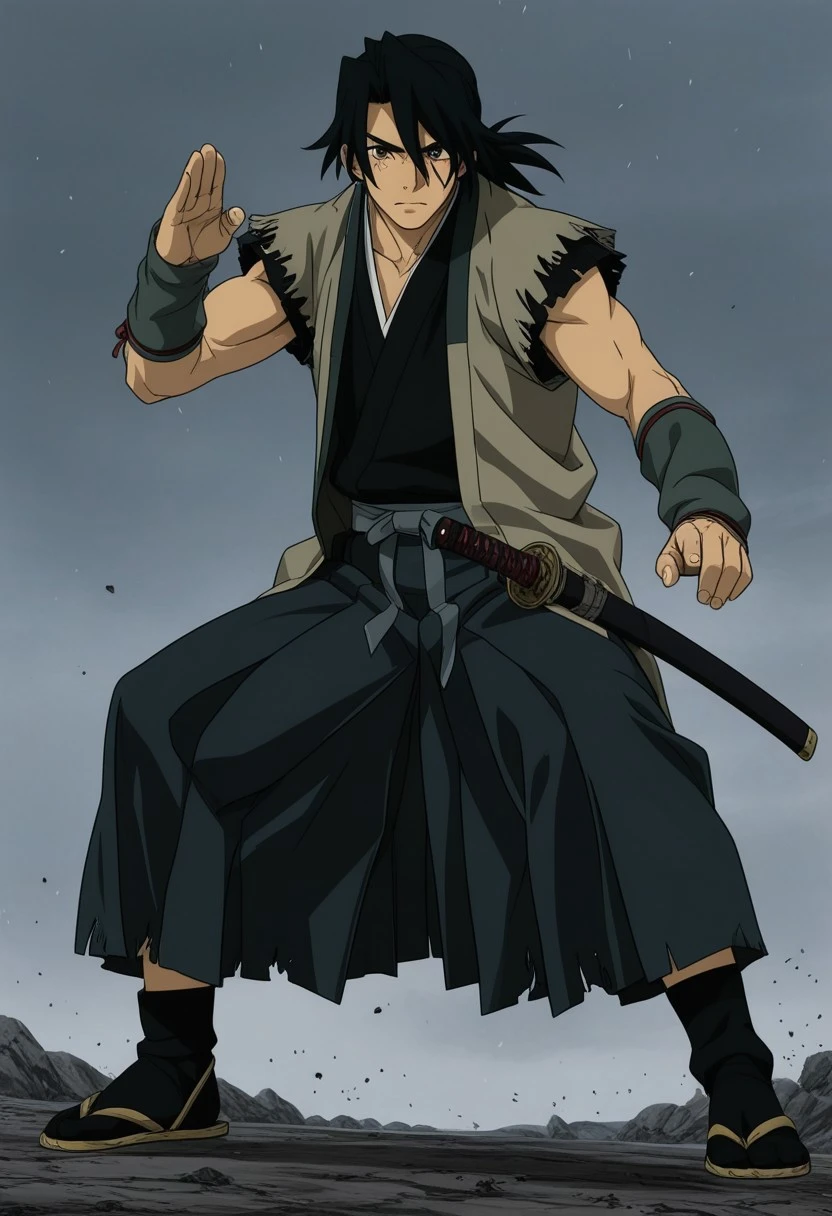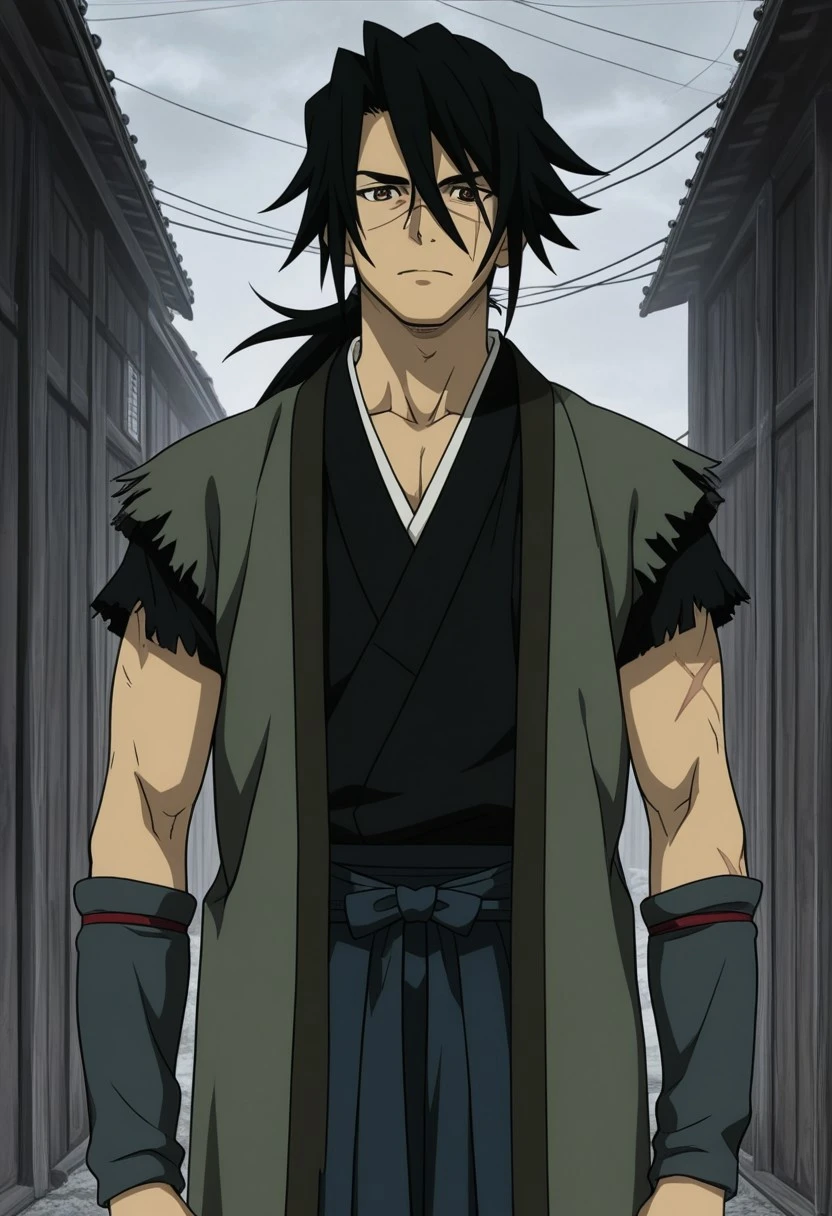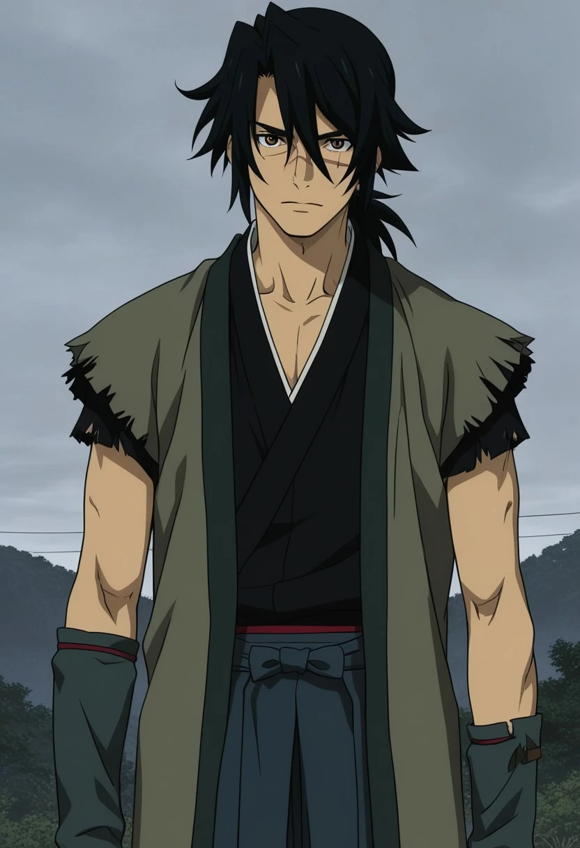 Nanashi, black hair, ponytail, brown eyes, face scar, historical Japanese clothing, black kimono, gray-brown haori, short sleeves, ripped sleeves, dark gray arm warmers, hakama, black socks, sandals