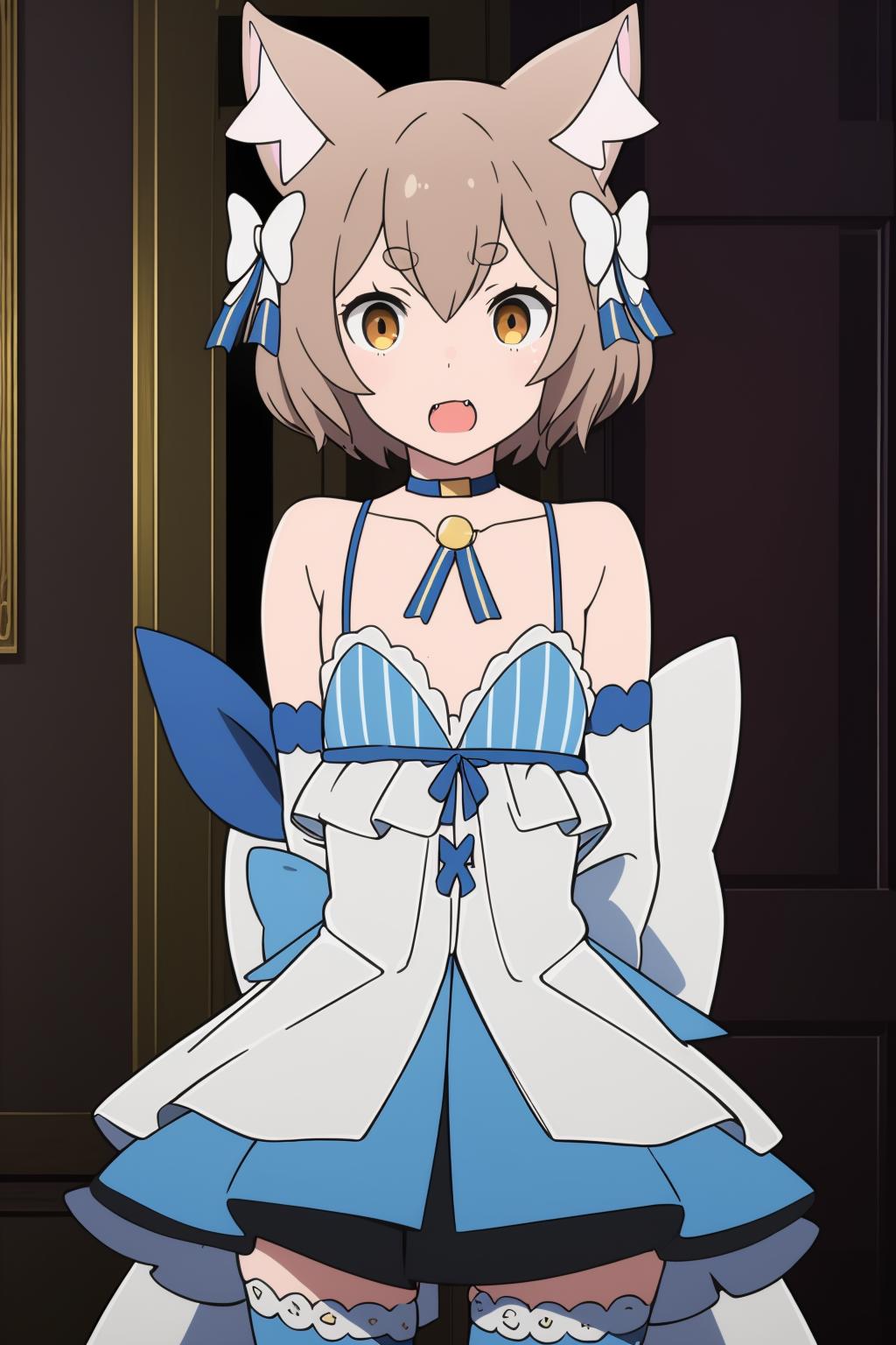 1boy,otoko no ko,animal ears,cat ears,solo,brown hair,hair bow,bangs,bob cut,short hair,brown eyes,hair between eyes,thick eyebrows,short eyebrows,fang,