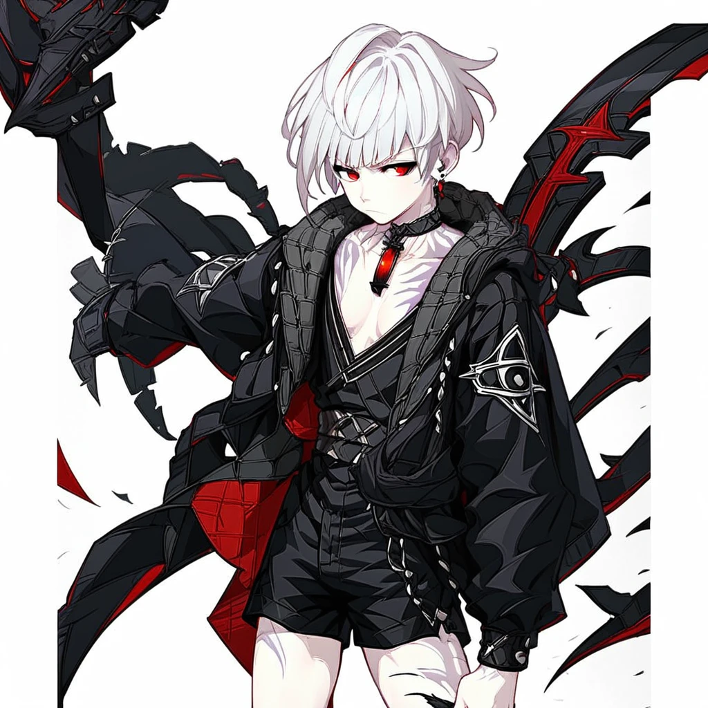 Tags (recommended): slim, white hair, short hair, red eyes, pale white skin, tattoo, black jacket with grey fur trim, black choker with red cylinder gem pendant, black low cut undershirt, short shorts, belt, cross earring,