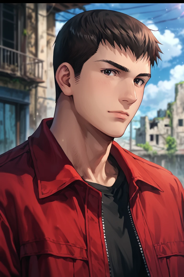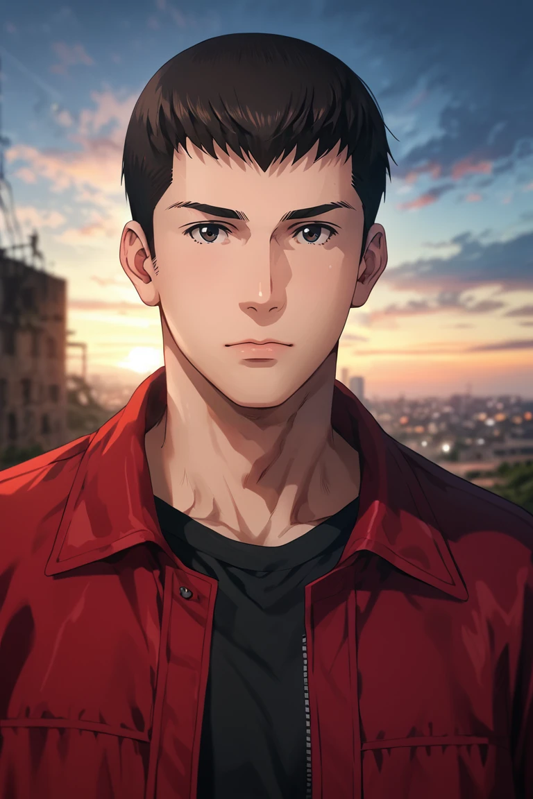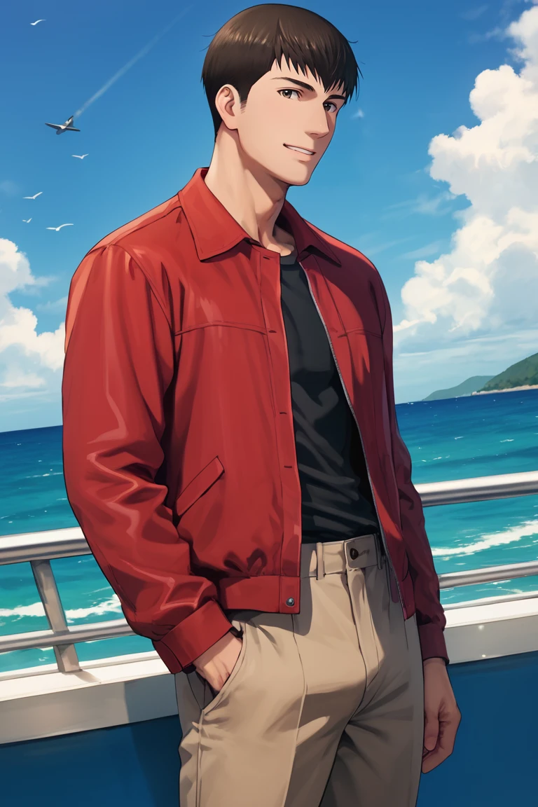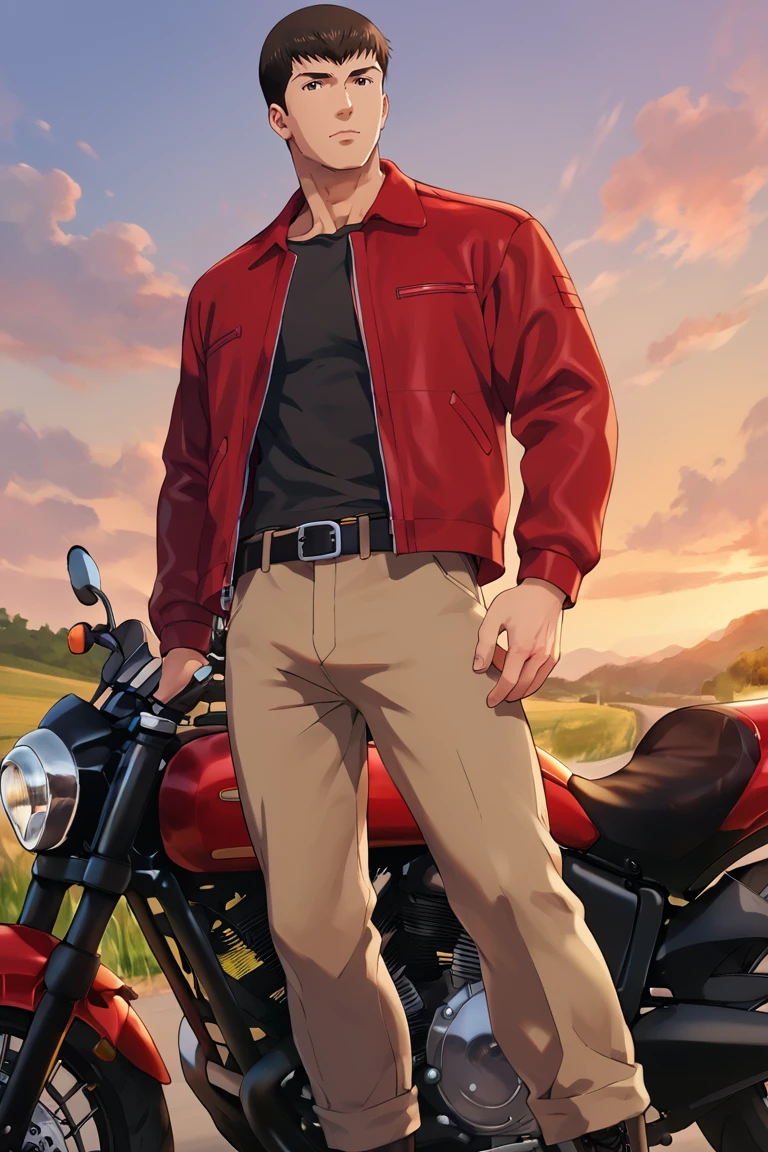 black t-shirt, red jacket, open jacket, long sleeve, brown pants, black boots