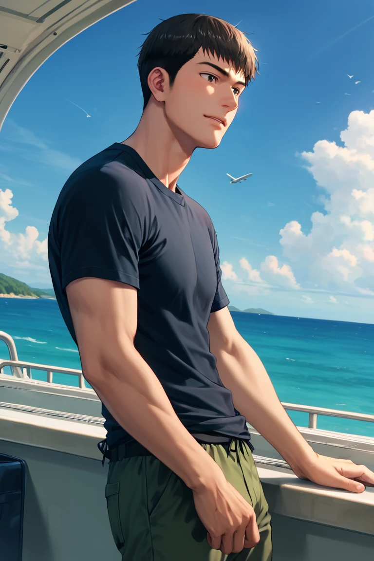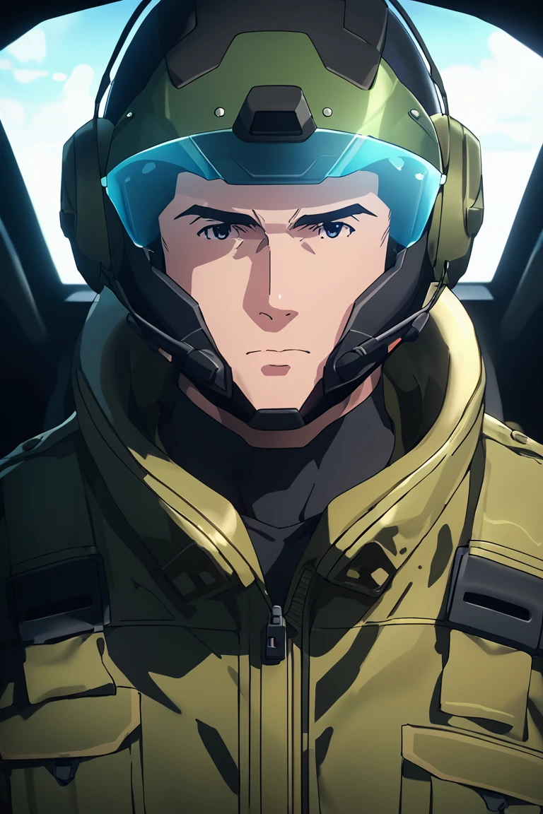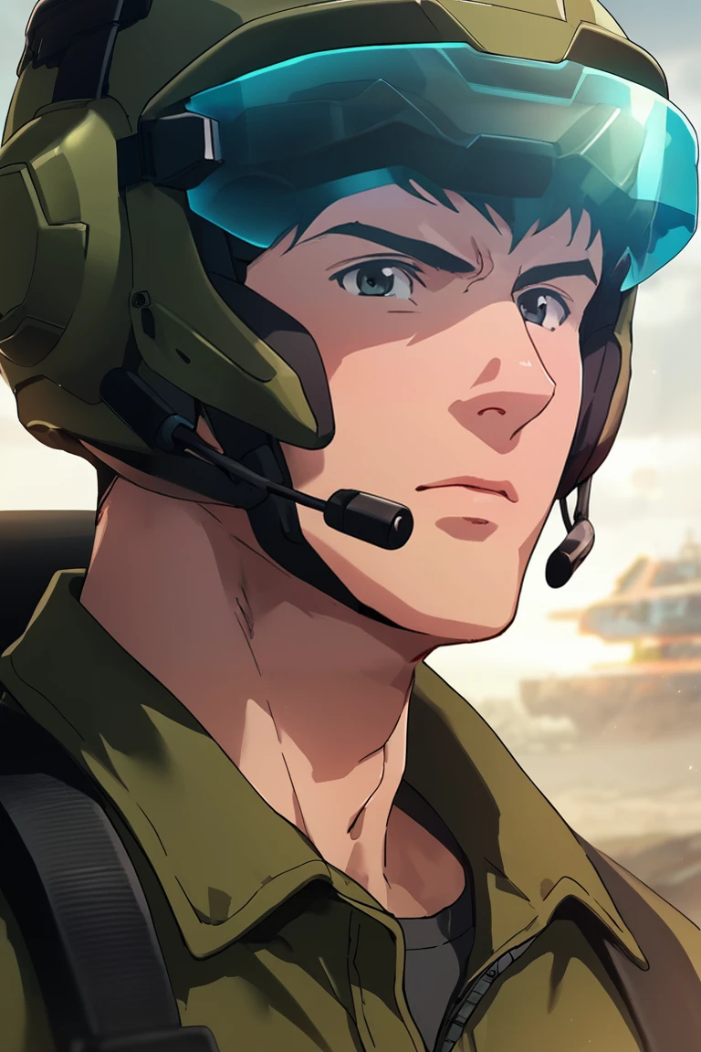 green pilot jumpsuit, black tactical vest, black pants, black neck guard, grey tactical gloves, black boots, helmet, blue visor, eyes behind visor,