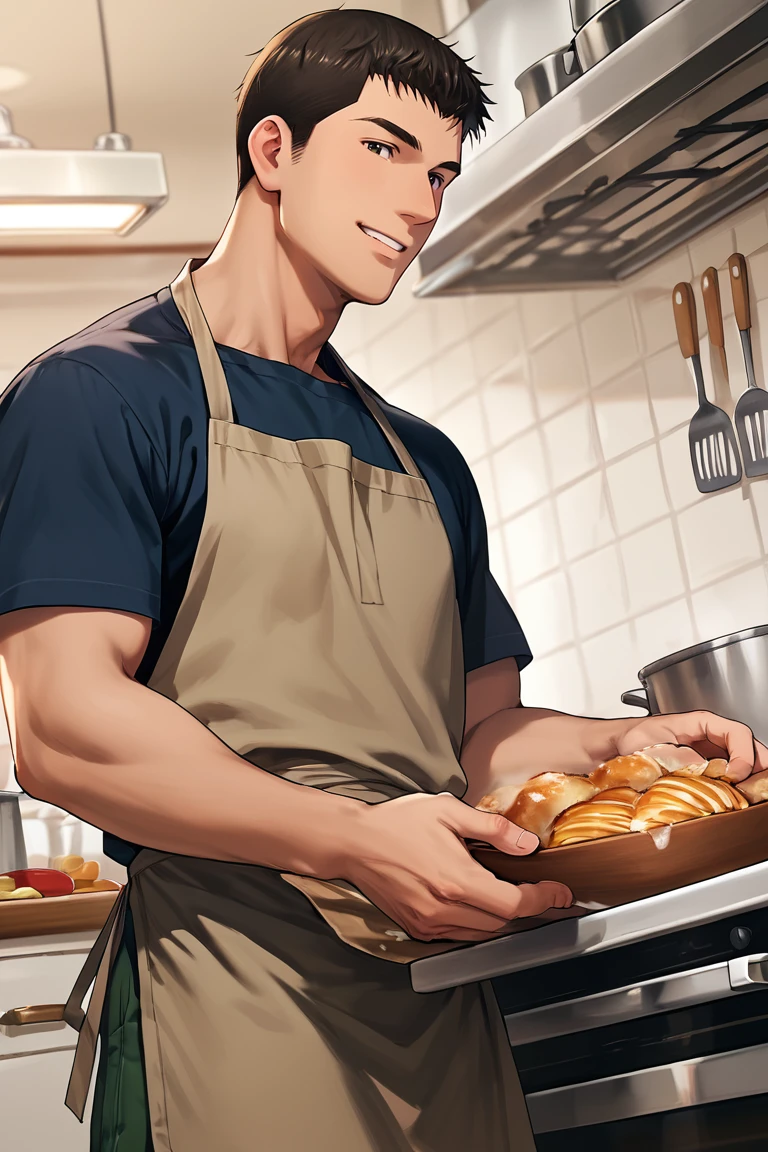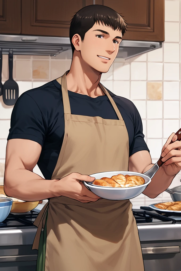 black t-shirt, short sleeves, green pants, brown apron, long apron