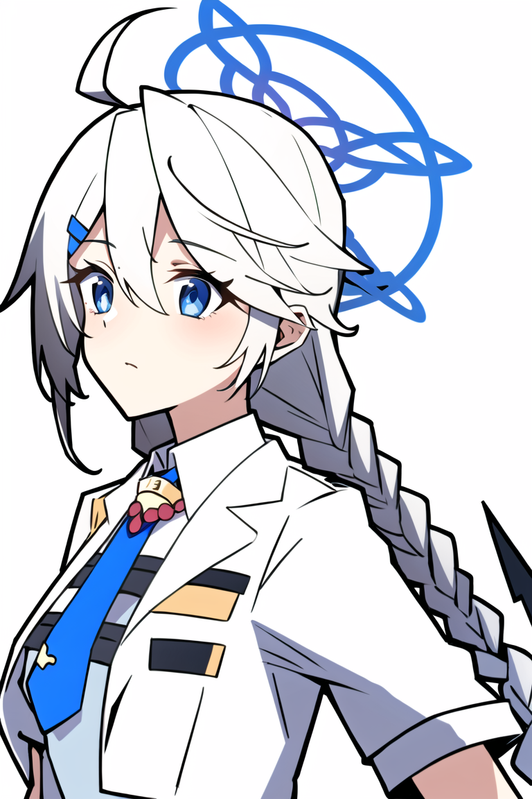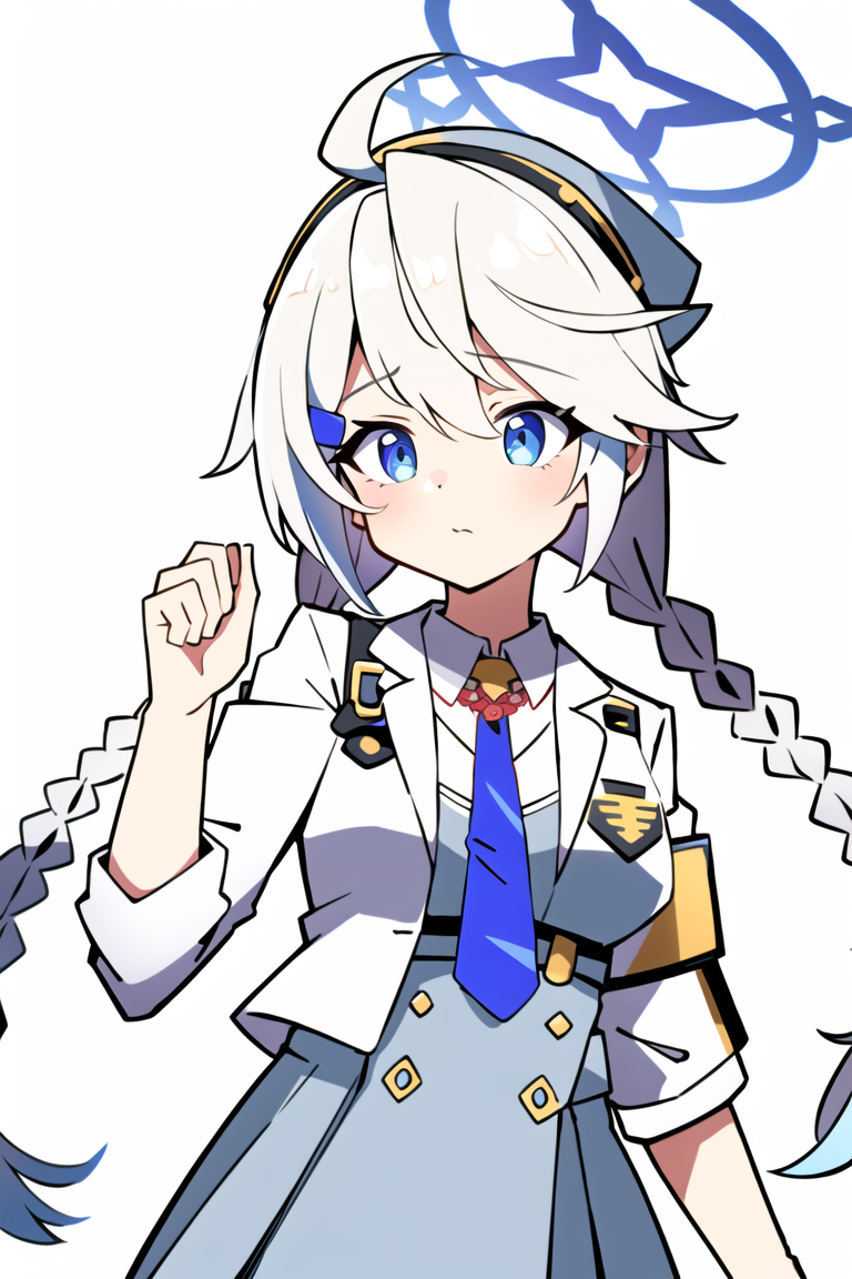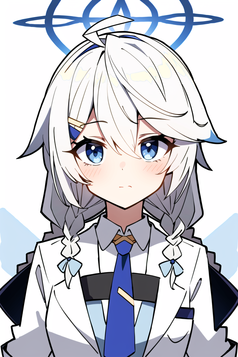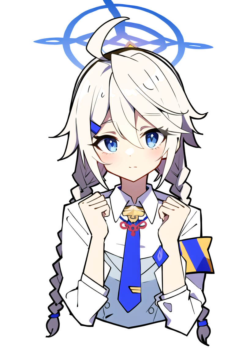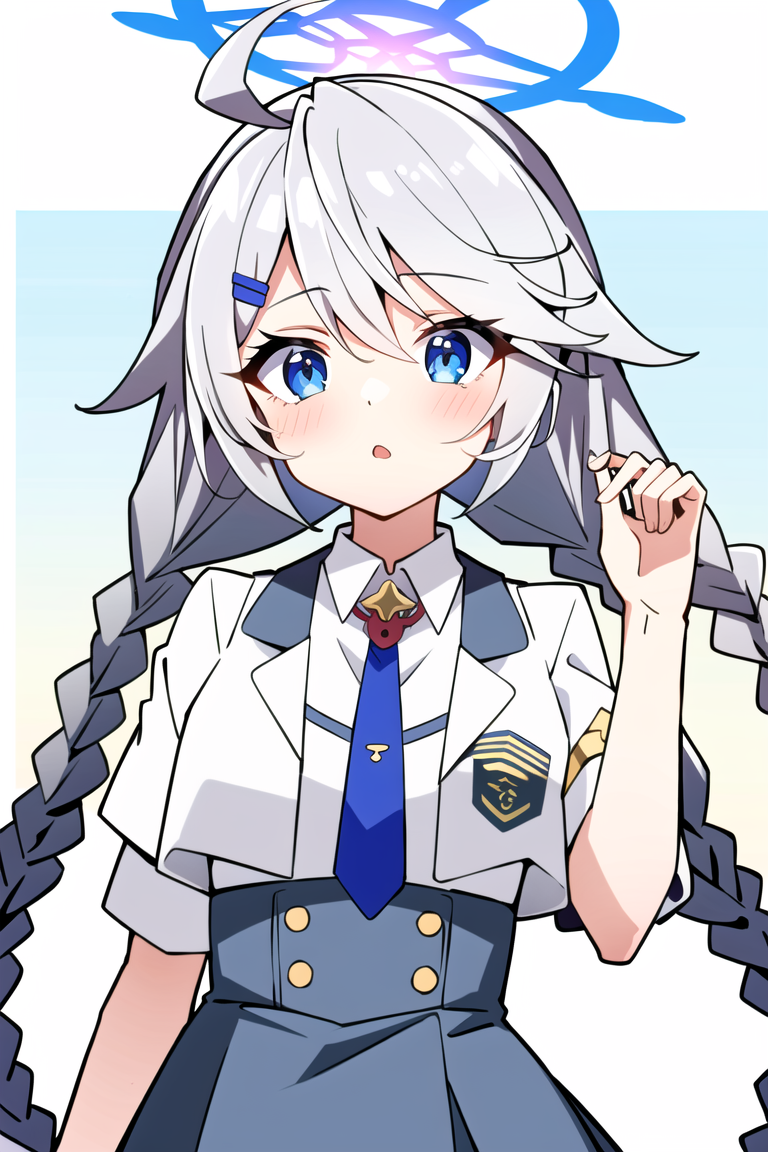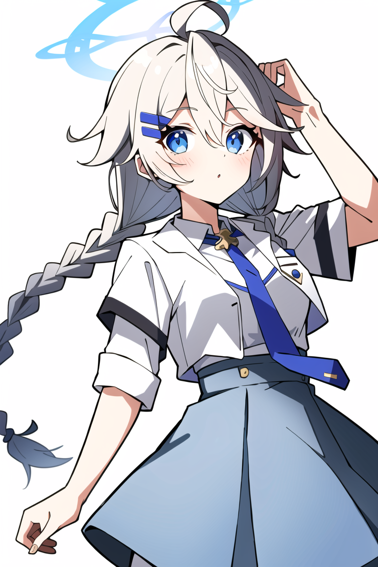 recommended prompt: nakatsukasa kirino, ahoge, hair ornament, twin braids, necktie, halo. bangs, hair between eyes, blue eyes, shirt, skirt