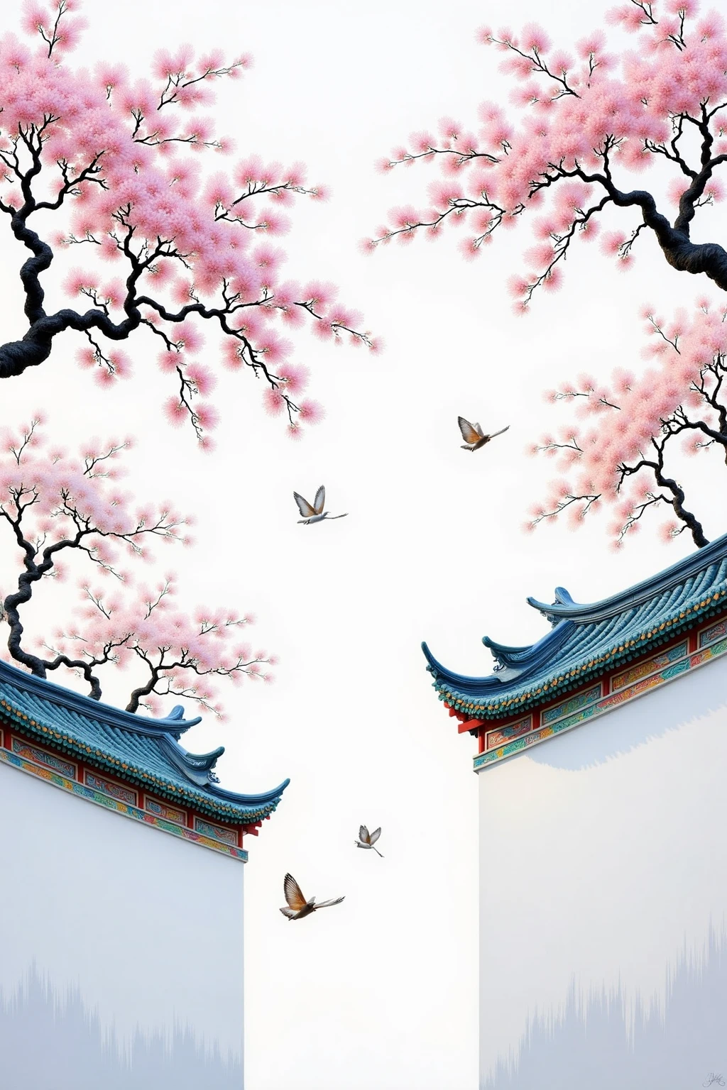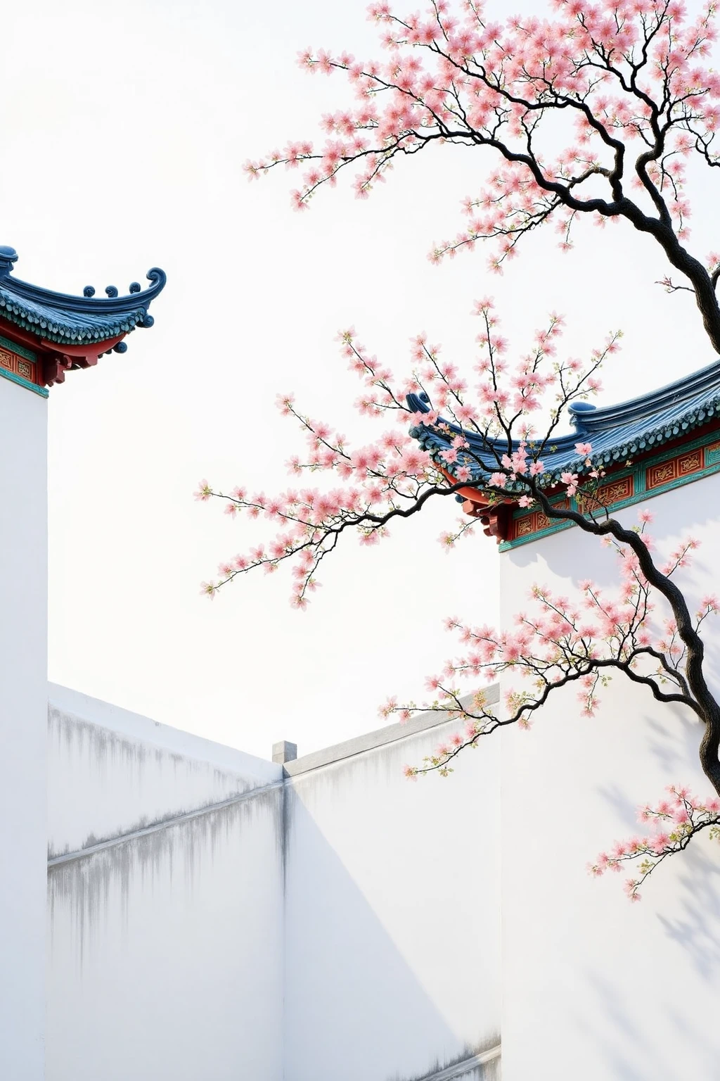 Traditional Chinese architectural elements, white walls, curved eaves, interspersed with pink cherry blossoms, showing a poetic spring.