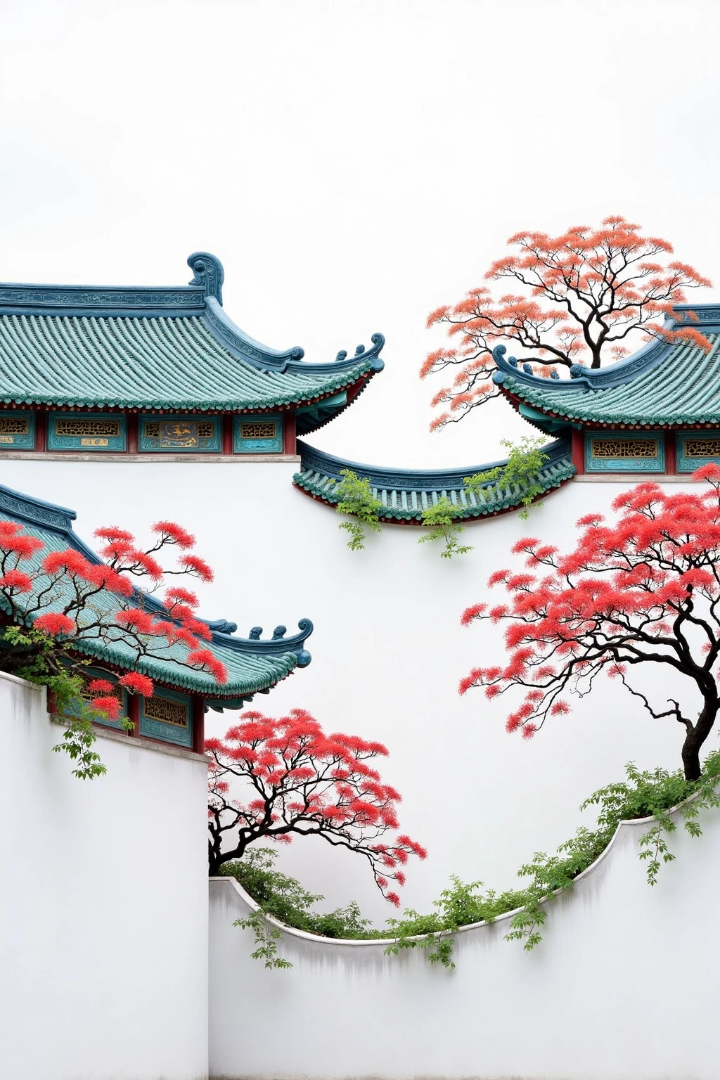 Traditional Chinese architectural elements, white walls, green - blue roofs, red - flowered trees, highlighting the ancient charm.