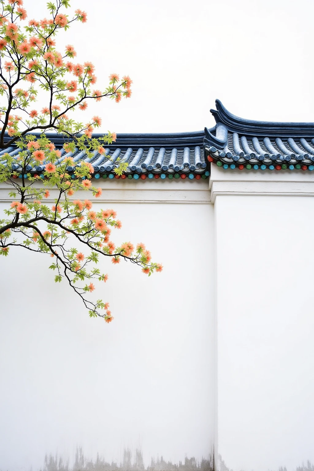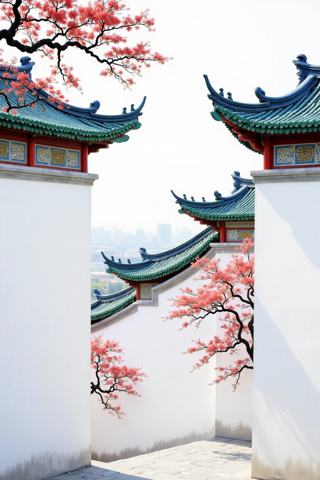 Traditional Chinese architectural elements, white walls, blue - green roofs, with red - blossom branches, creating a vivid ancient - style view.