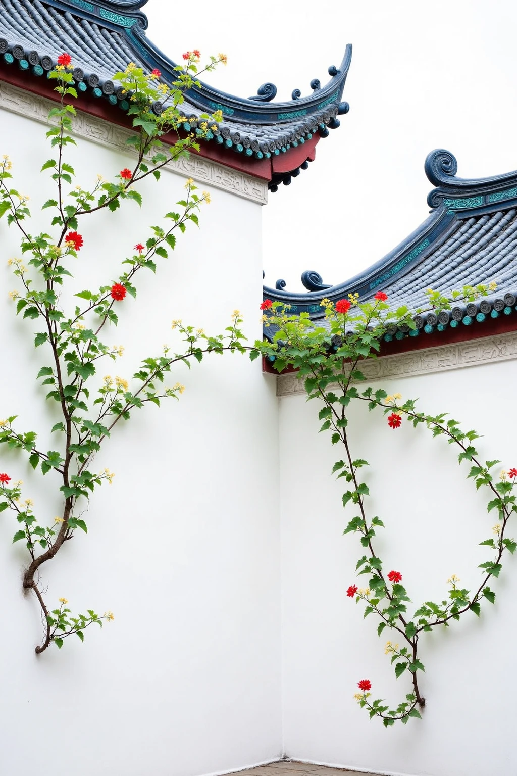 Traditional Chinese architectural elements, white walls, green vines climbing, red flowers blooming, full of natural vitality.