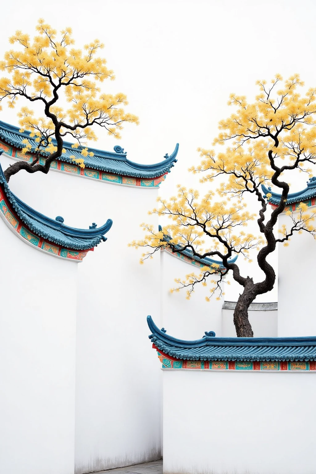 Traditional Chinese architectural elements, white walls, blue roofs, with ginkgo trees, golden leaves adding autumn charm.