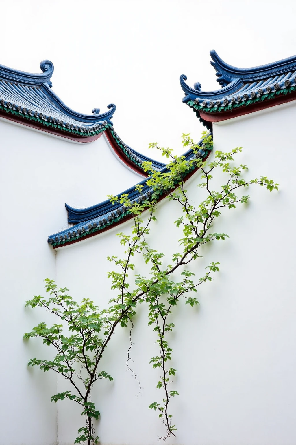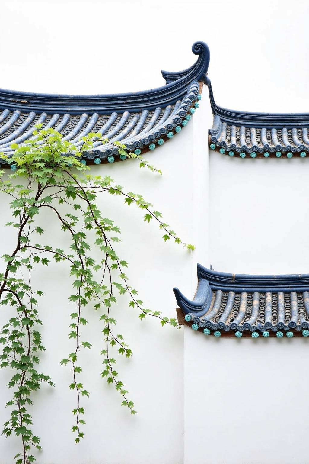 Traditional Chinese architectural elements, white walls, blue roofs, ivy winding, showing the beauty of integration.