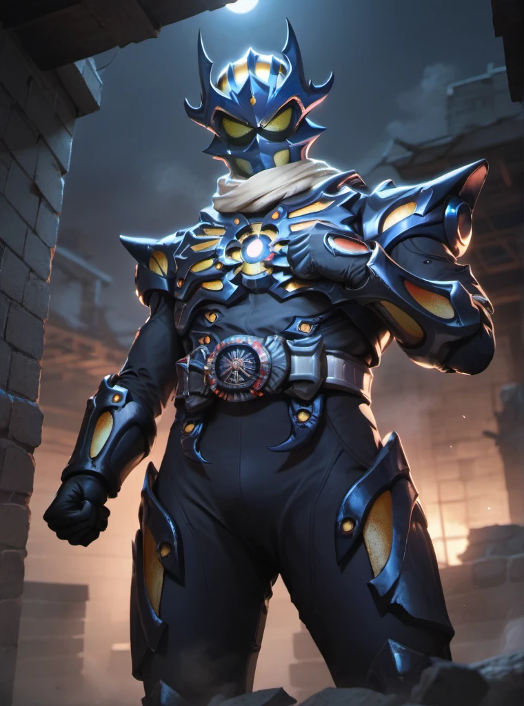 Recommended prompt: kamenriderdread, dark blue armor, dark blue helmet, yellow eyes, white scarf, rider belt