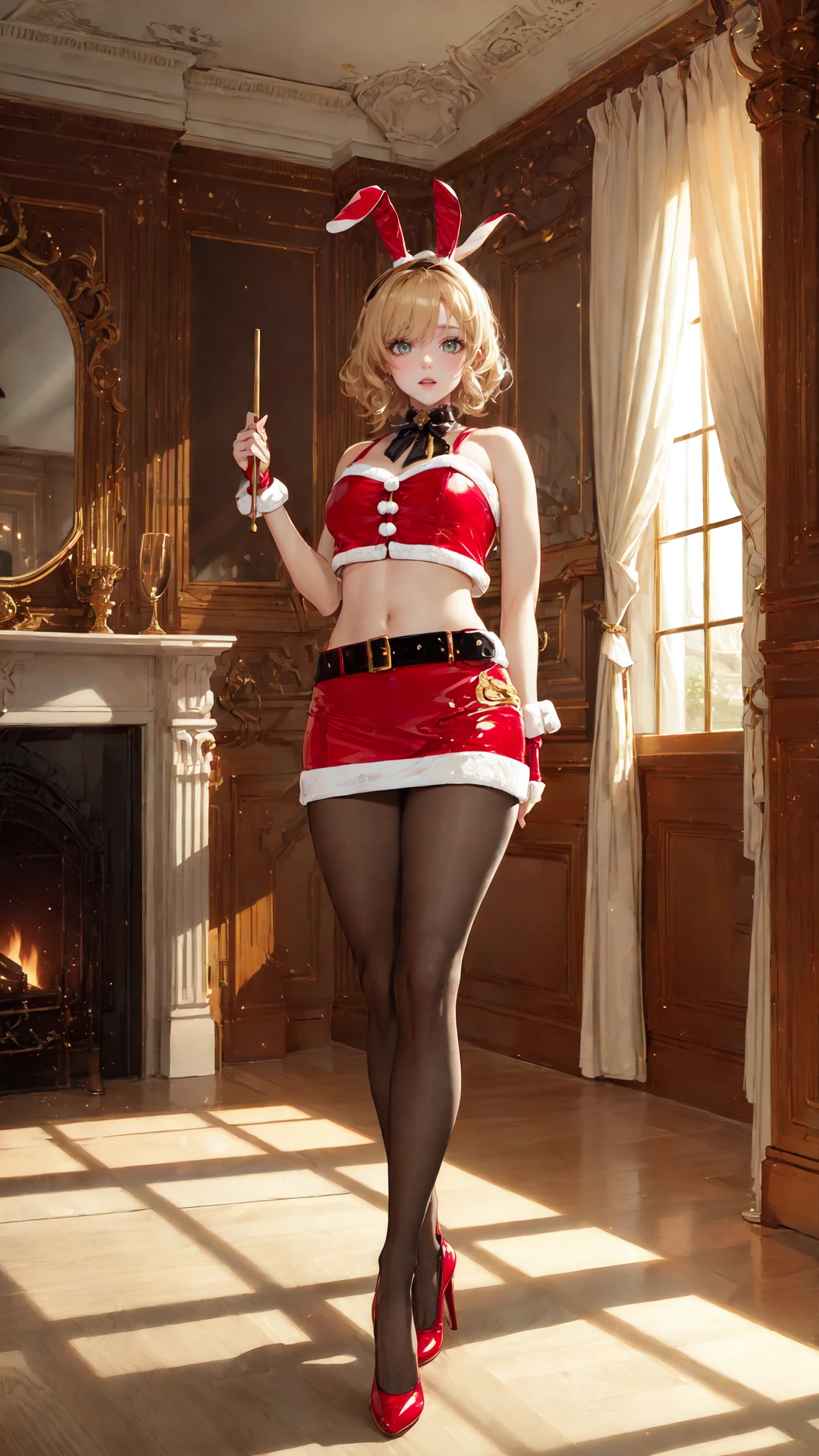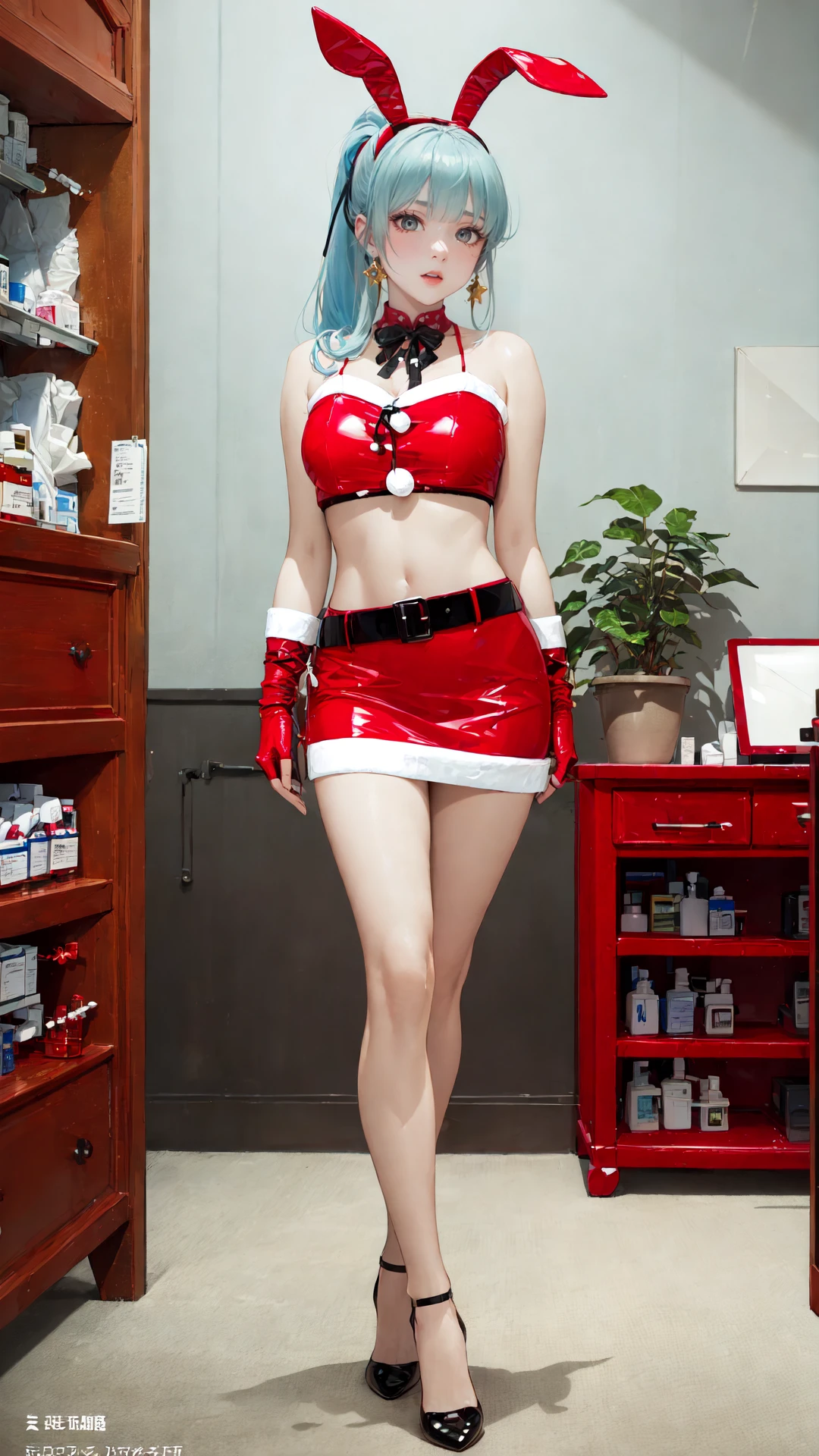 tutututu, bare shoulders, belt, crop top, red pencil skirt, miniskirt,christmas_dress,fur trim, red fingerless gloves, midriff, santa costume, rabbit tail, rabbit ears, fake animal ears,