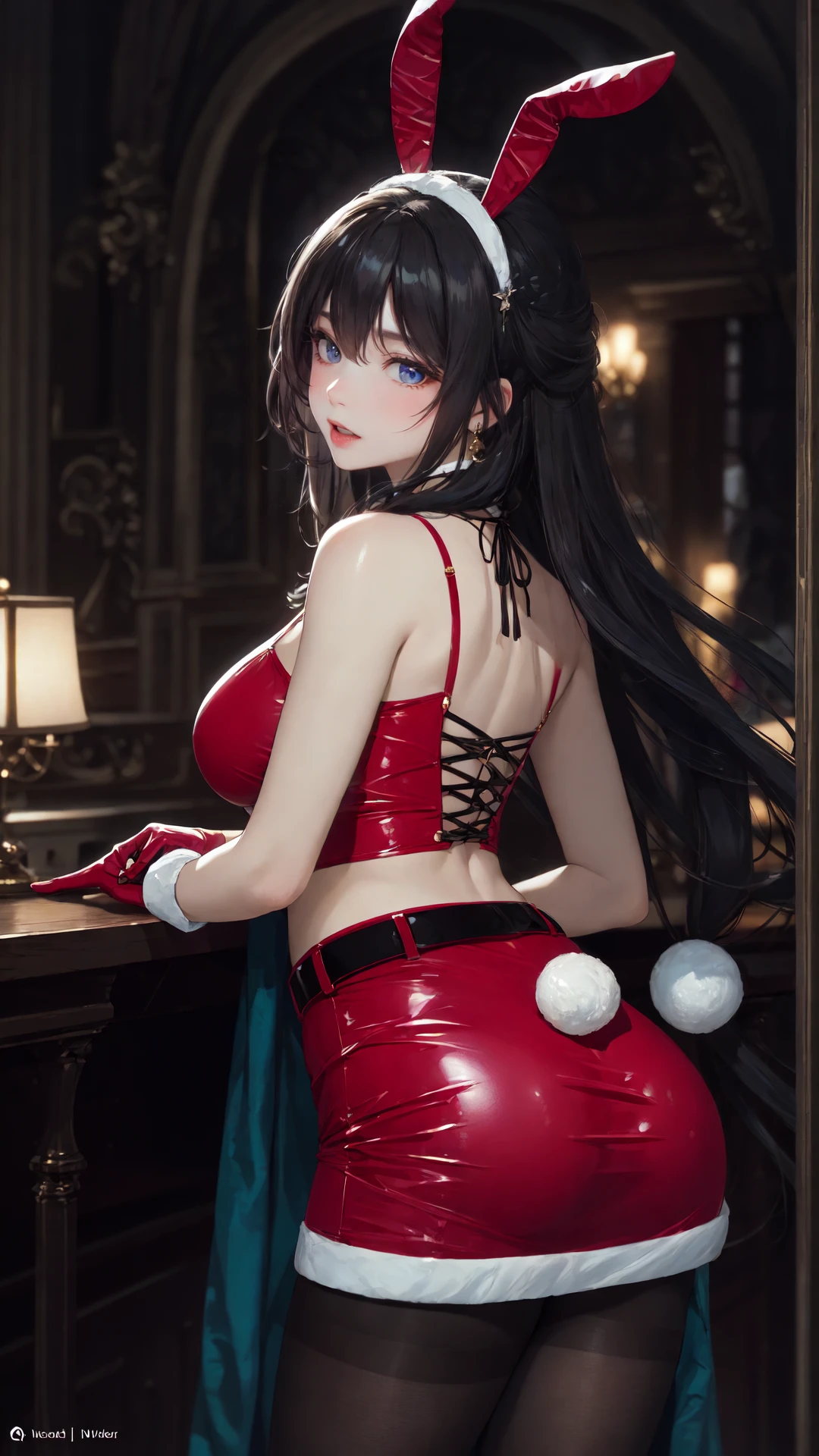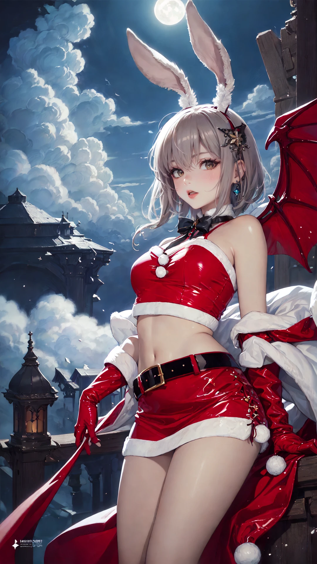 4、触发词为:tutututu, bare shoulders, belt, crop top, red pencil skirt, miniskirt,christmas_dress,fur trim, red fingerless gloves, midriff, santa costume, rabbit tail, rabbit ears, fake animal ears,,