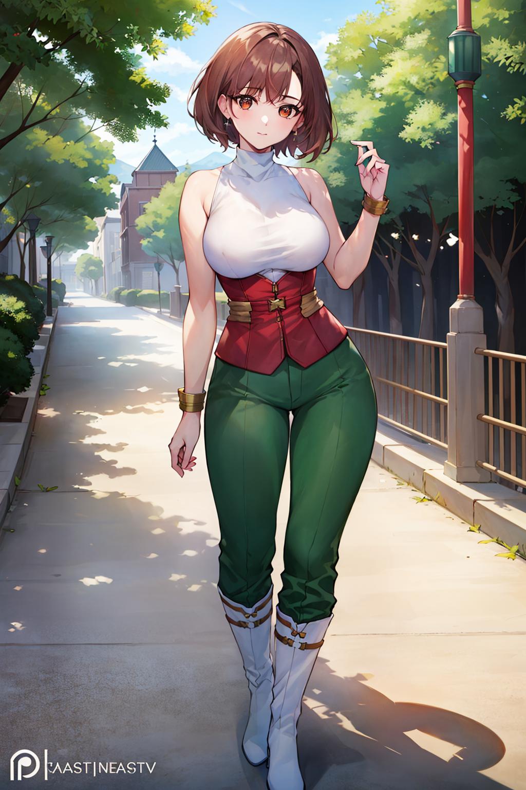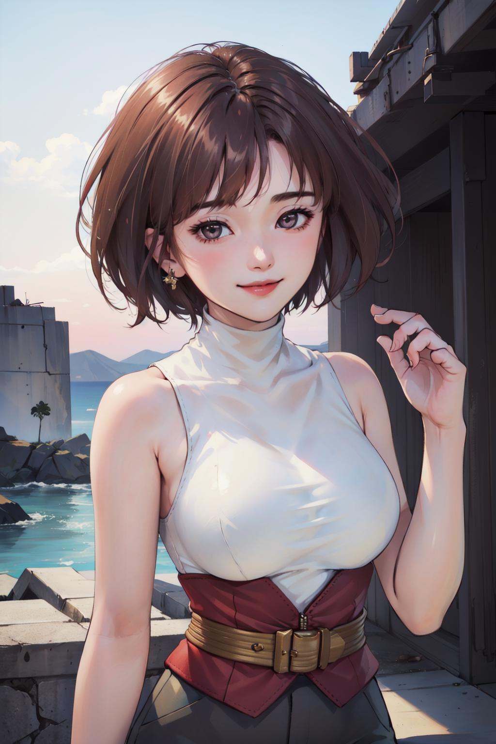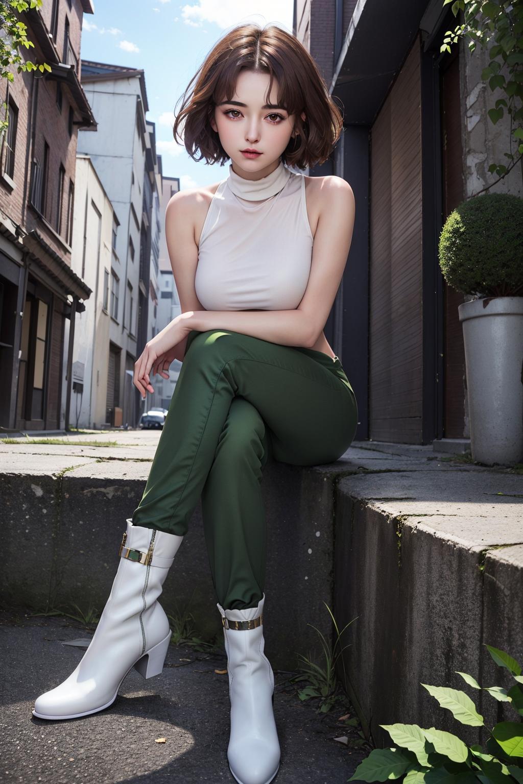 short hair, breasts, pants, sleeveless,brown hair, sleeveless, closed mouth, bare shoulders, white turtleneck,toned,