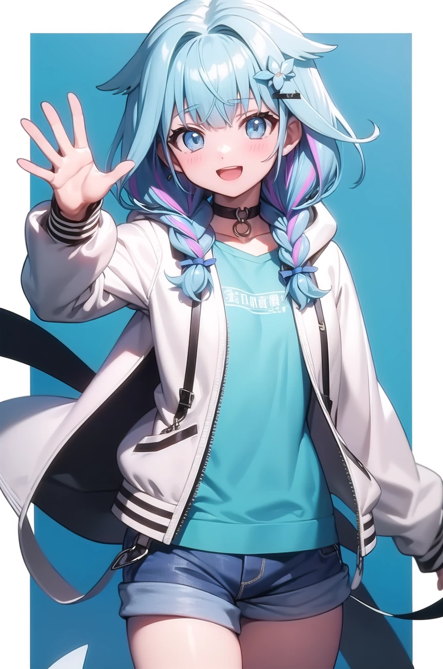 Prompt : mizumiya su, twin braids, hair ornament, choker, white jacket, long sleeves, hood, blue shirt, shorts