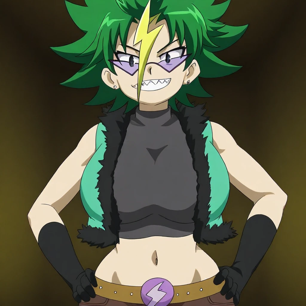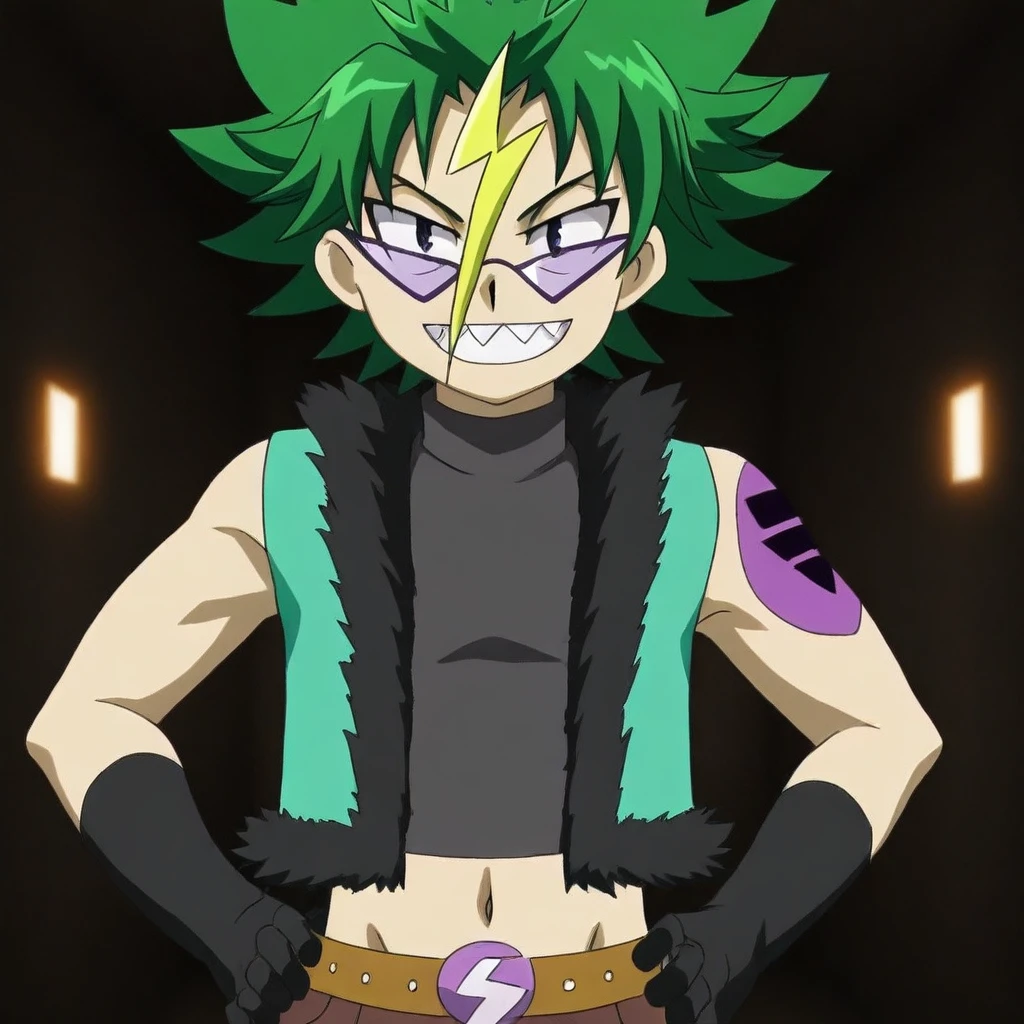 1boy, male focus, solo, upper body, Silas Karlise, Beyblade Burst, Beyblade Burst Style, Green spiky hair, medium hair, yellow Ahoge, Thunder shaped Ahoge, brown eyes, triangular Sunglasses, purple glasses, Green Fur Vest, black tank top, turtleneck, navel, midriff, ???? arms, long black Gloves, brown Belt, dark brown pants, standing, indoors, detailed face, detailed hands, perfect hands, 5 fingers, anime style, sharp teeth, smile, high resolution, 4k, Anime, looking at viewer, front view, close up, hands on ????, fit male, adult male